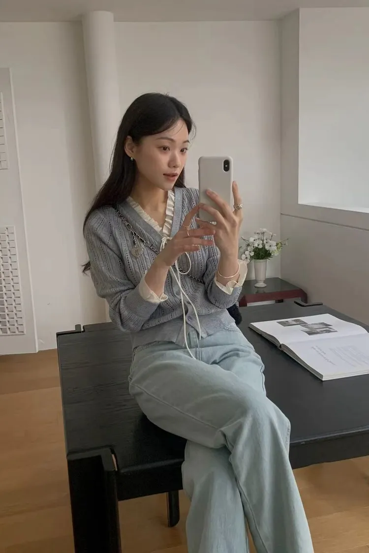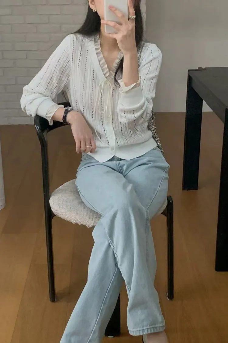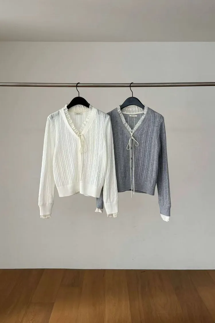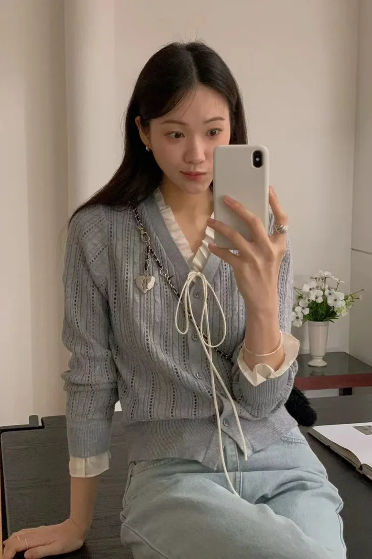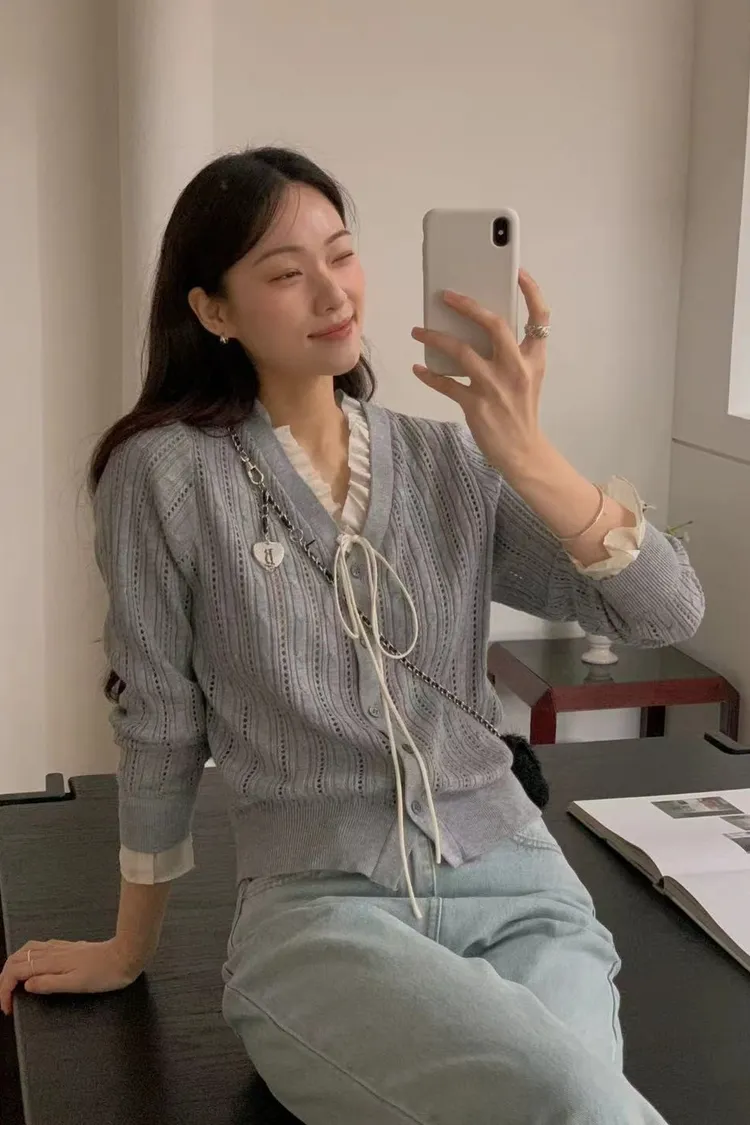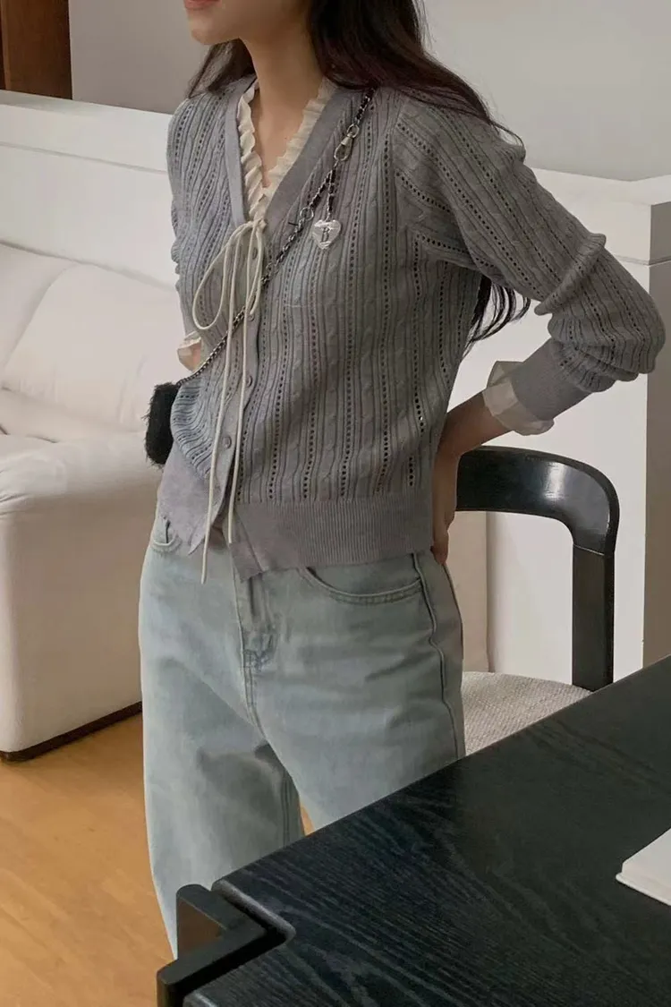 韓國代購 DRESS ROOM 春季新款 V領鏤空針織開衫