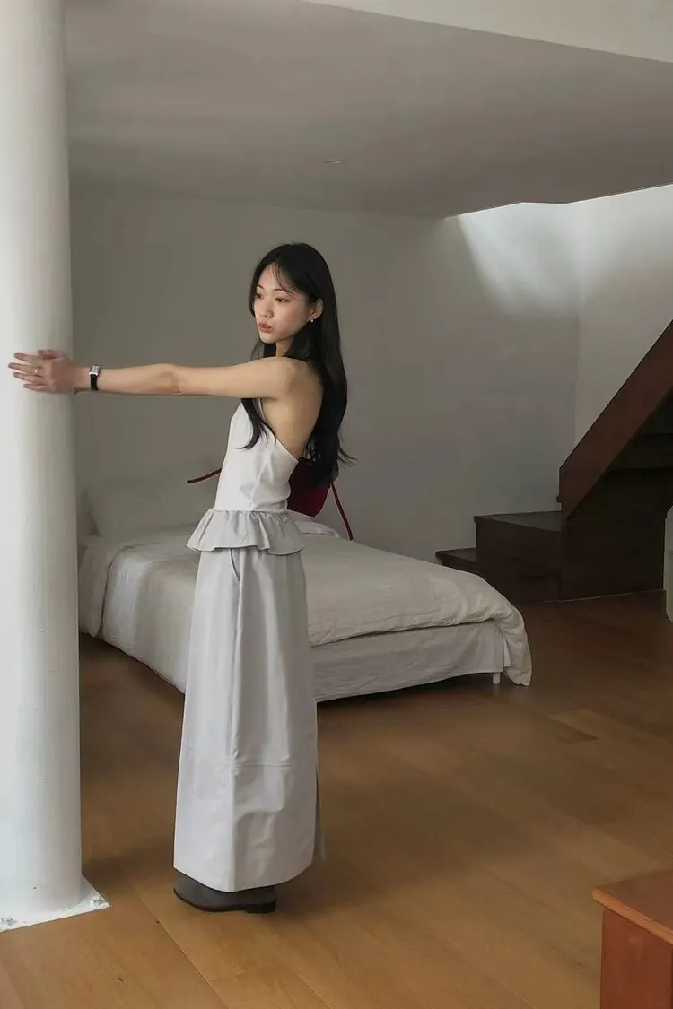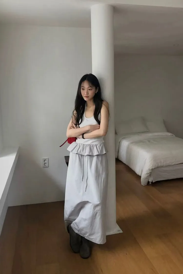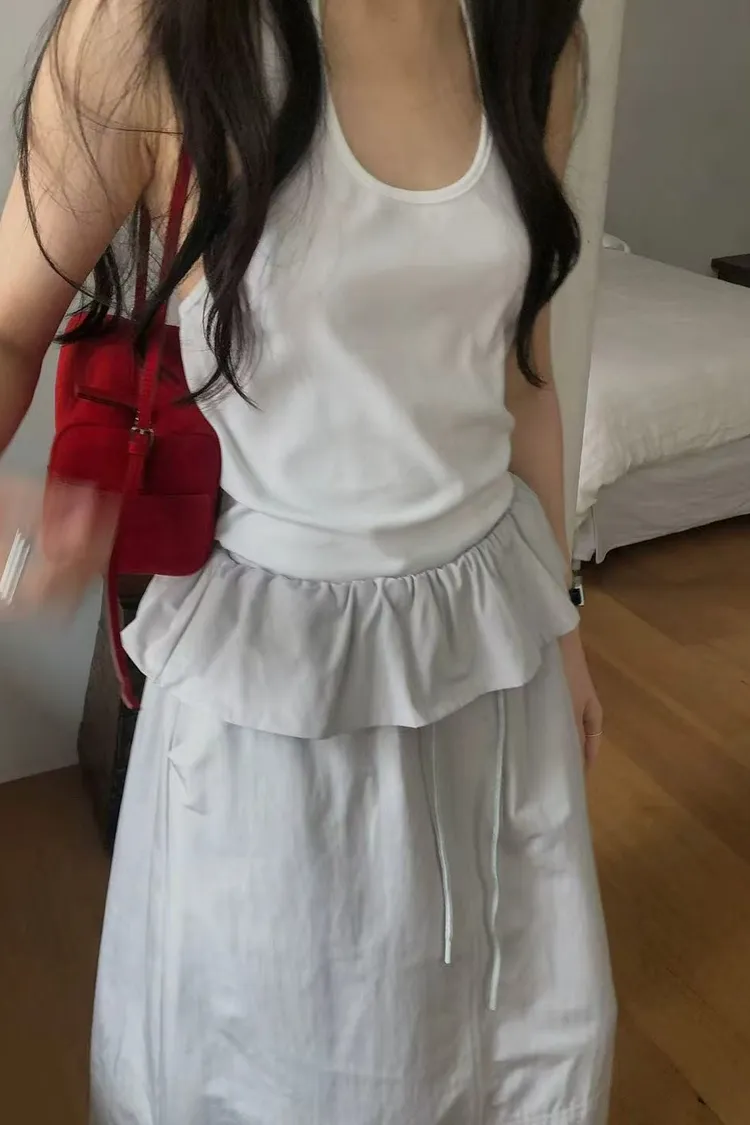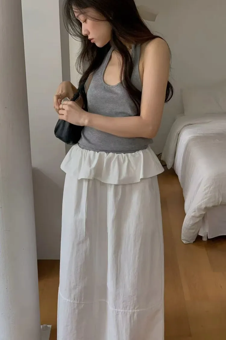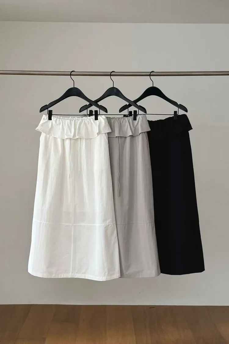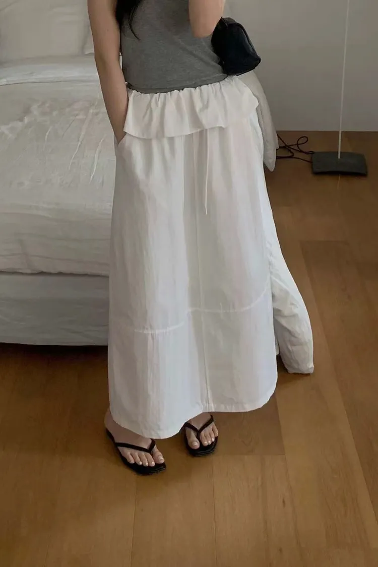 韓國代購 DRESS ROOM 設計感荷葉邊 鬆緊腰綁帶長裙 氣質長裙