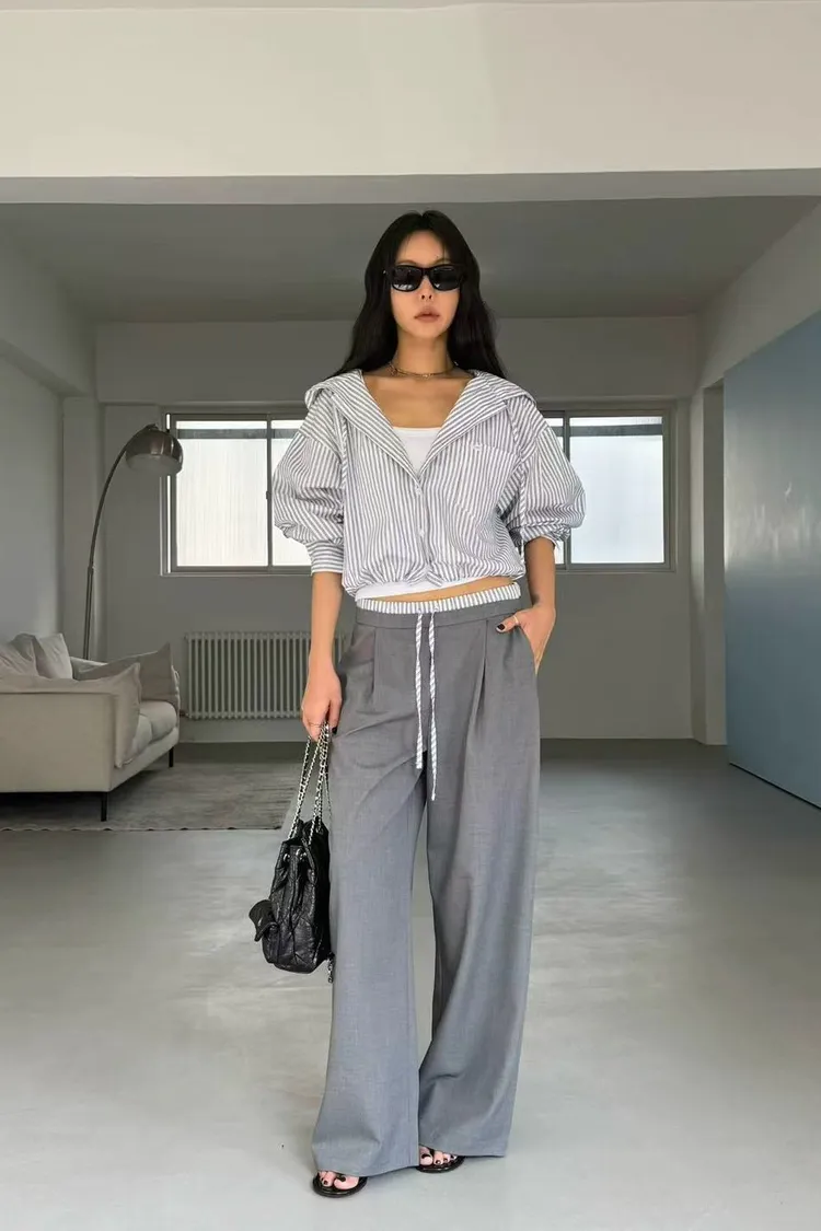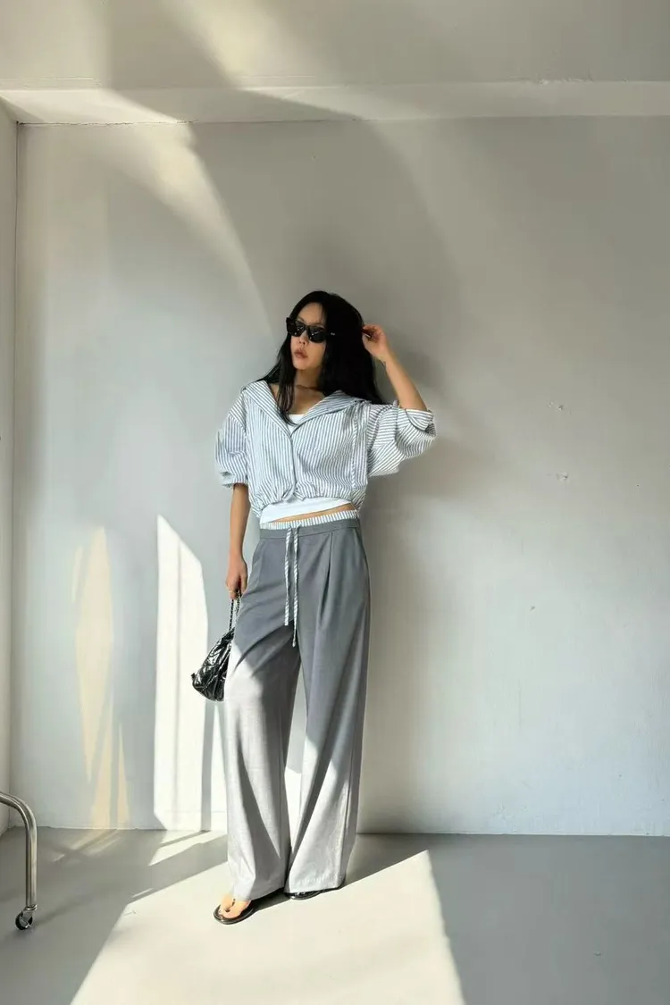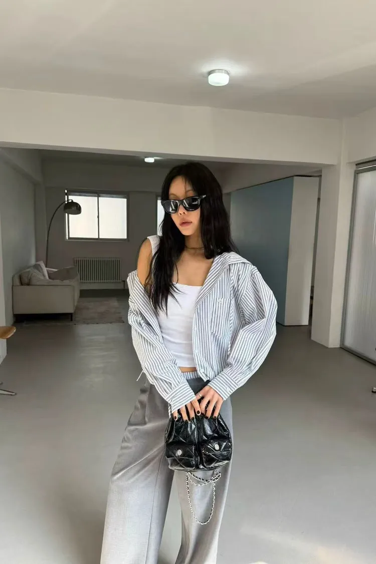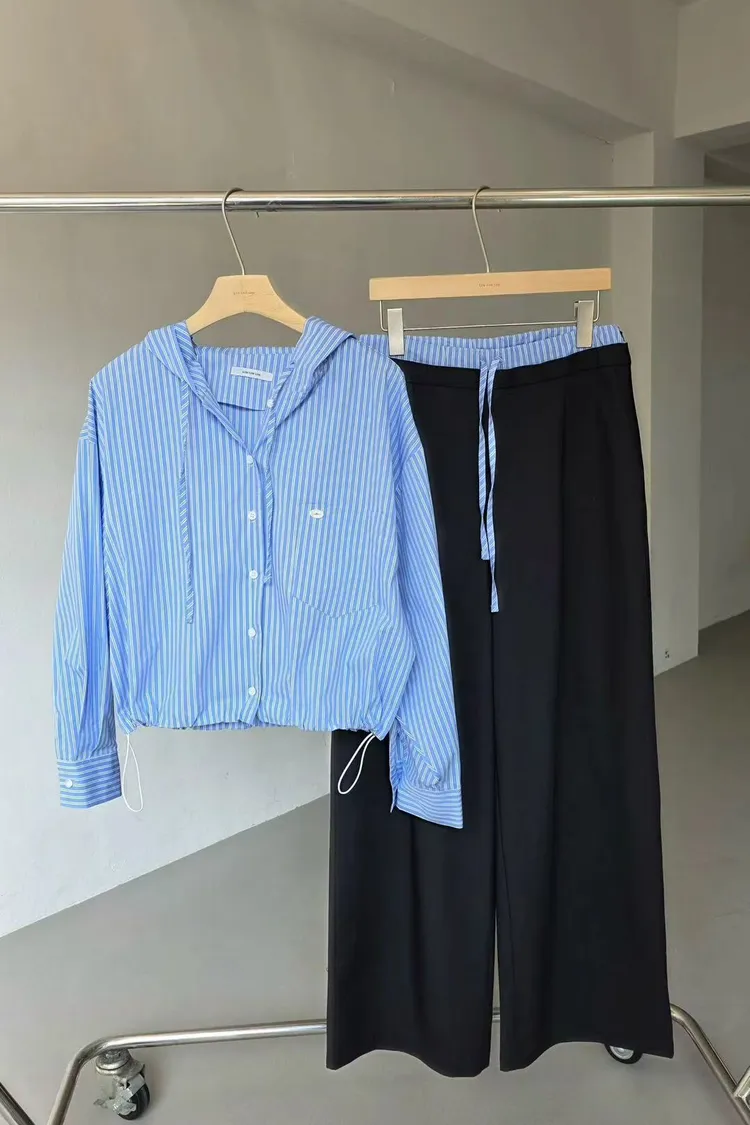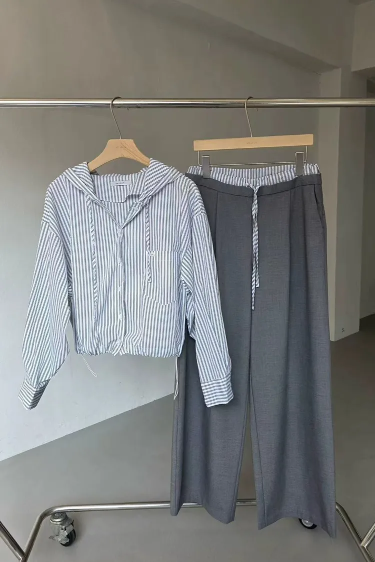 韓國代購 連帽條紋休閒襯衫上衣 休閒拼接條紋長褲 休閒套裝
