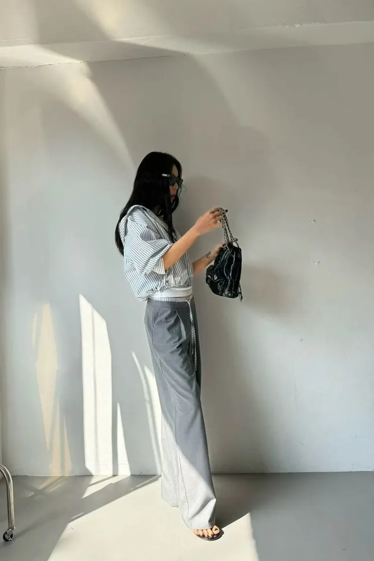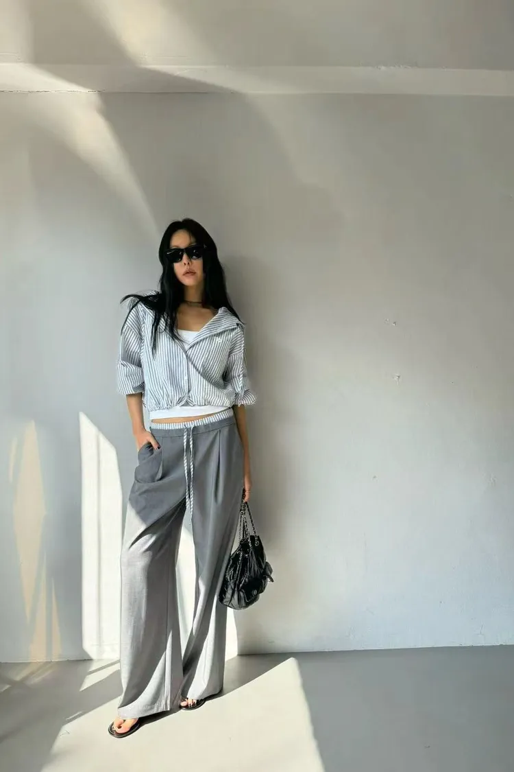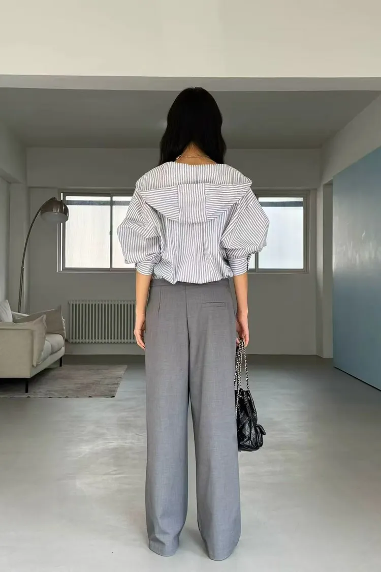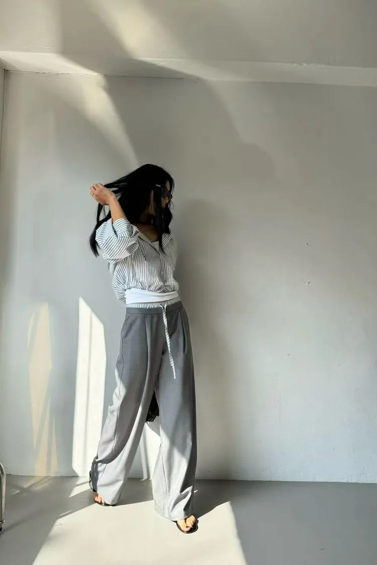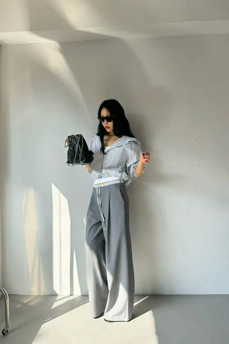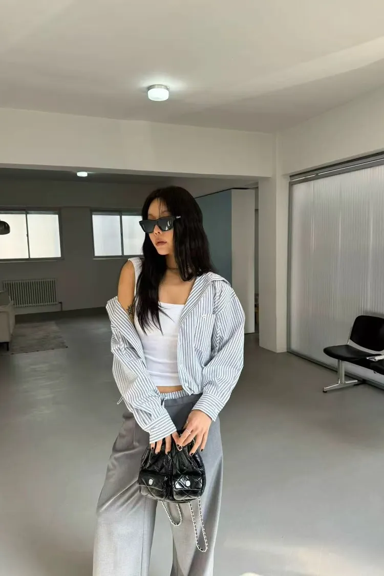 韓國代購 連帽條紋休閒襯衫上衣 休閒拼接條紋長褲 休閒套裝