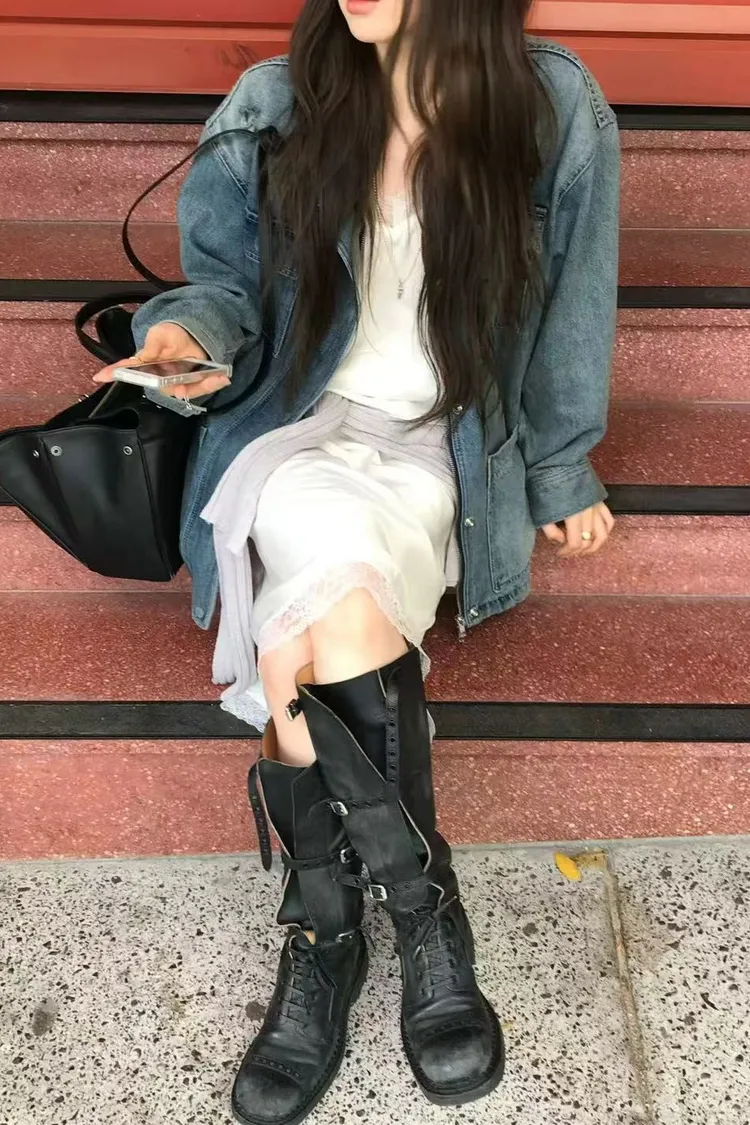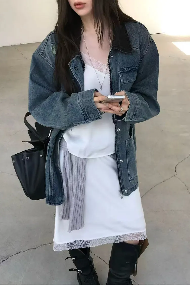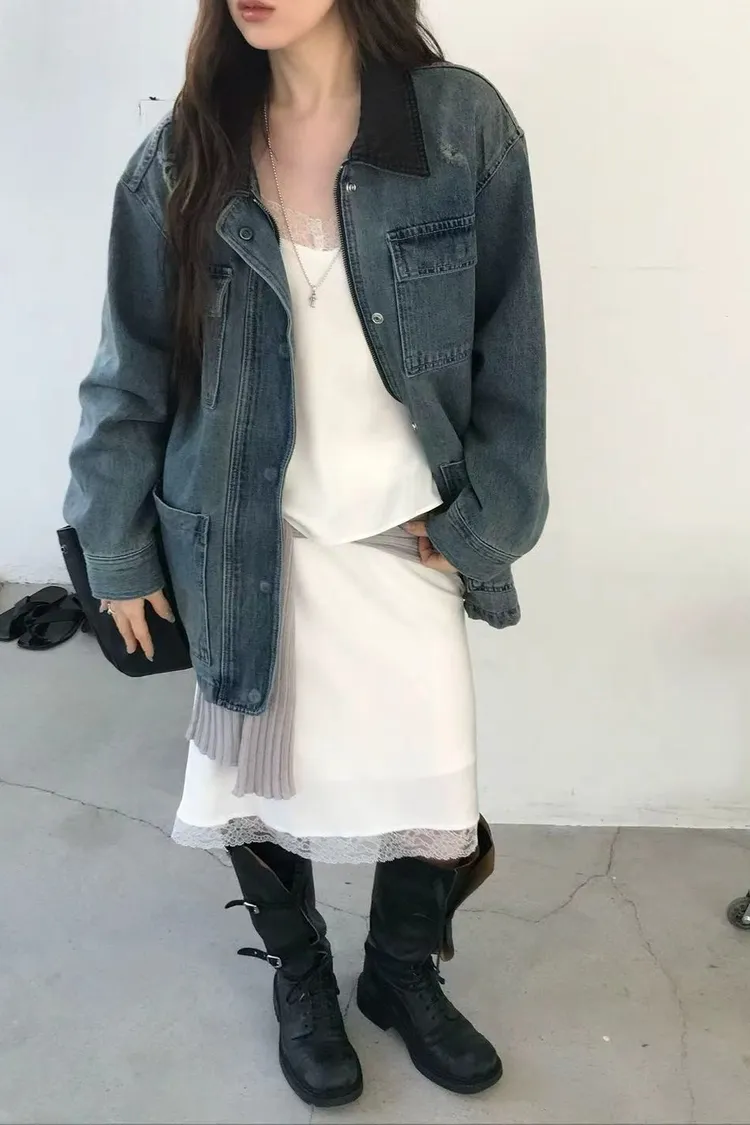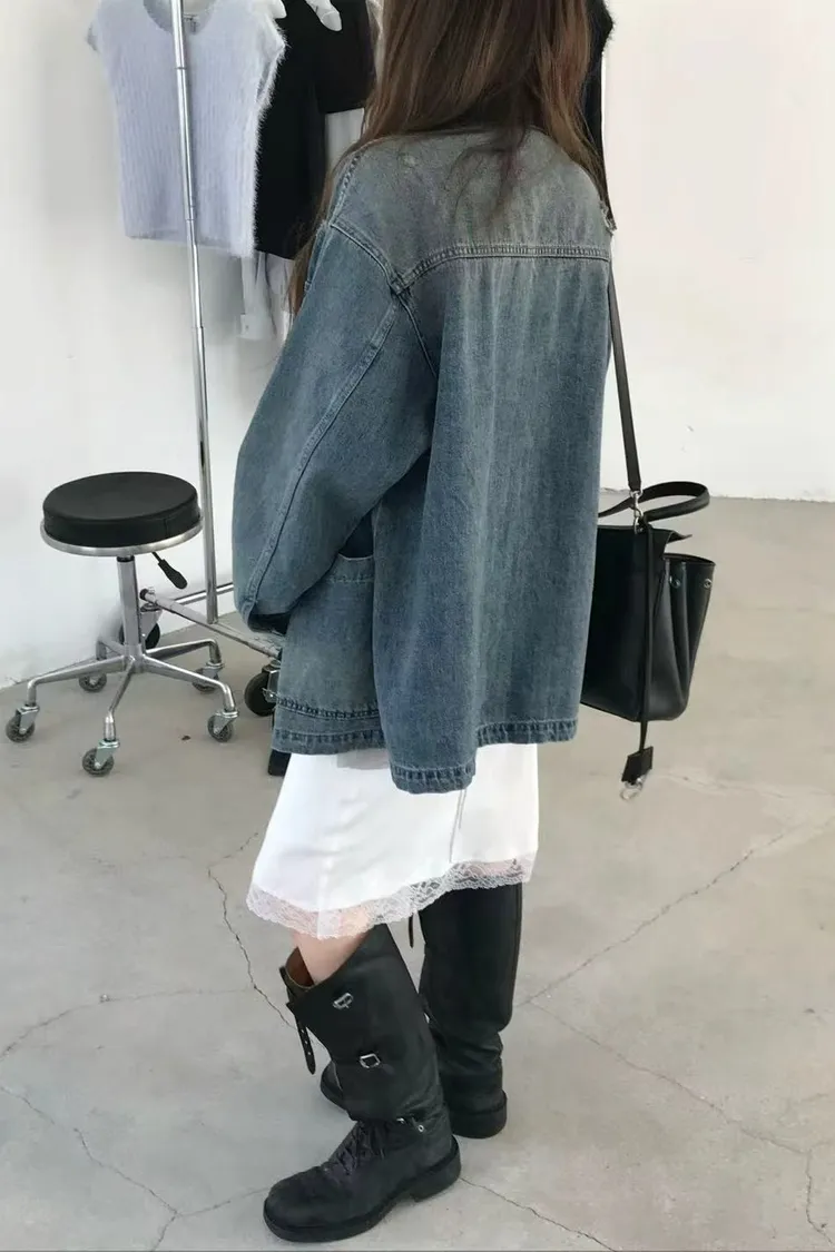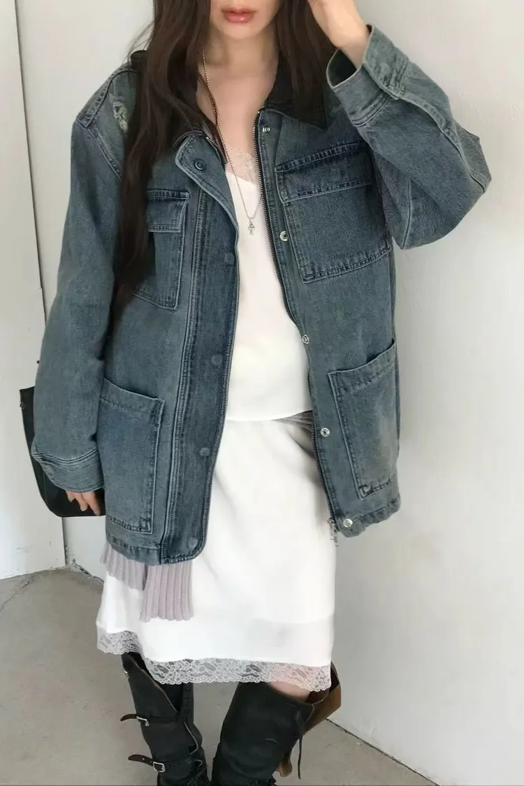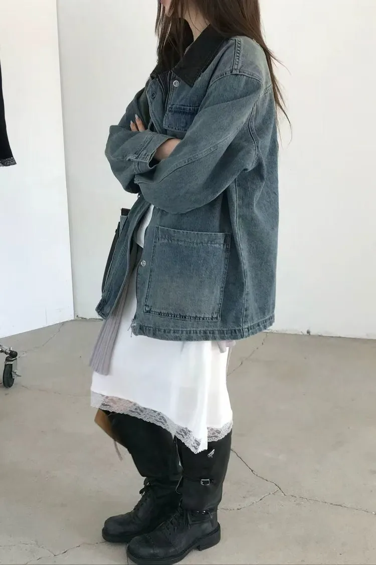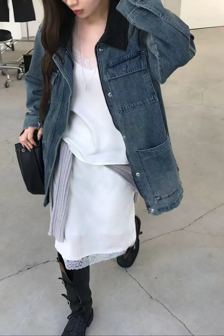 韓國連線款 時尚 中長版翻領大口袋牛仔外套 百搭外套