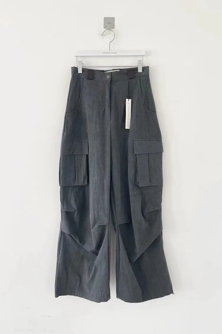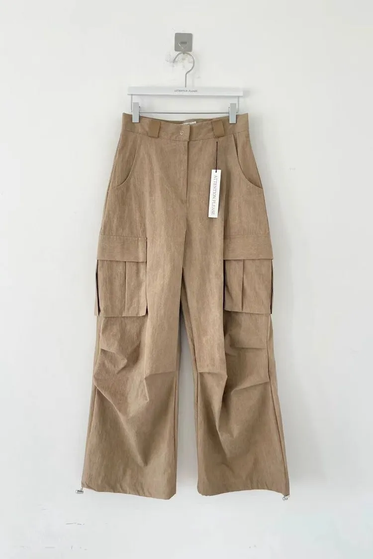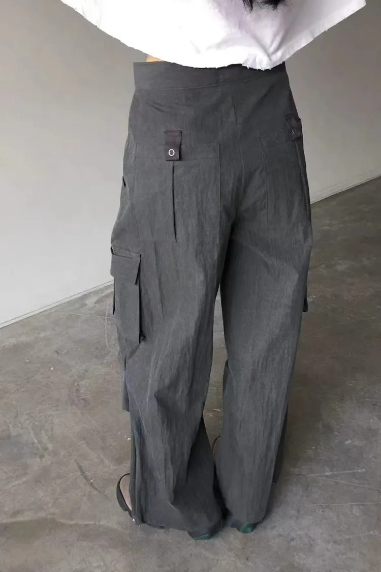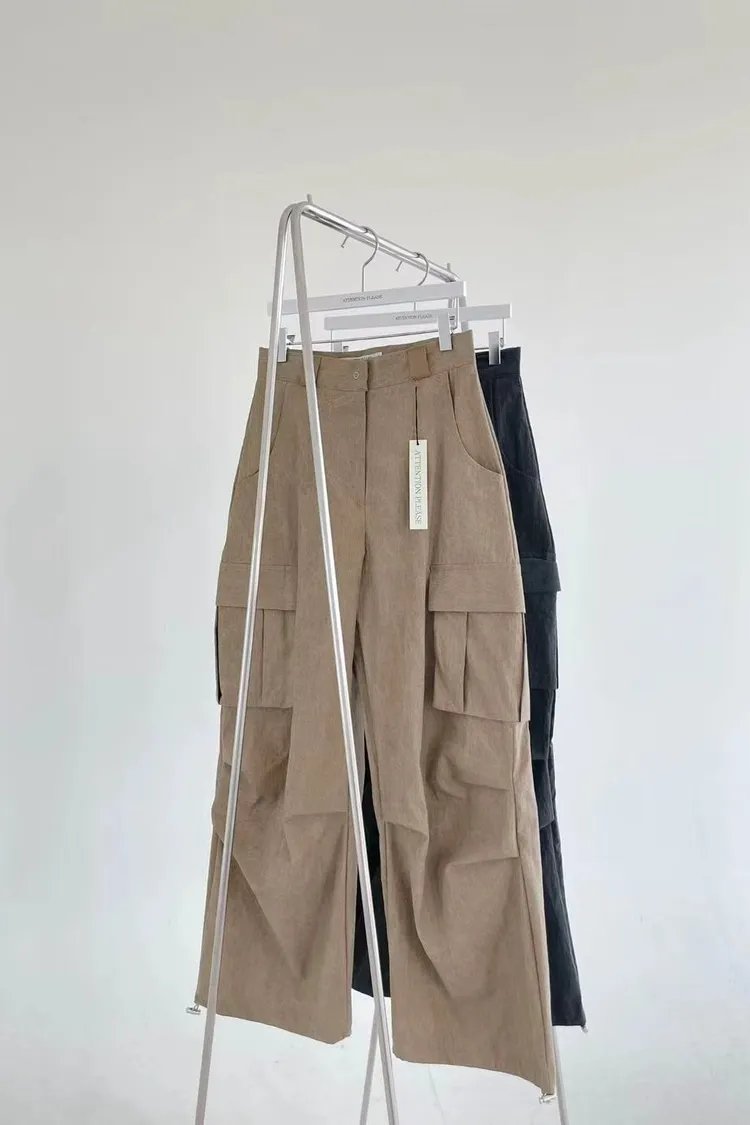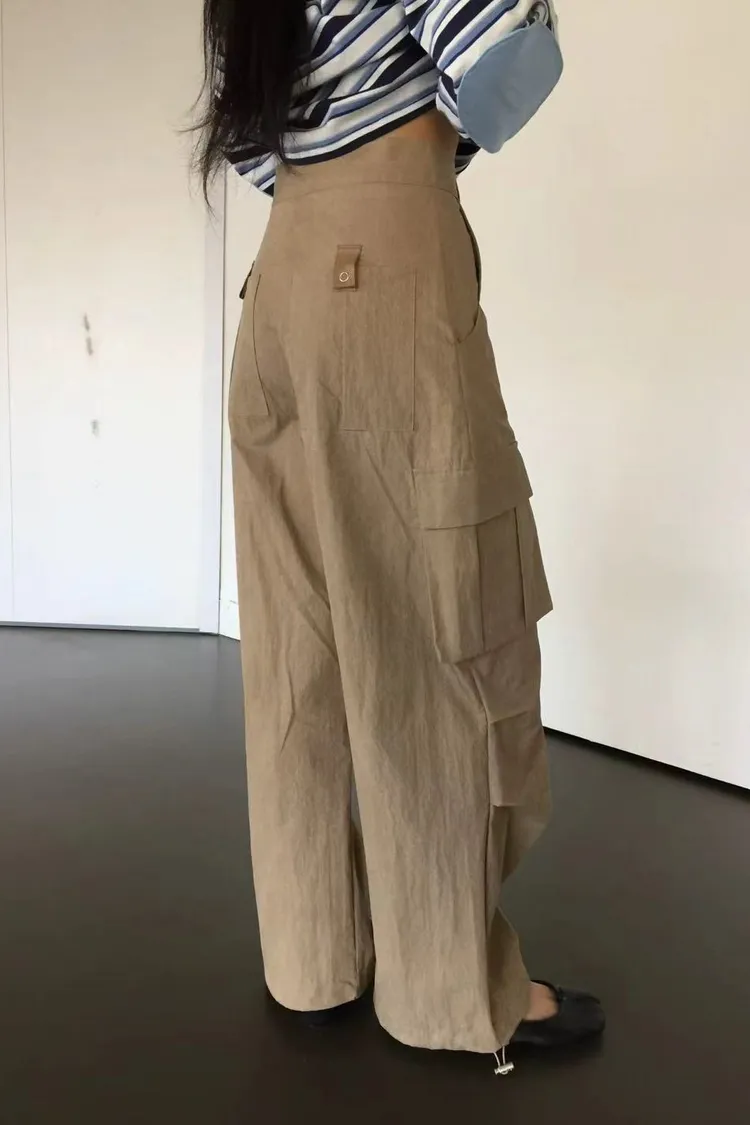 正韓女裝 設計師款 低腰工裝褲 大口袋闊腿落地褲 顯瘦休閒長褲