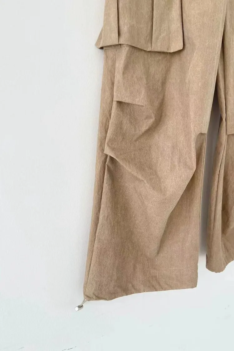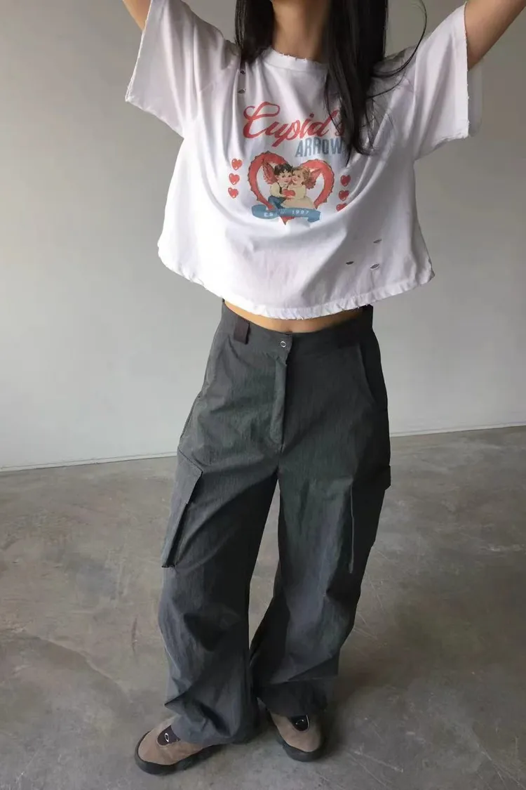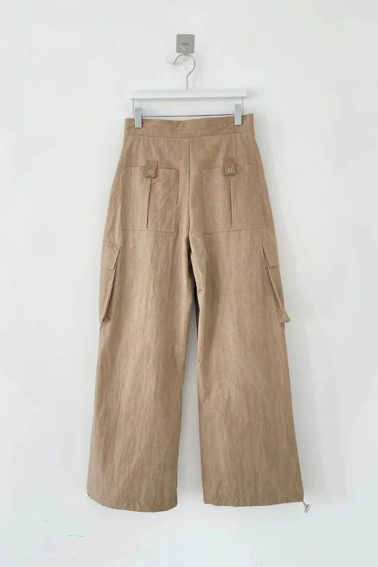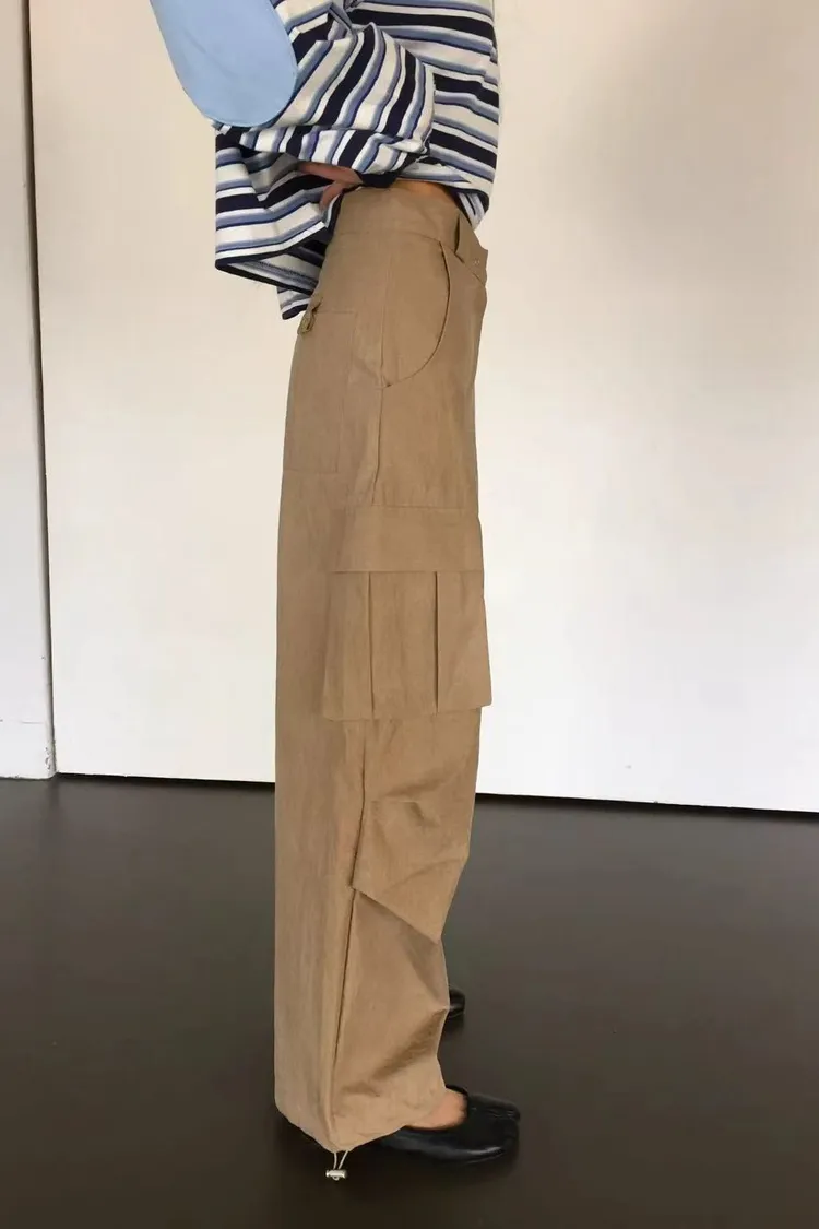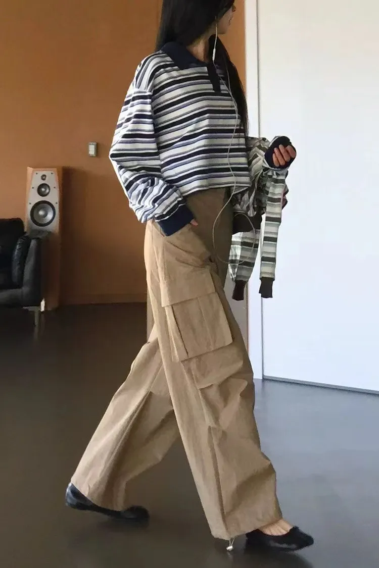 正韓女裝 設計師款 低腰工裝褲 大口袋闊腿落地褲 顯瘦休閒長褲