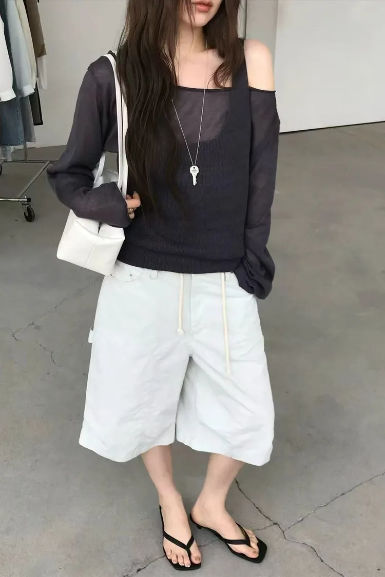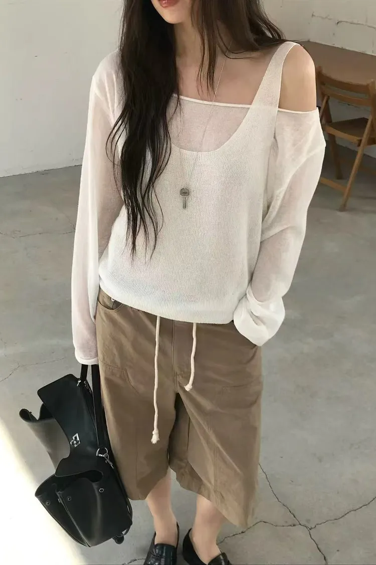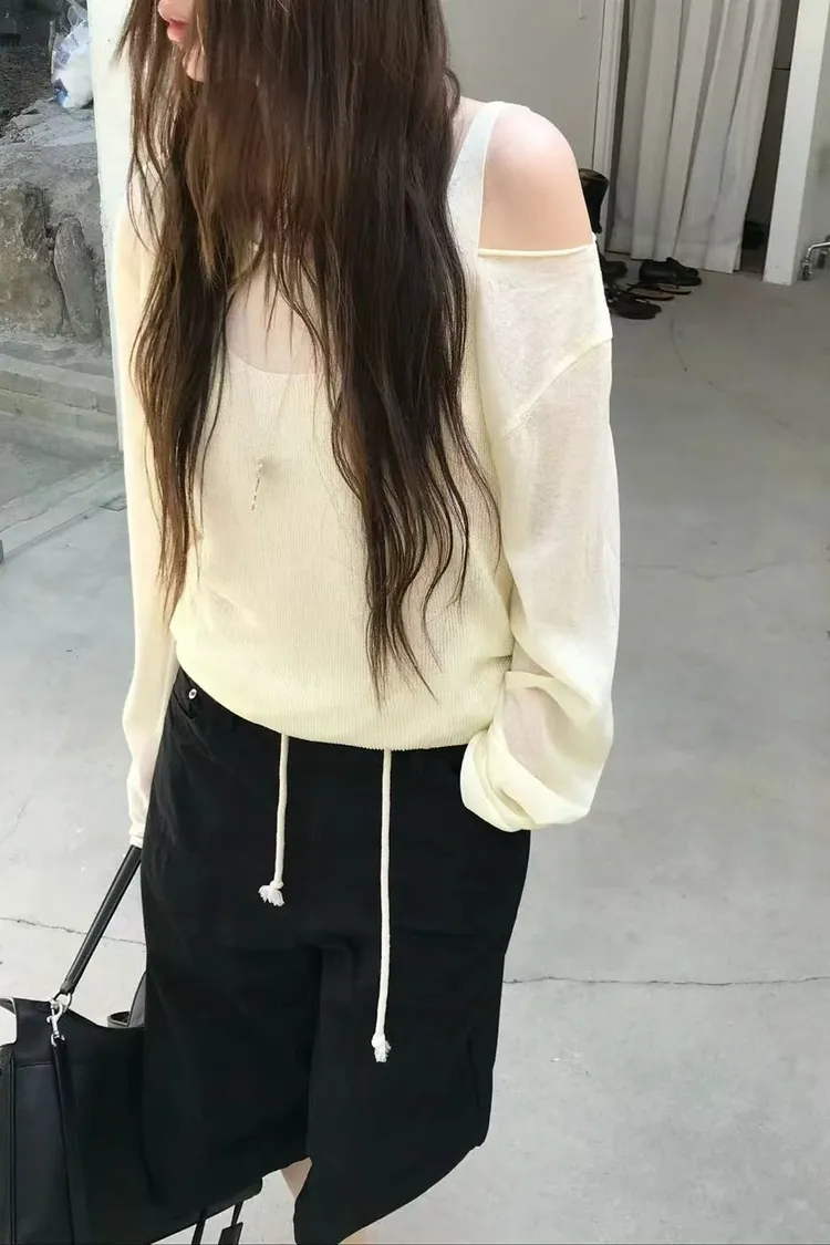 正韓女裝 春夏新品 鬆弛感假兩件慵懶露肩上衣 顯瘦百搭上衣