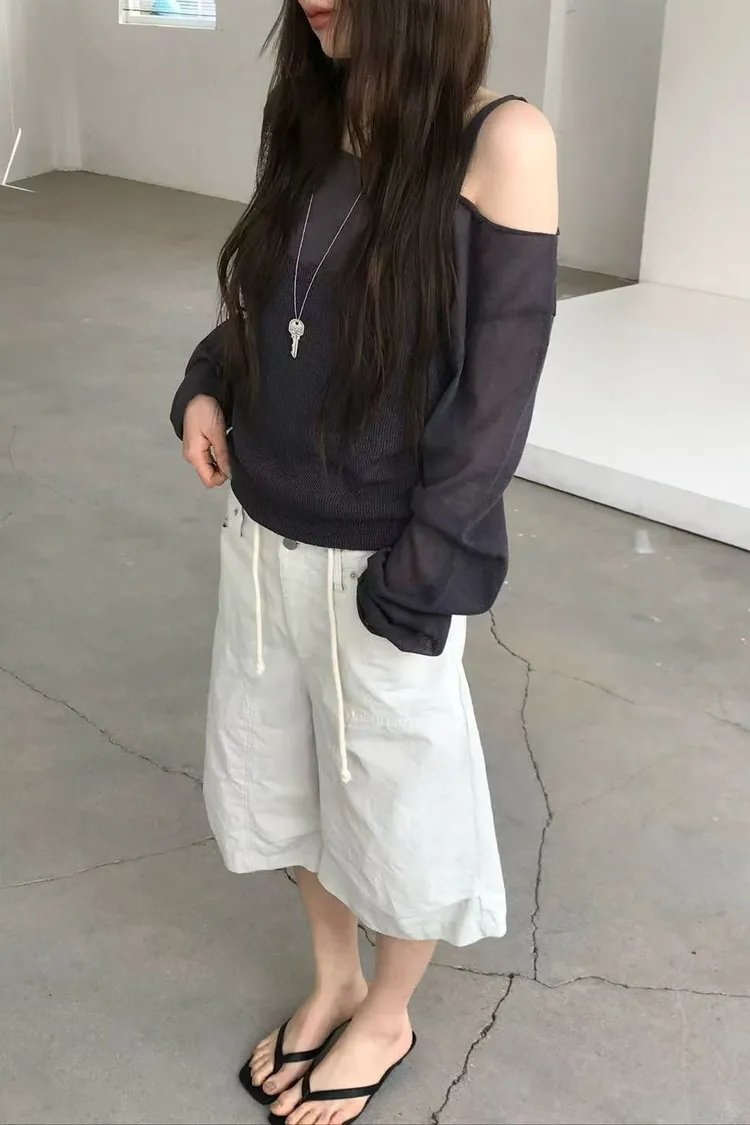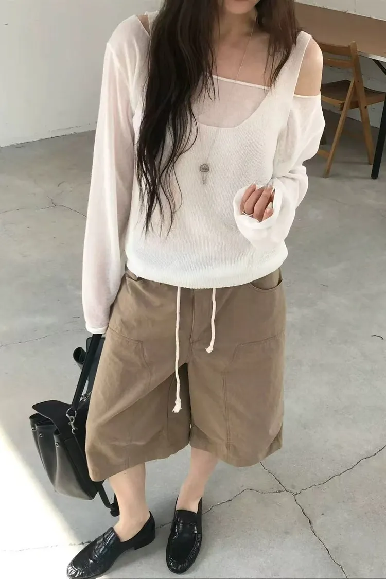 正韓女裝 春夏新品 鬆弛感假兩件慵懶露肩上衣 顯瘦百搭上衣