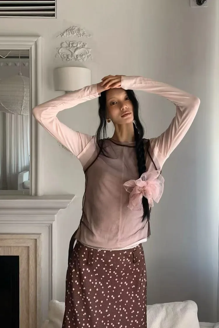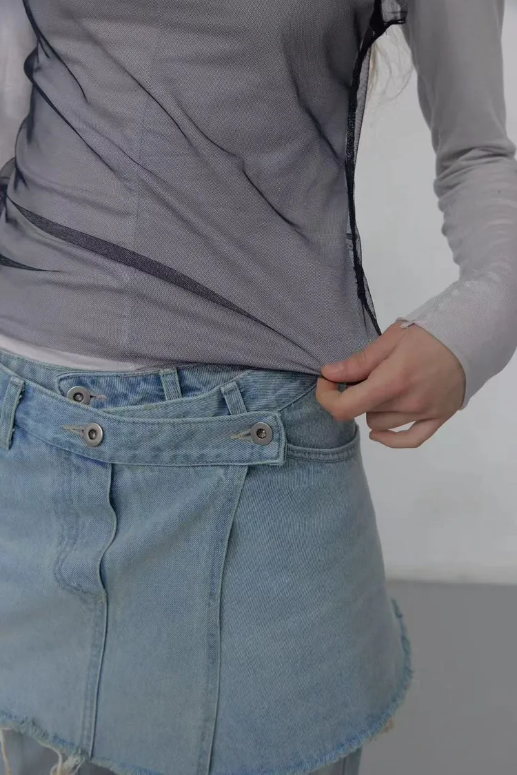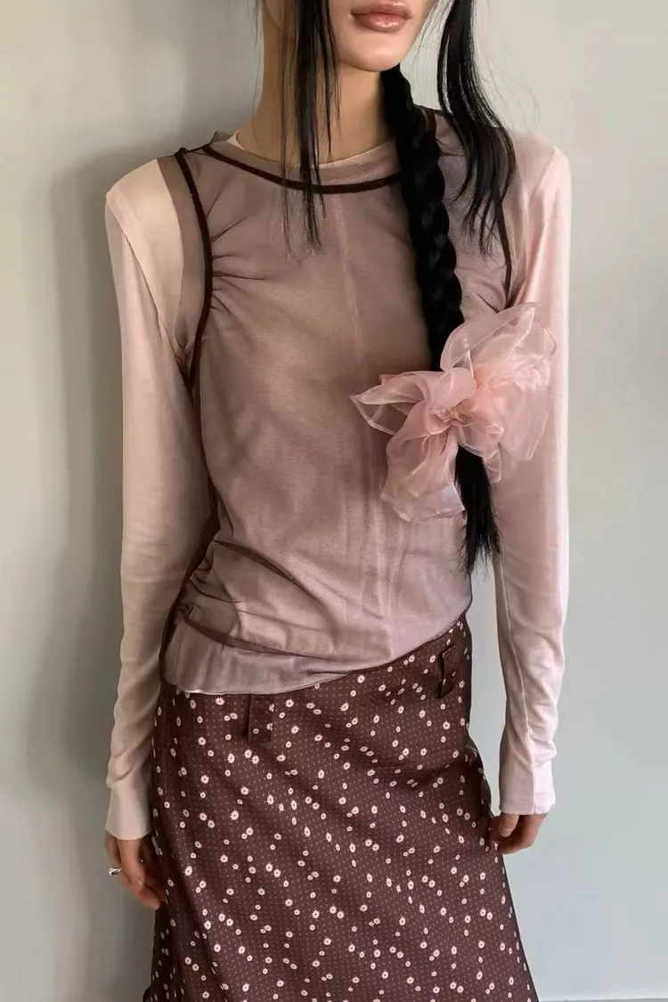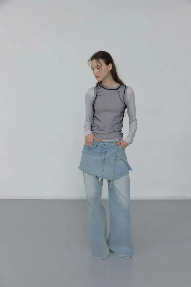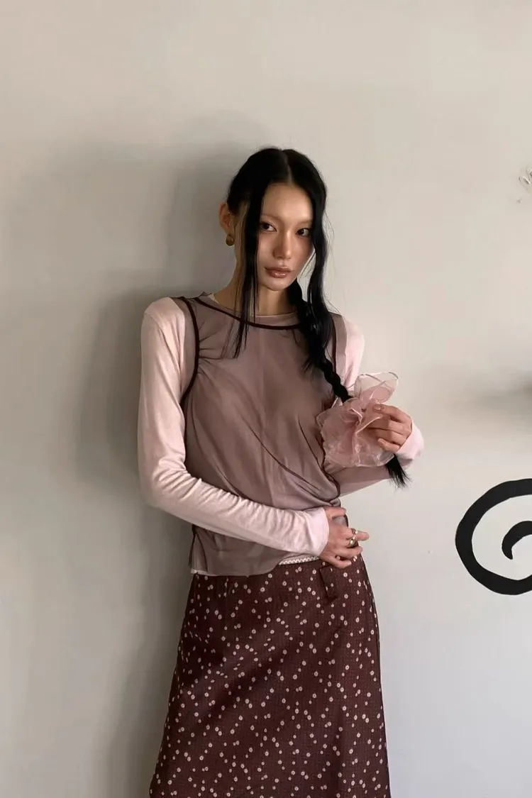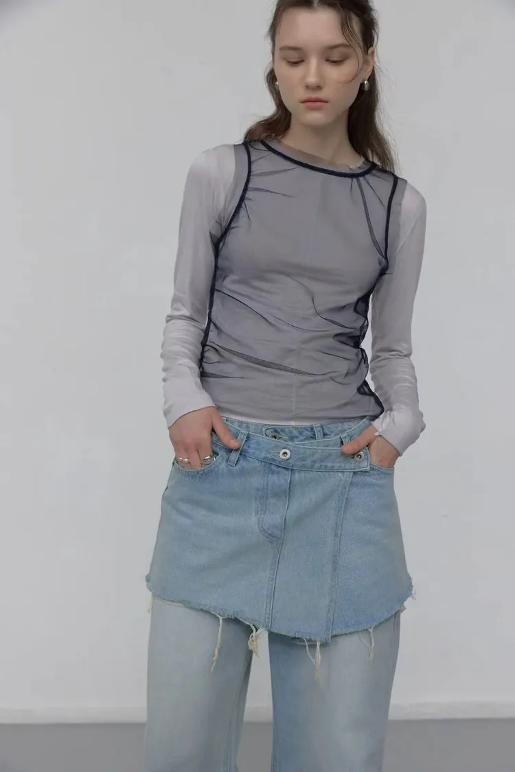 正韓女裝 拚色透視背心 假兩件薄長袖