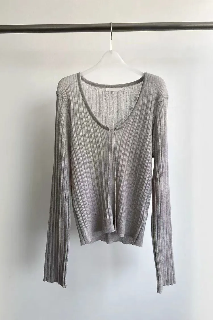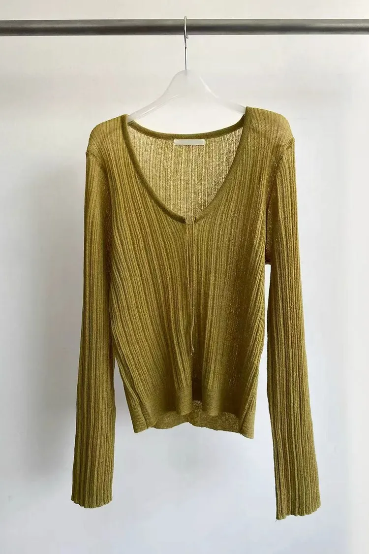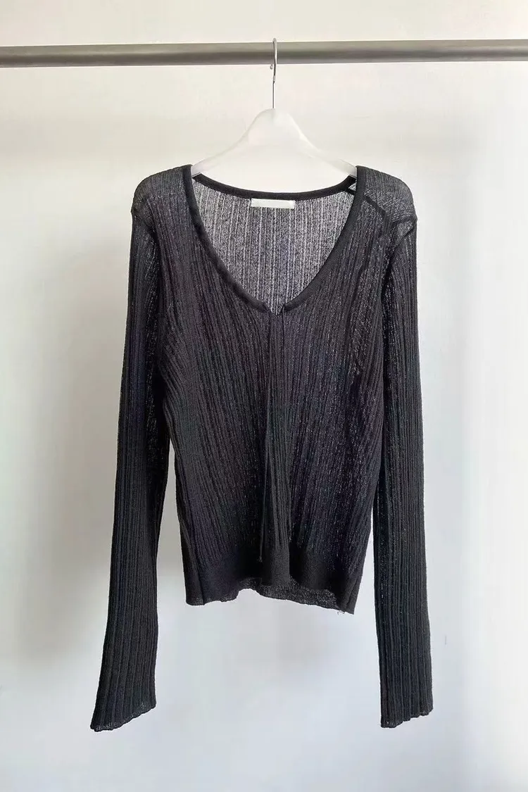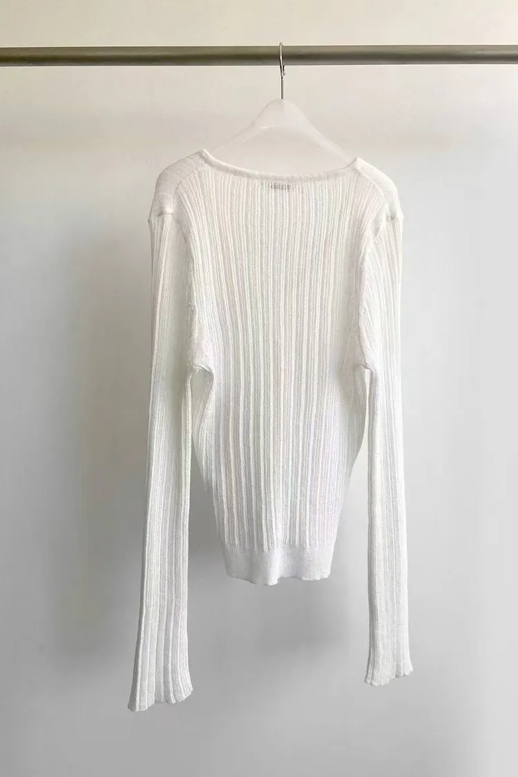 正韓女裝 低領螺紋長袖 落肩透膚針織衫