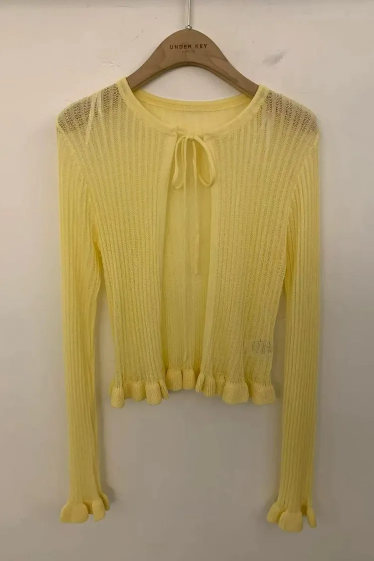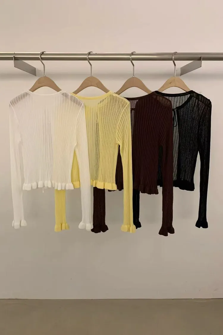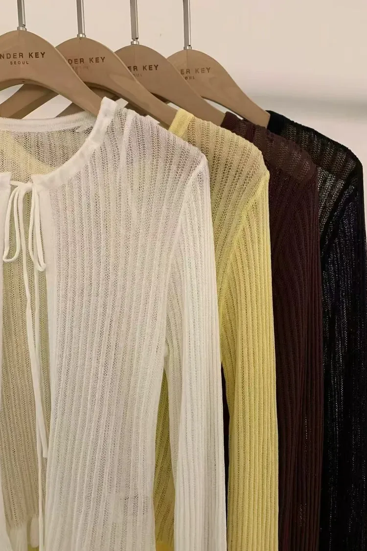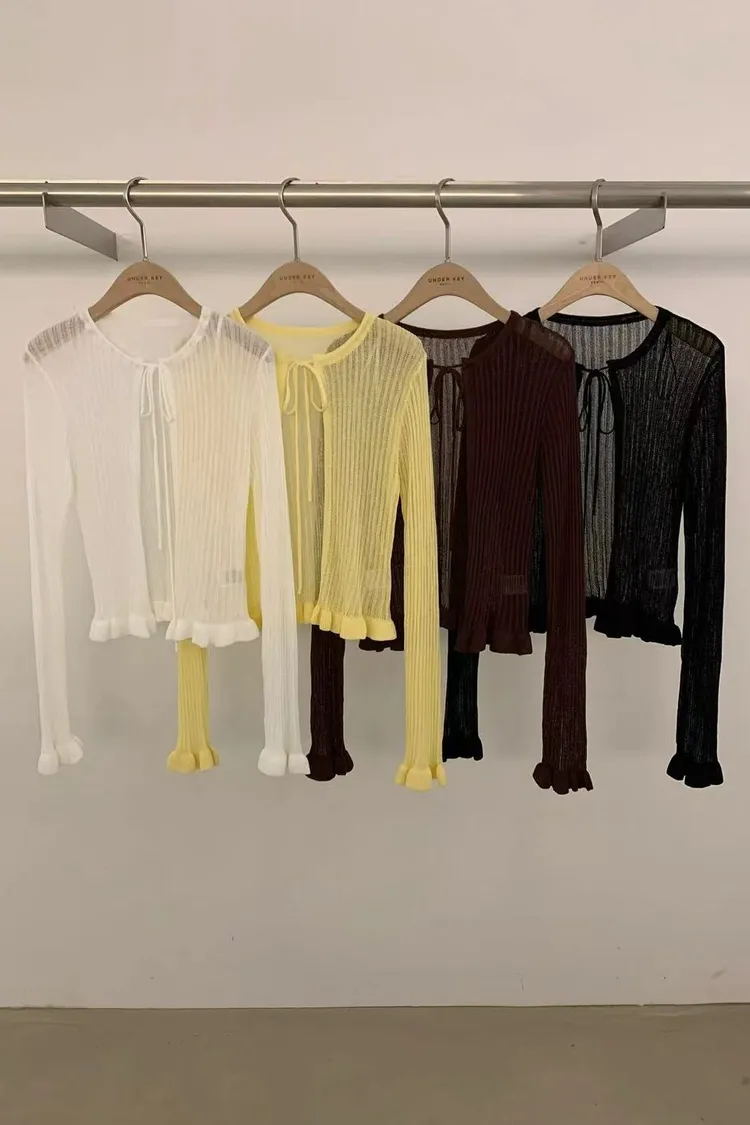 正韓女裝 木耳邊綁帶透膚針織衫 圓領薄款防曬外搭