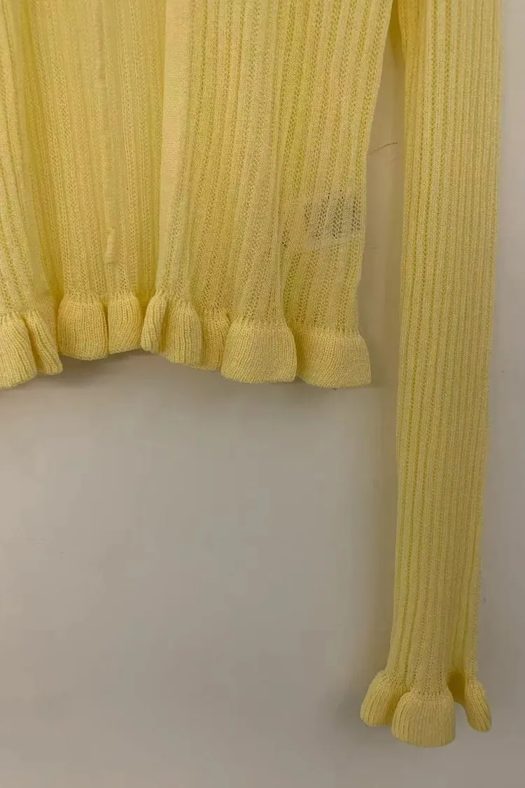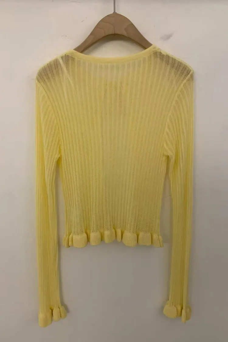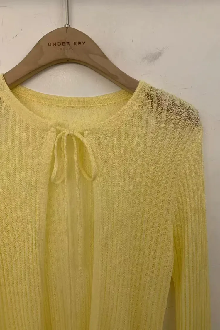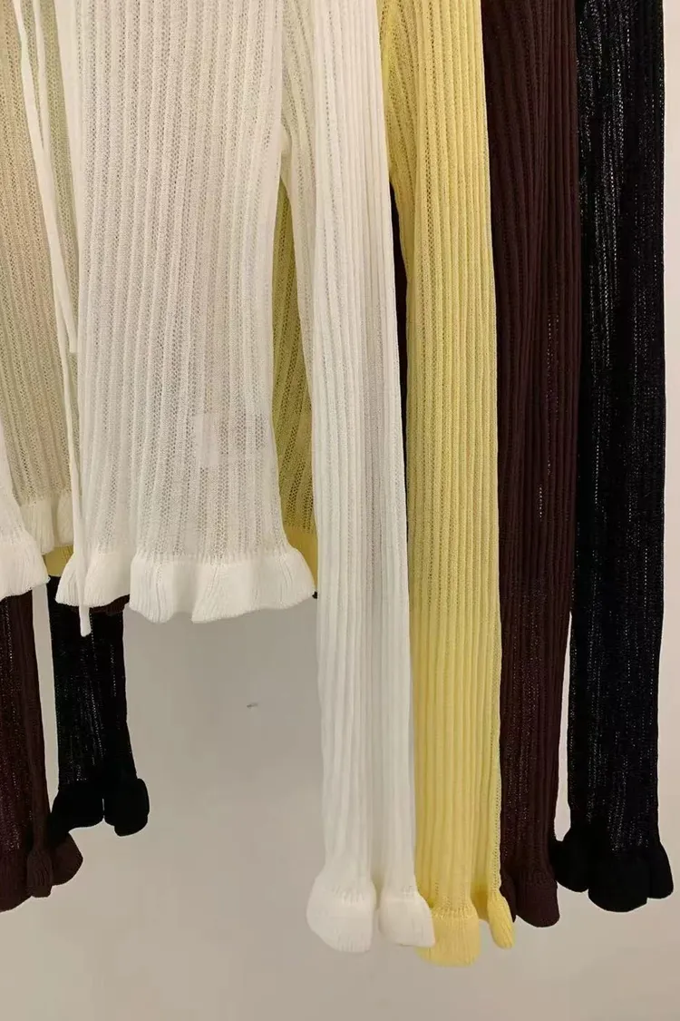 正韓女裝 木耳邊綁帶透膚針織衫 圓領薄款防曬外搭