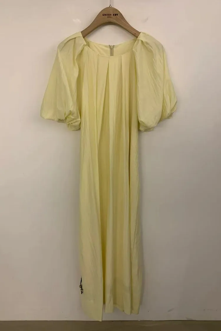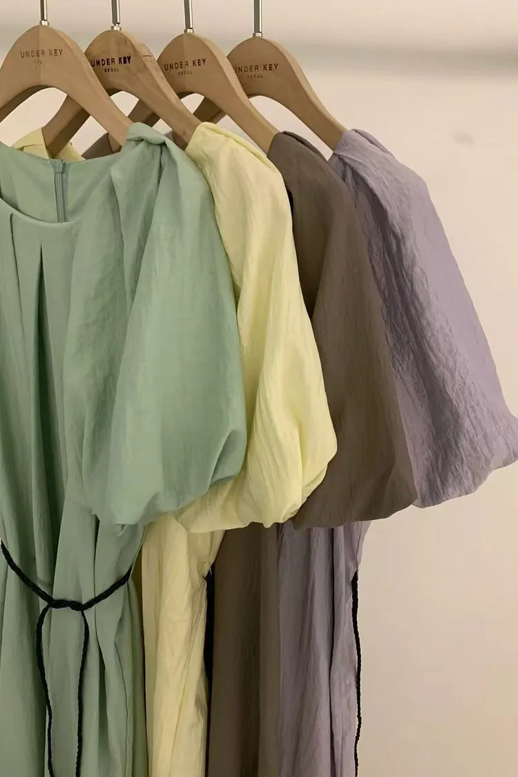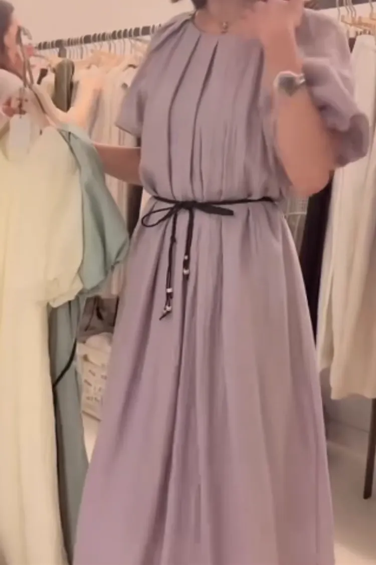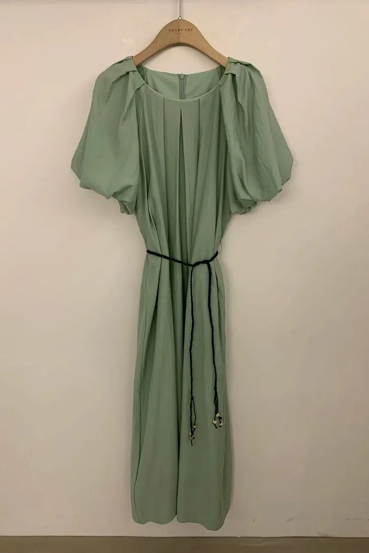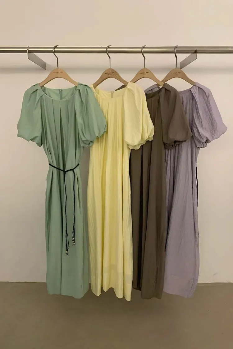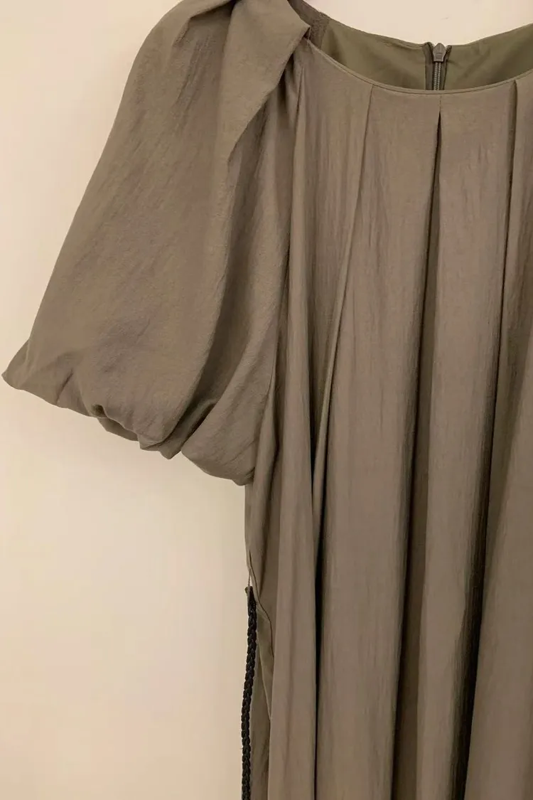 正韓女裝 泡泡袖寬鬆收腰連衣裙 圓領抓皺後開岔長洋