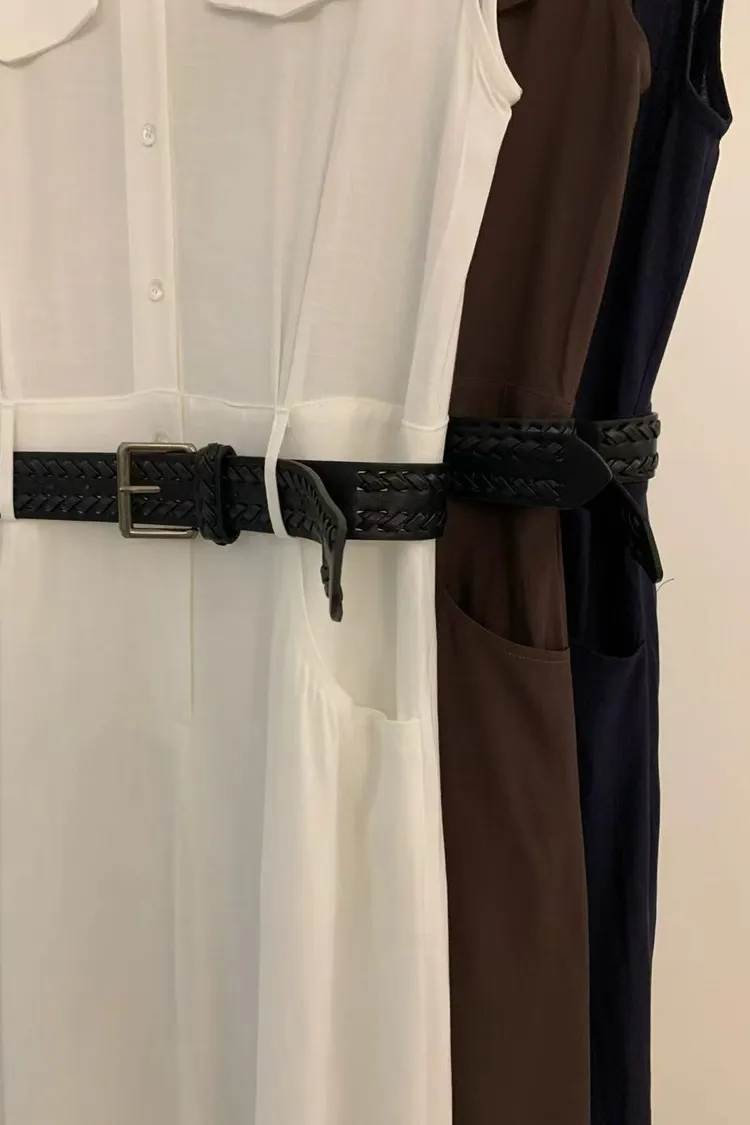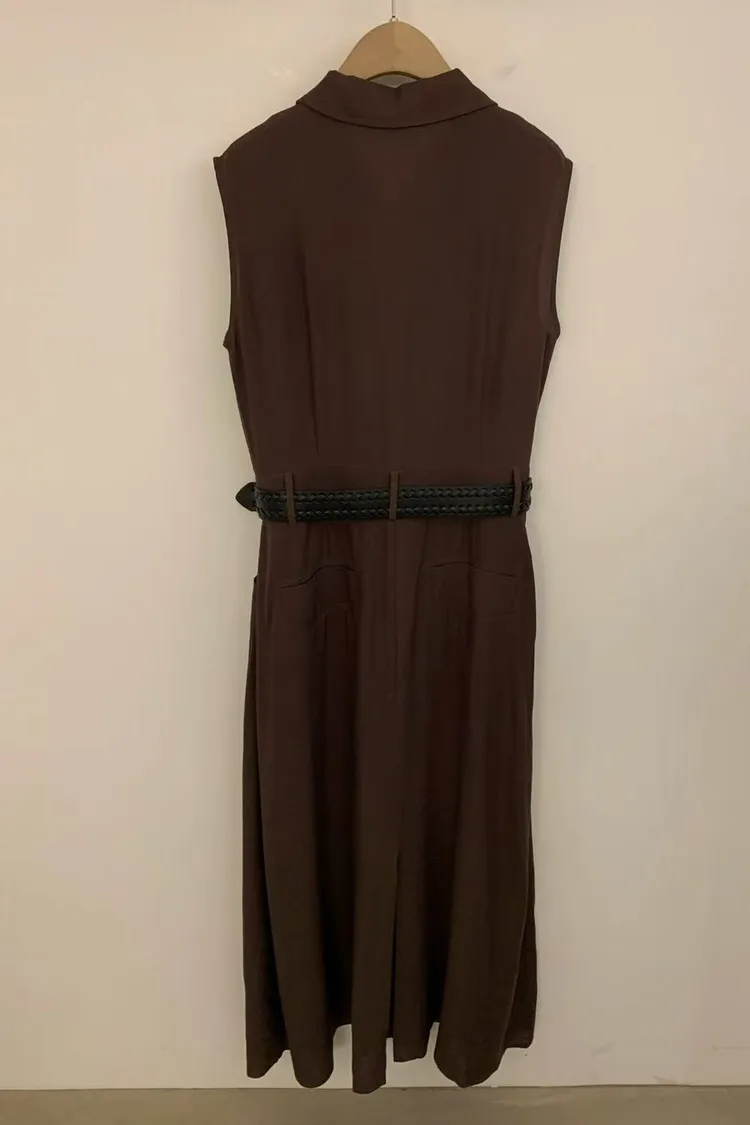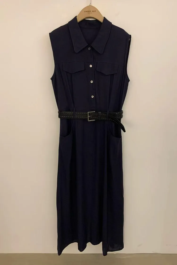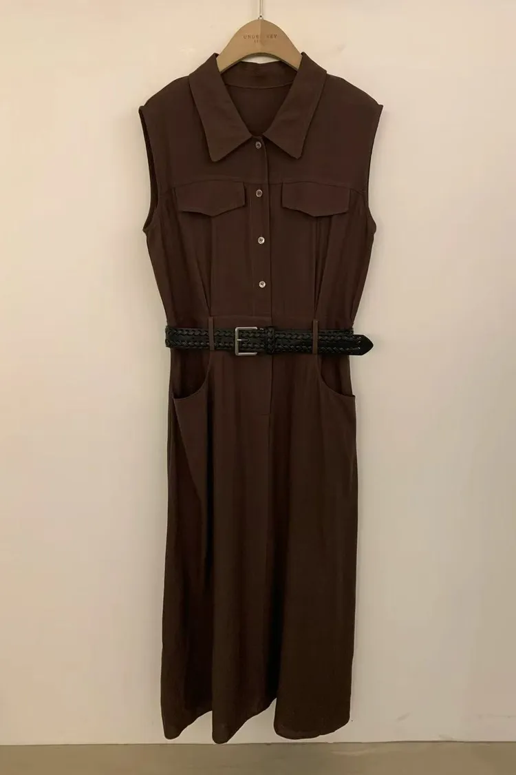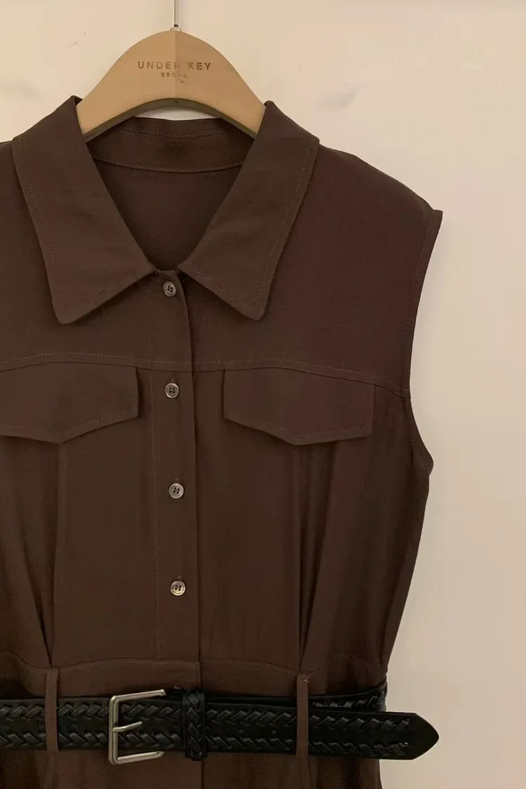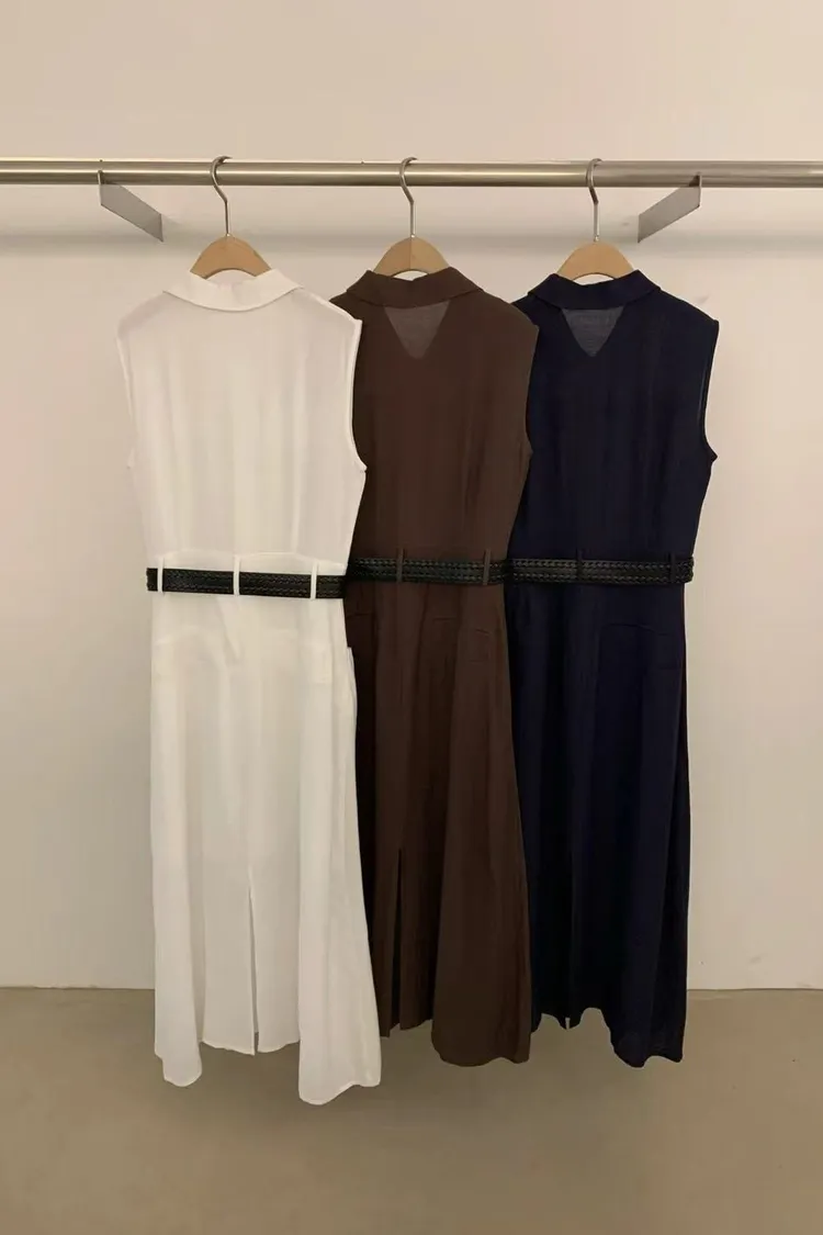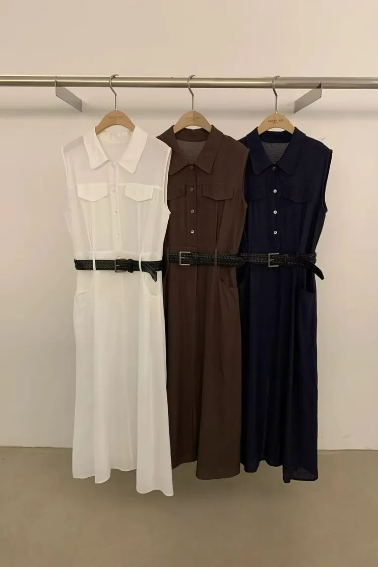 正韓女裝 立領無袖連身長洋 設計感收腰皮帶洋裝