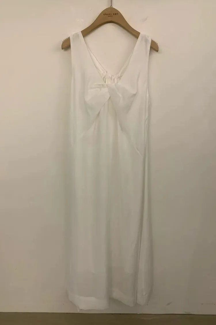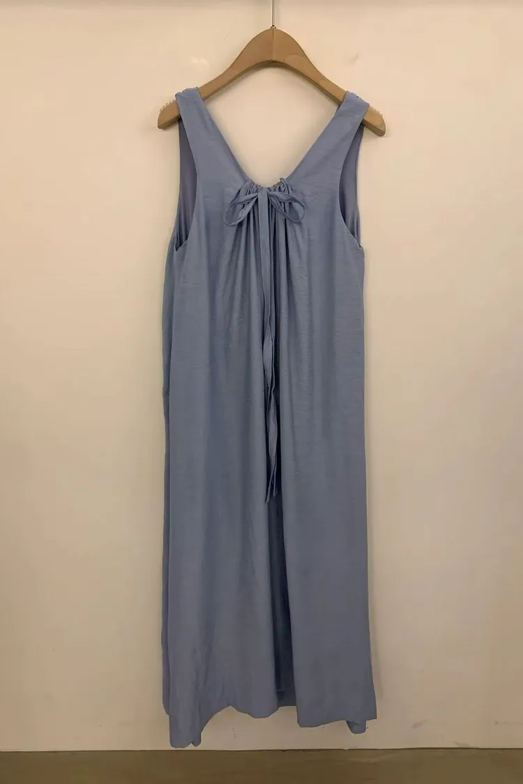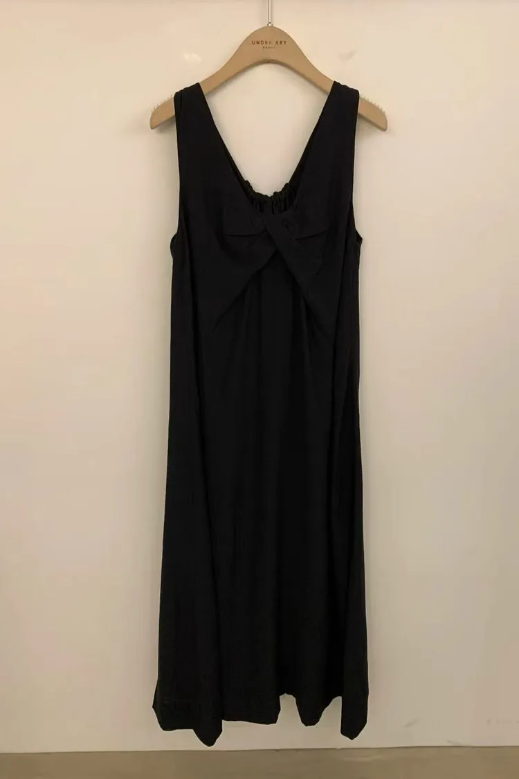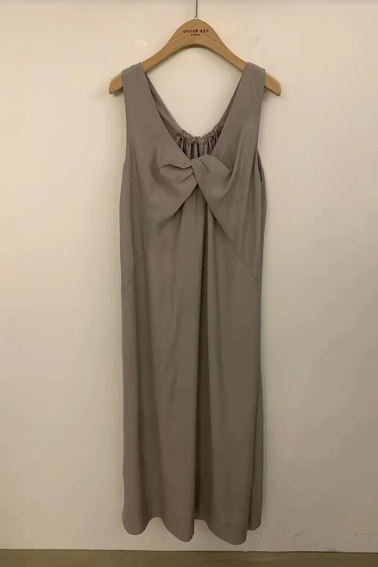 韓國女裝 V領扭結打褶彈力長洋 後鬆緊寬版顯瘦連身裙