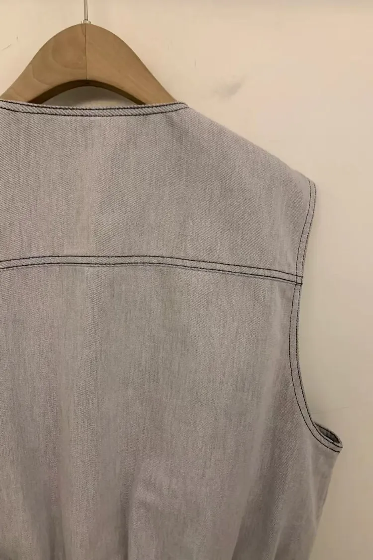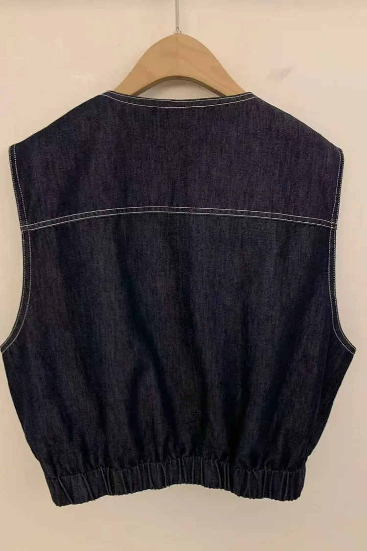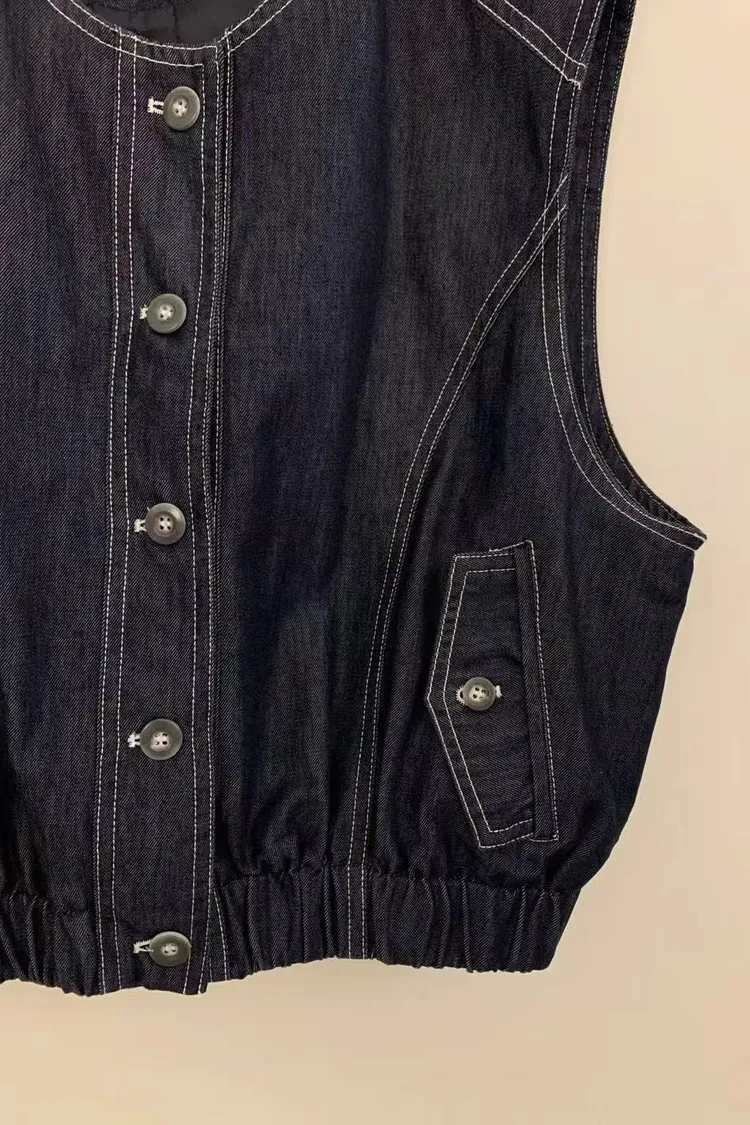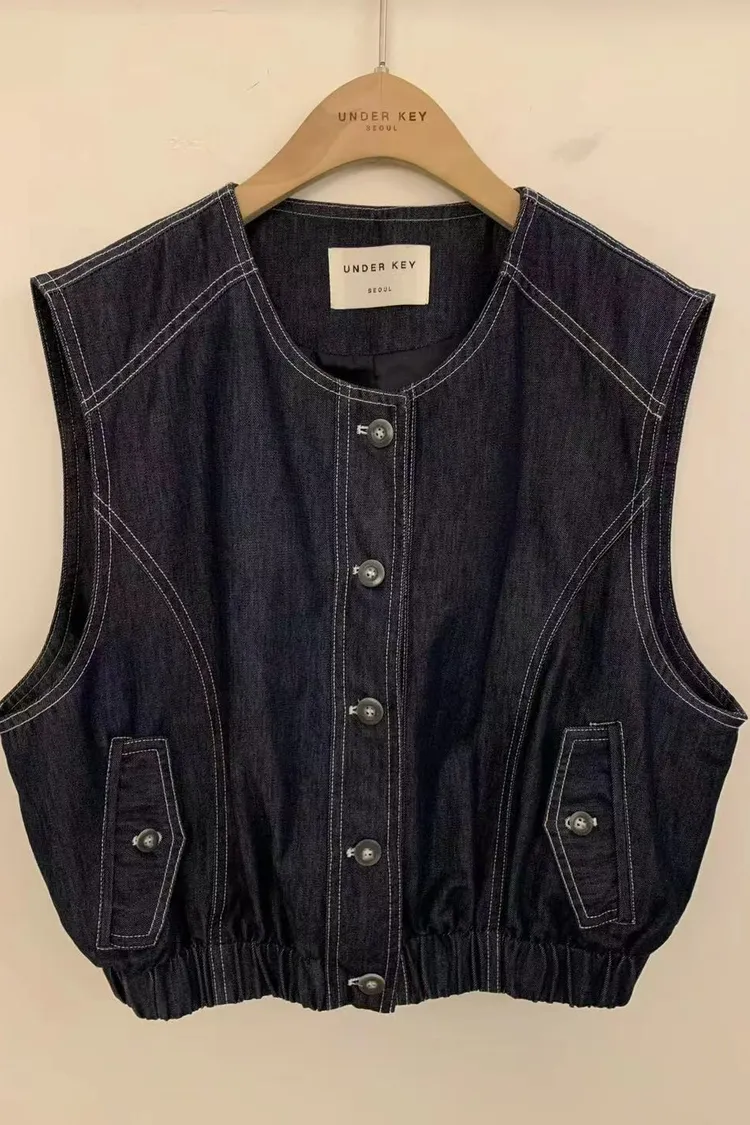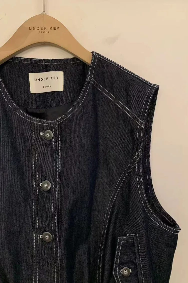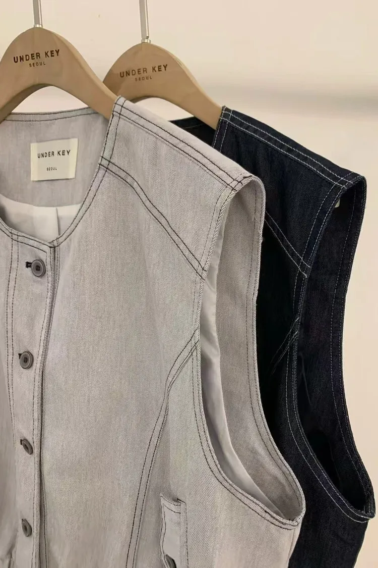 正韓女裝 設計師款 明線圓領牛仔套裝 復古排扣鬆緊馬甲背心 後開岔寬鬆顯瘦半身裙