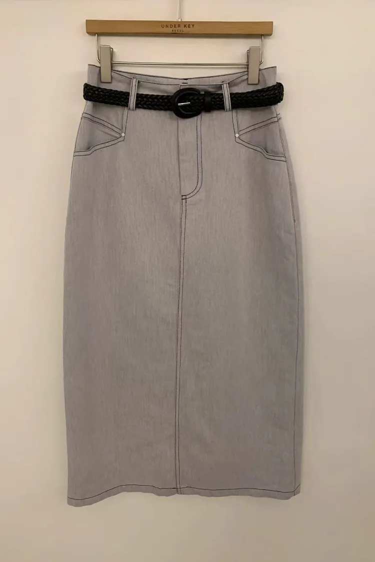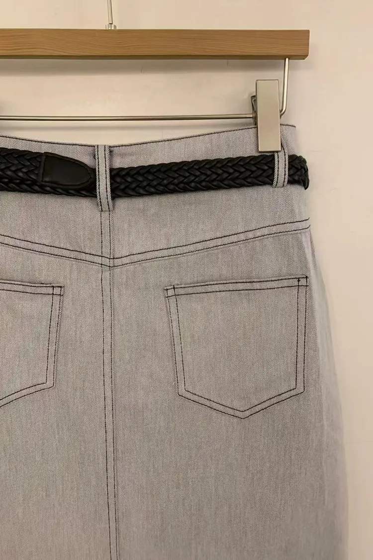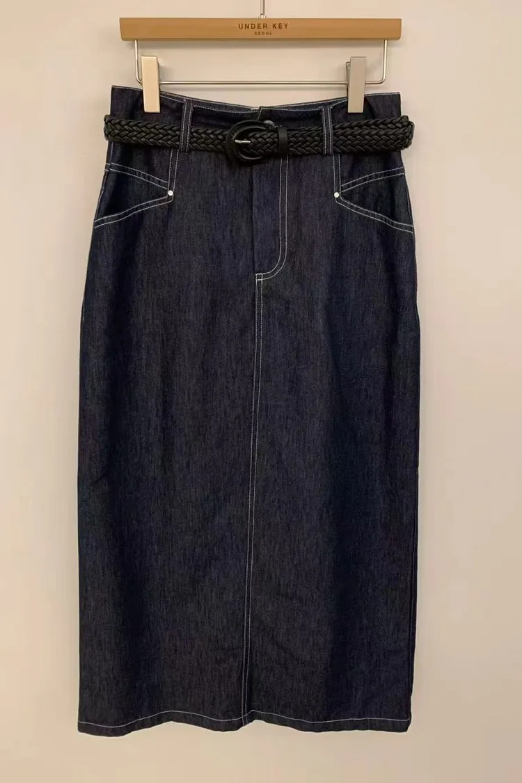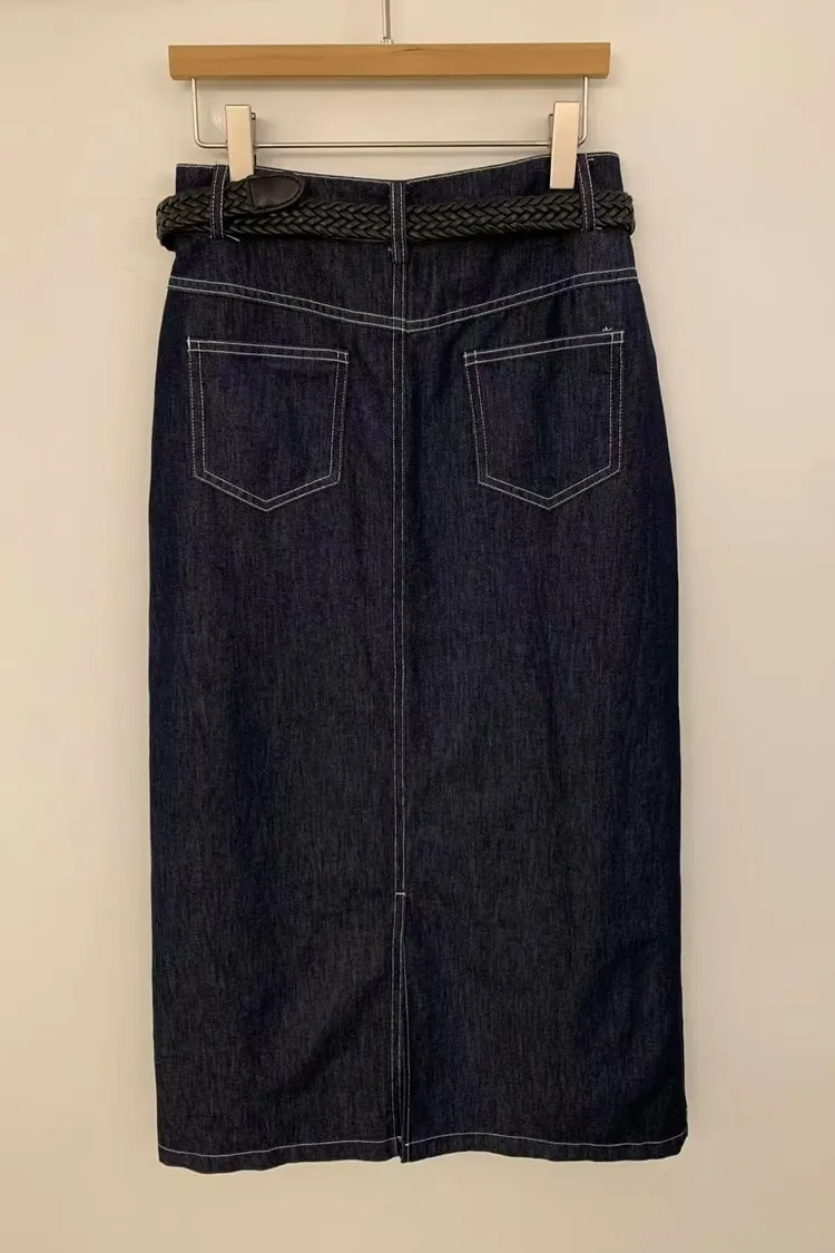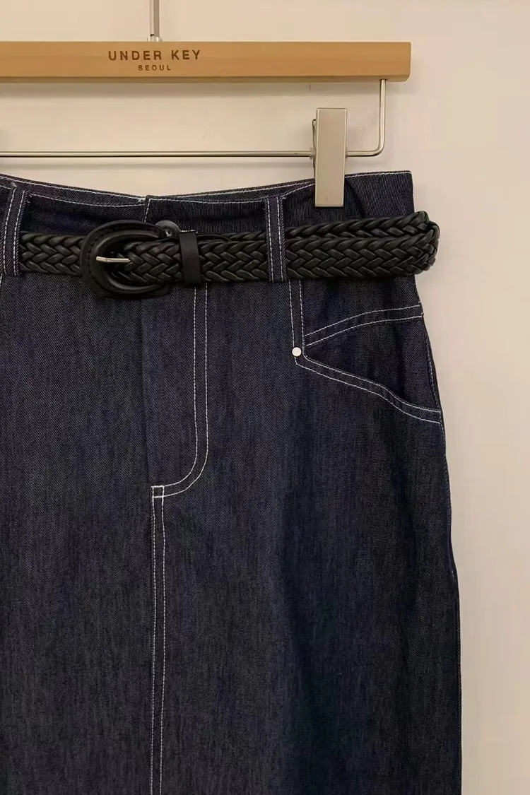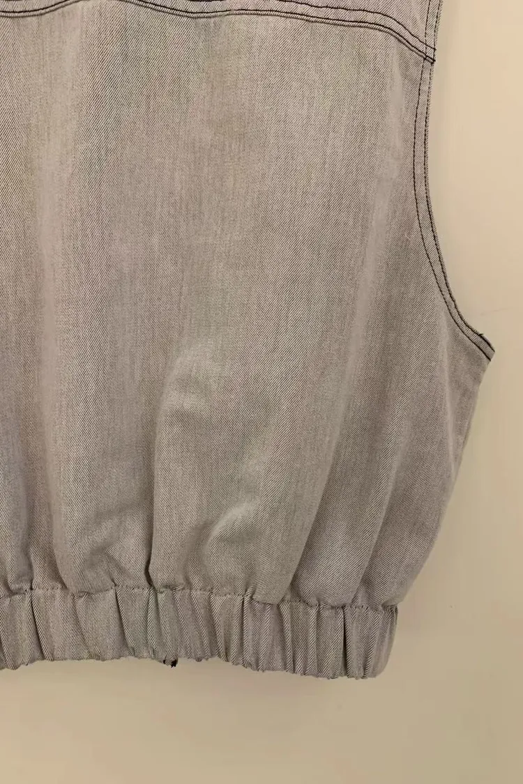 正韓女裝 設計師款 明線圓領牛仔套裝 復古排扣鬆緊馬甲背心 後開岔寬鬆顯瘦半身裙