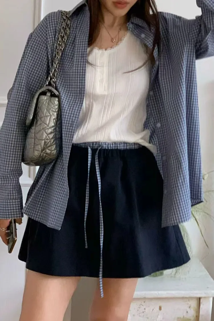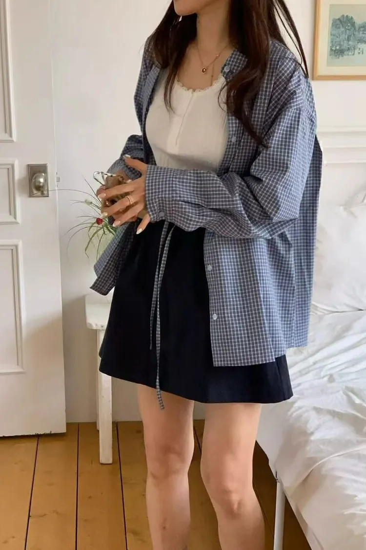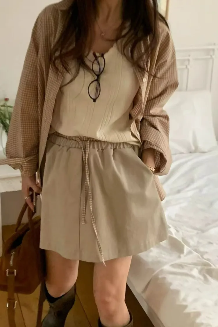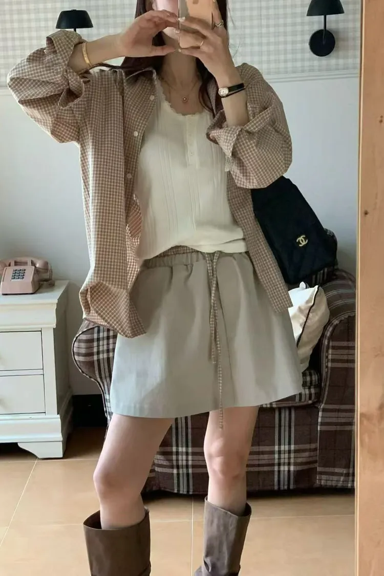 正韓女裝 復古格紋拼接休閒套裝 寬鬆百搭格紋襯衫 格紋拼接鬆緊繫腰半身裙