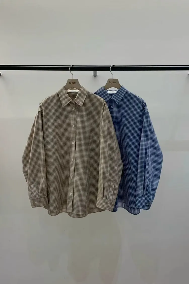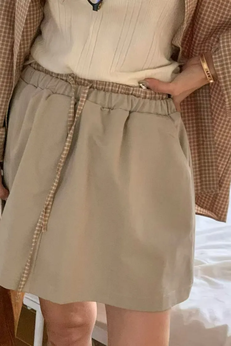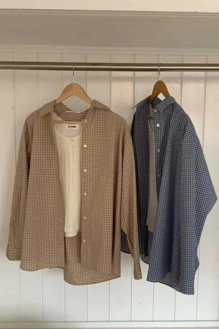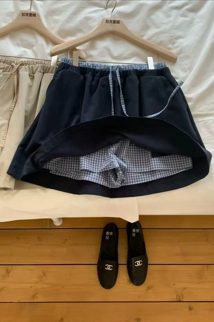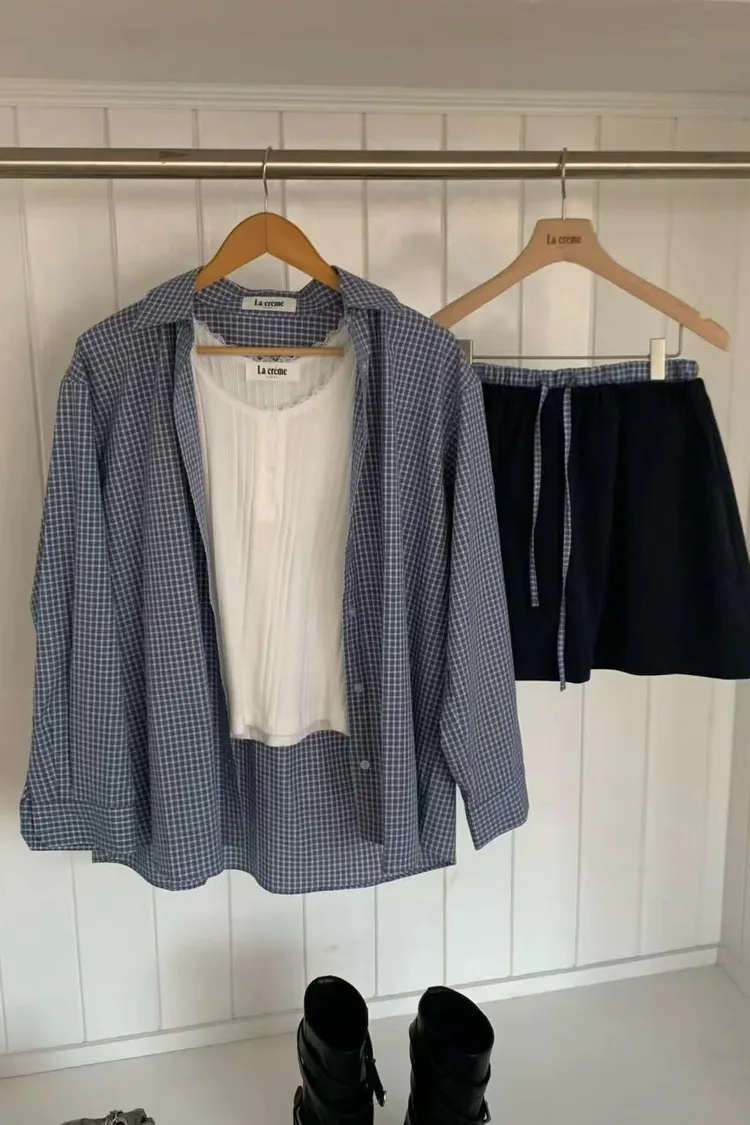 正韓女裝 復古格紋拼接休閒套裝 寬鬆百搭格紋襯衫 格紋拼接鬆緊繫腰半身裙
