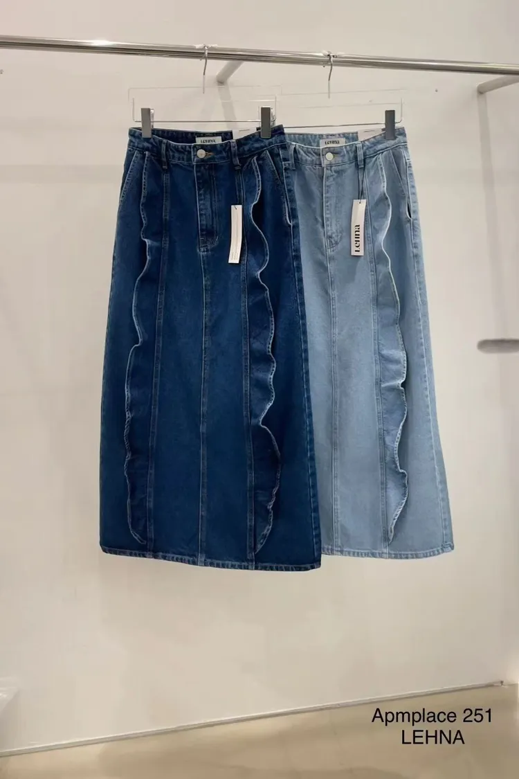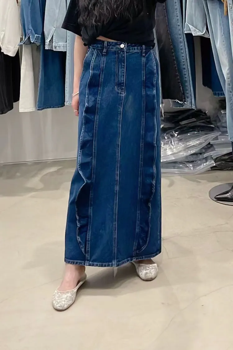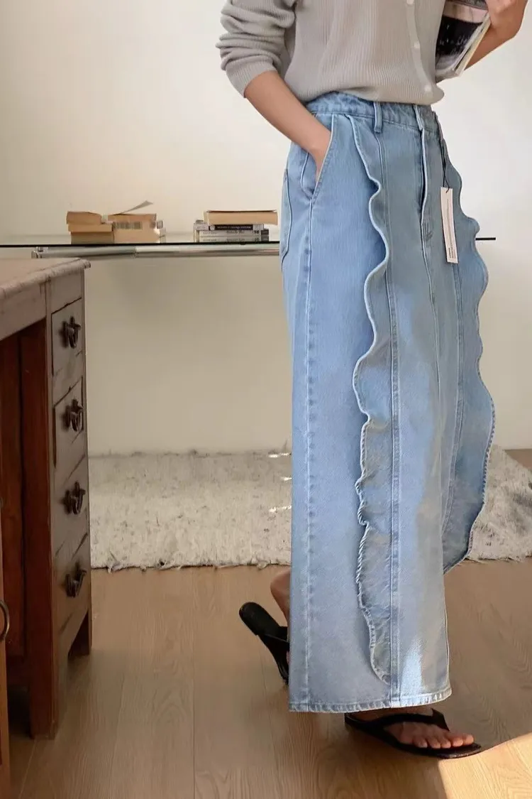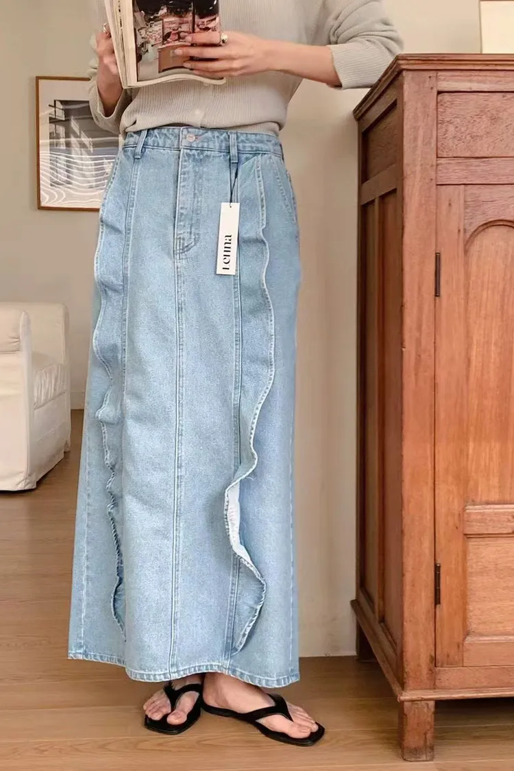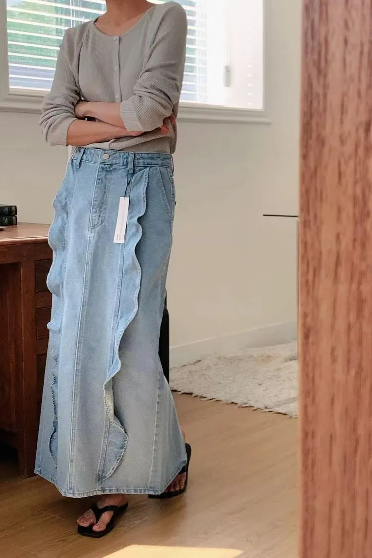 韓國代購 春季新款 荷葉邊牛仔長裙