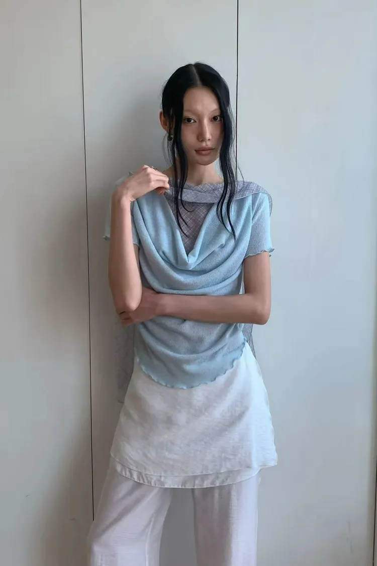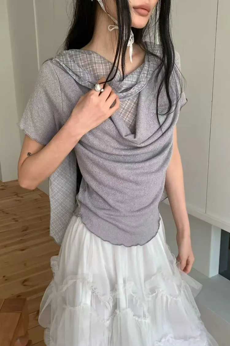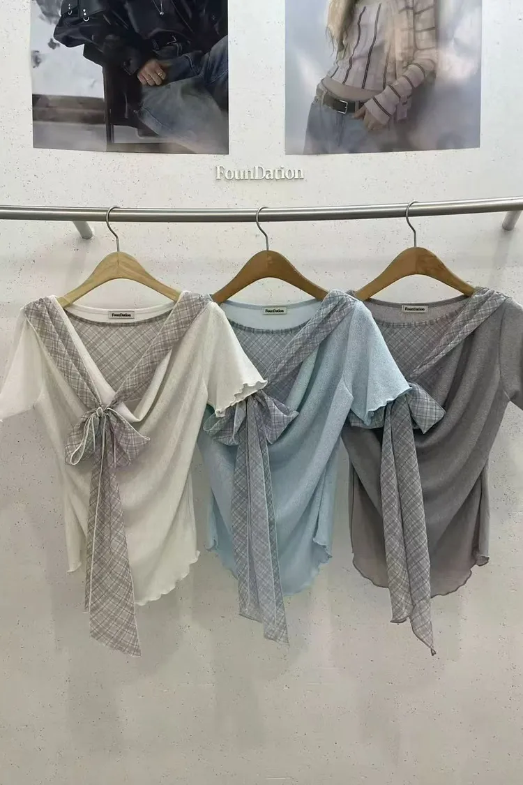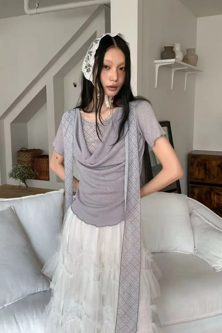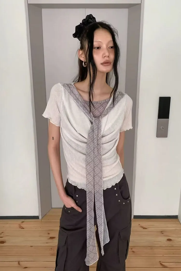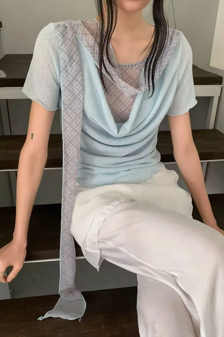 正韓女裝 設計師款復古格紋帶 假兩件透膚拼接上衣