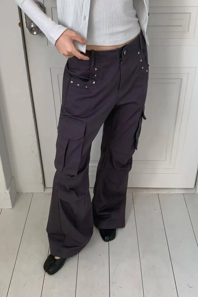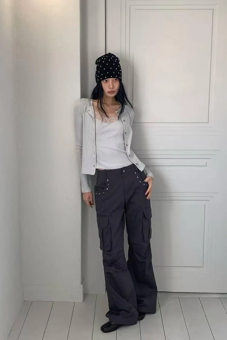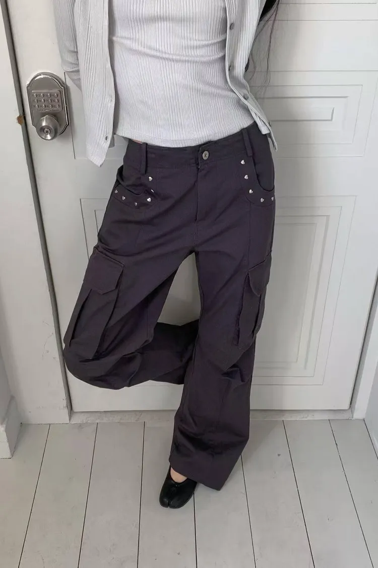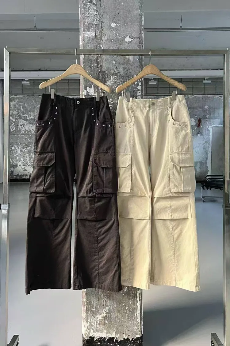 韓國連線 設計感鉚釘工裝褲 直筒寬褲