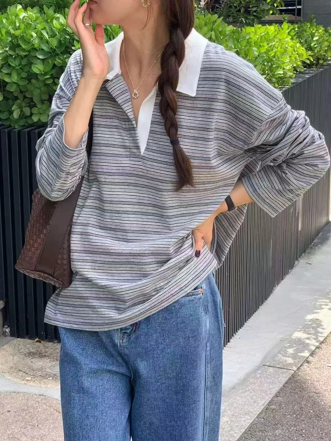 條紋翻領POLO長袖上衣 休閒寬鬆百搭T恤