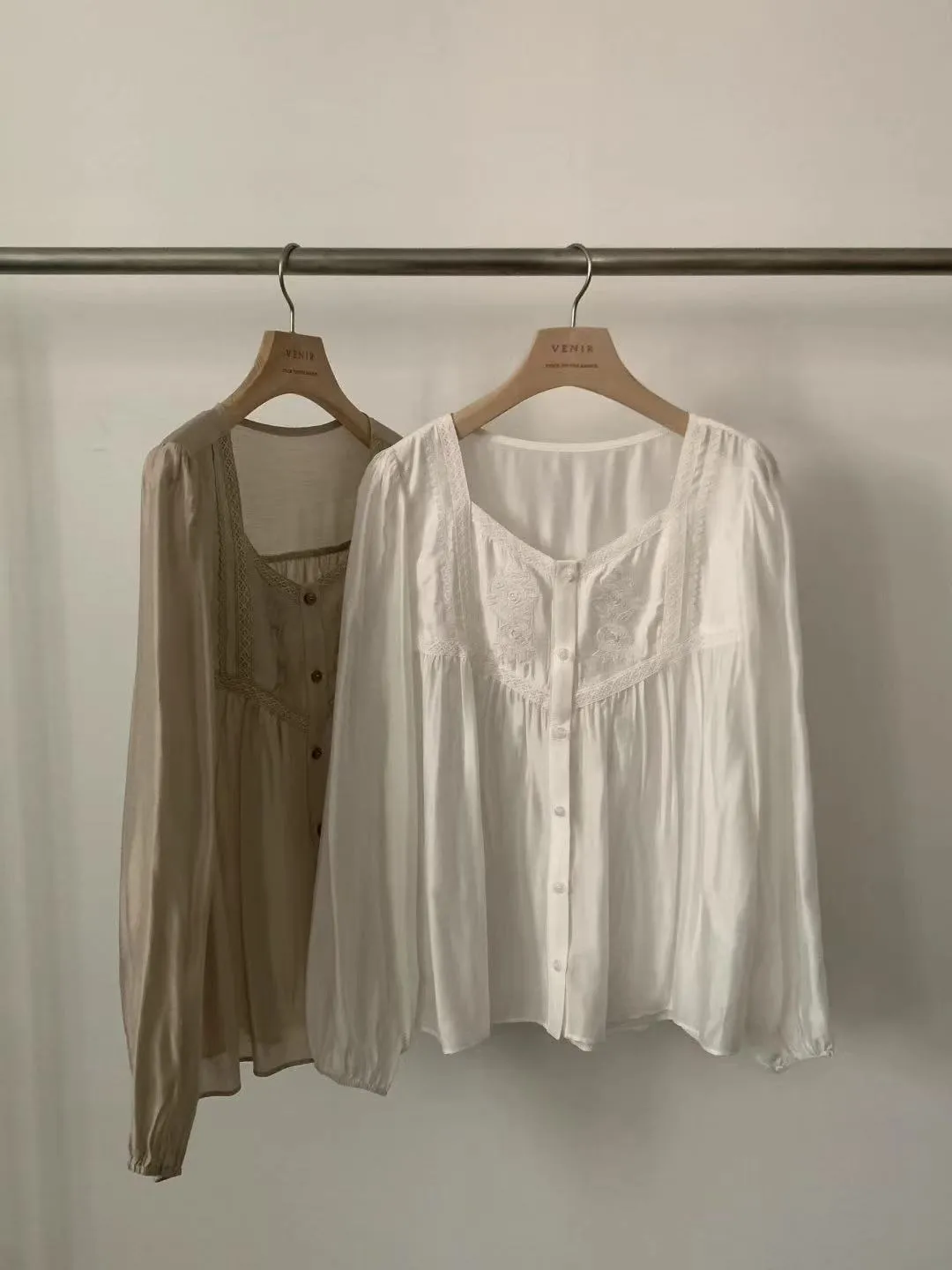 刺繡蕾絲V領長袖襯衫 氣質透膚法式上衣