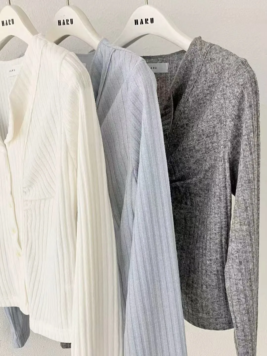 簡約羅紋針織長袖上衣 翻領排扣長袖