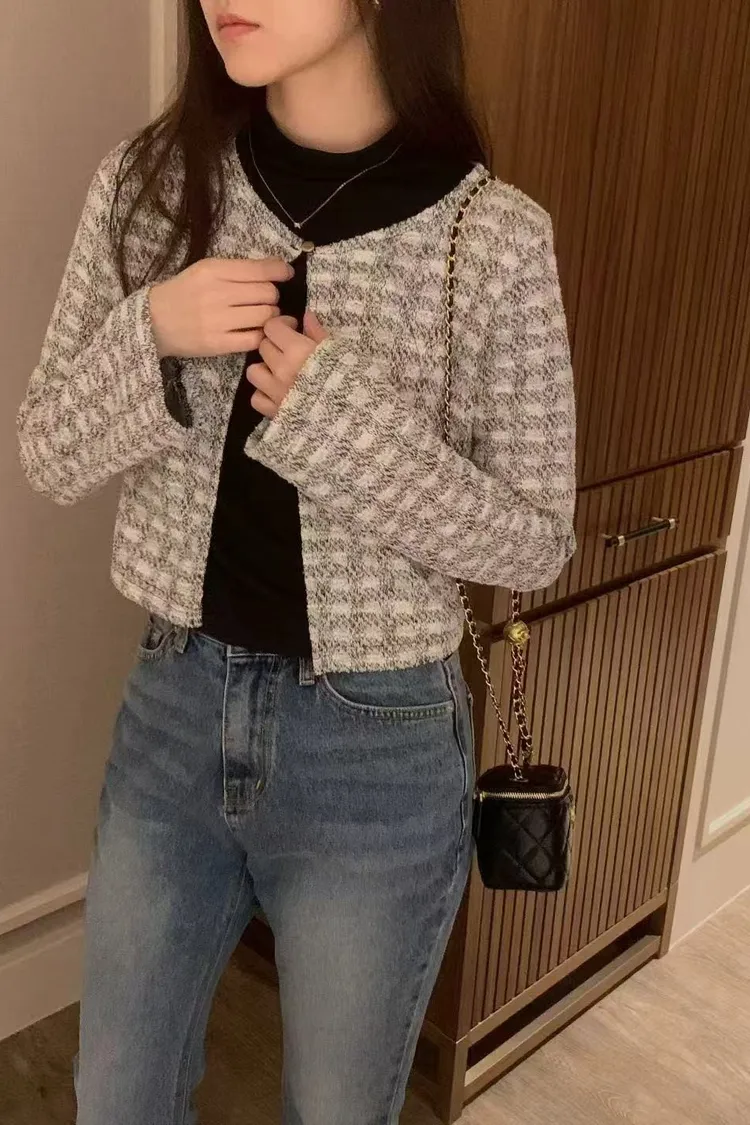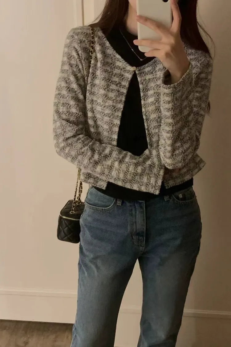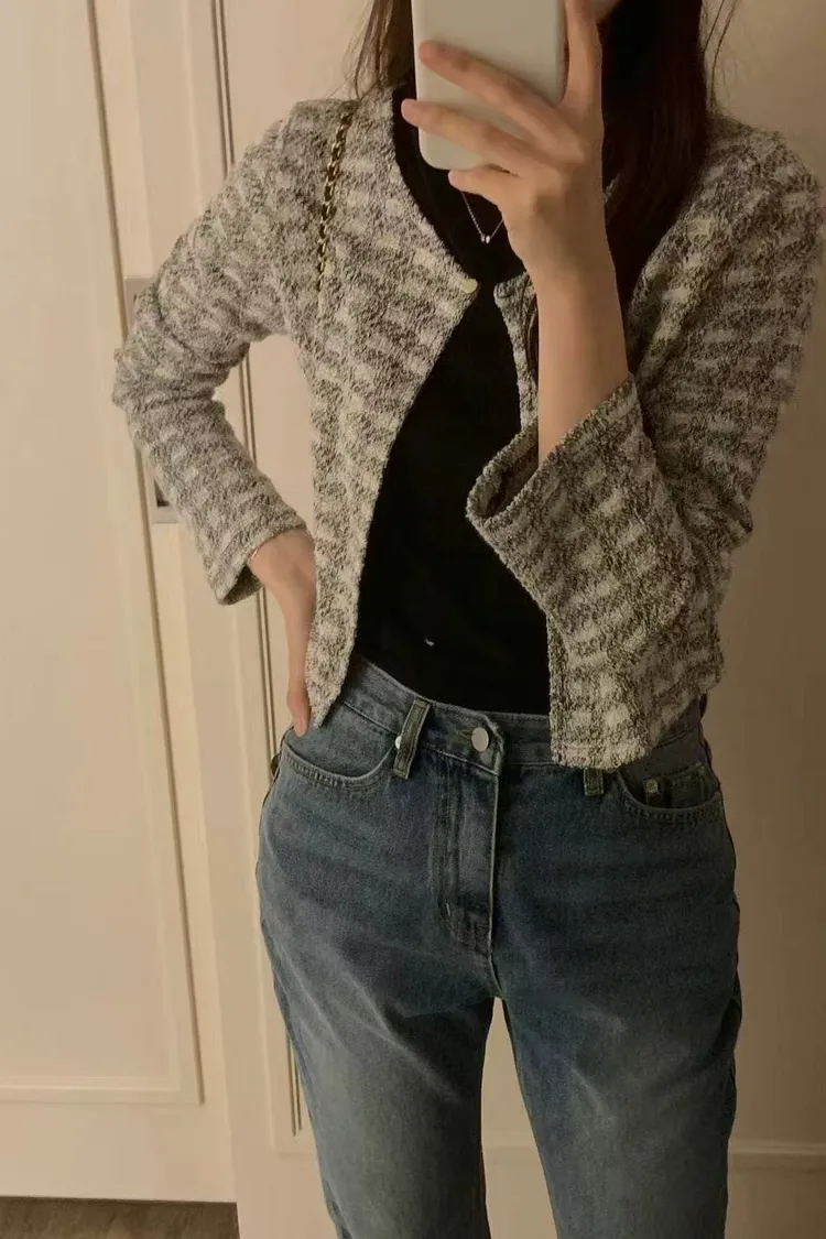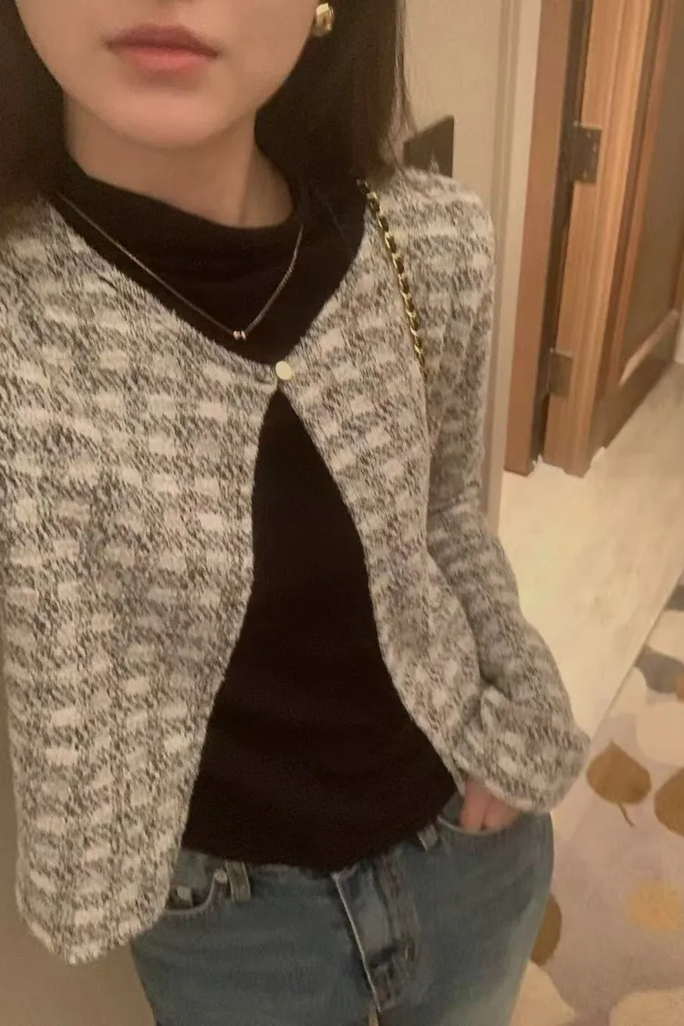 氣質粗花呢短版外套 圓領單釦設計感外套
