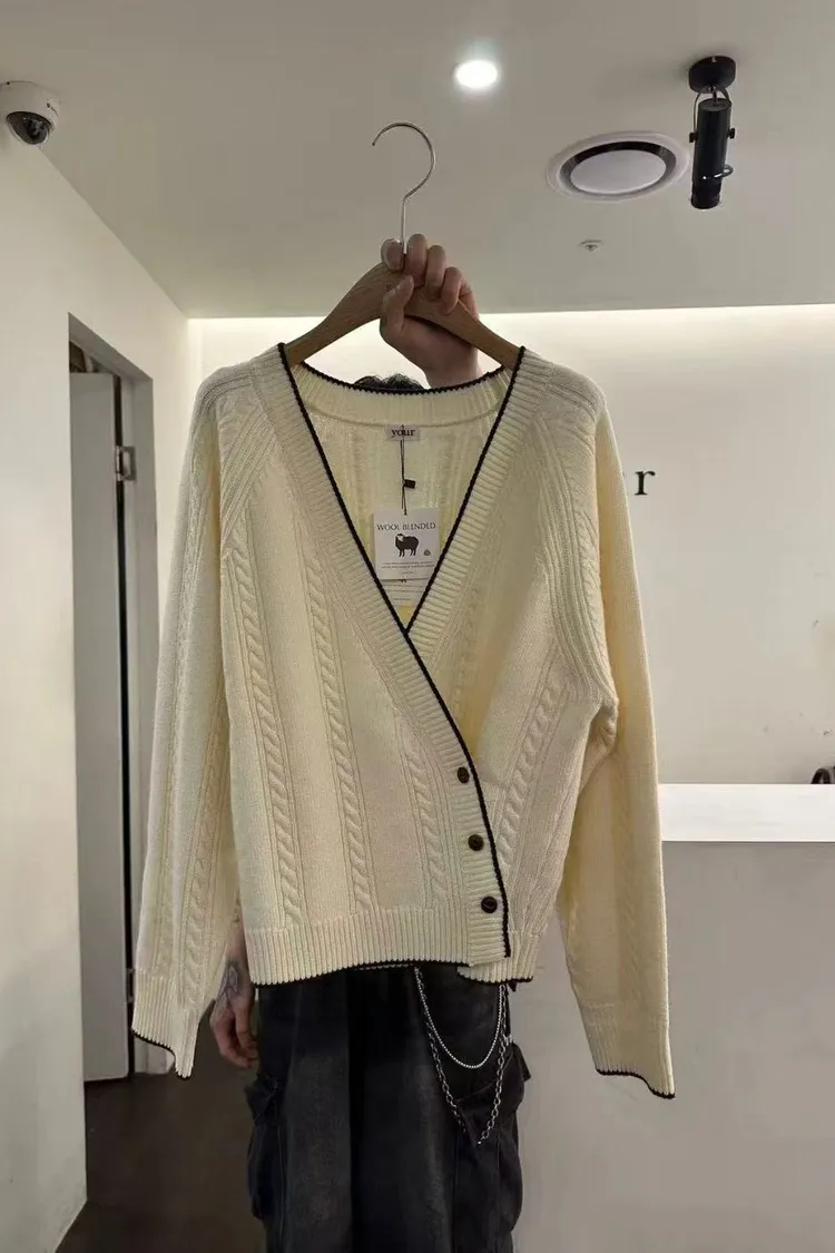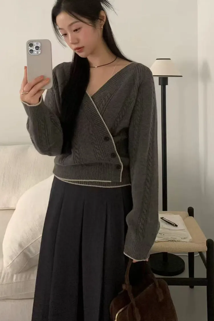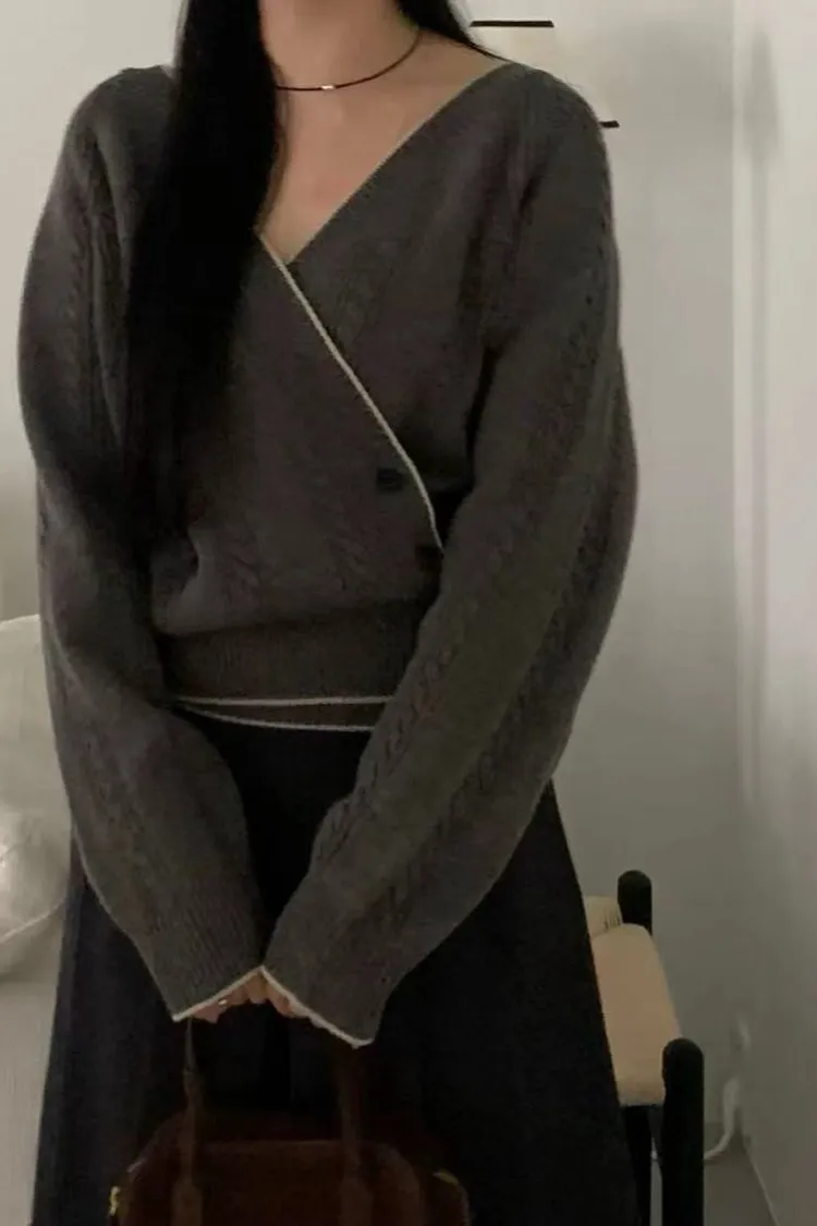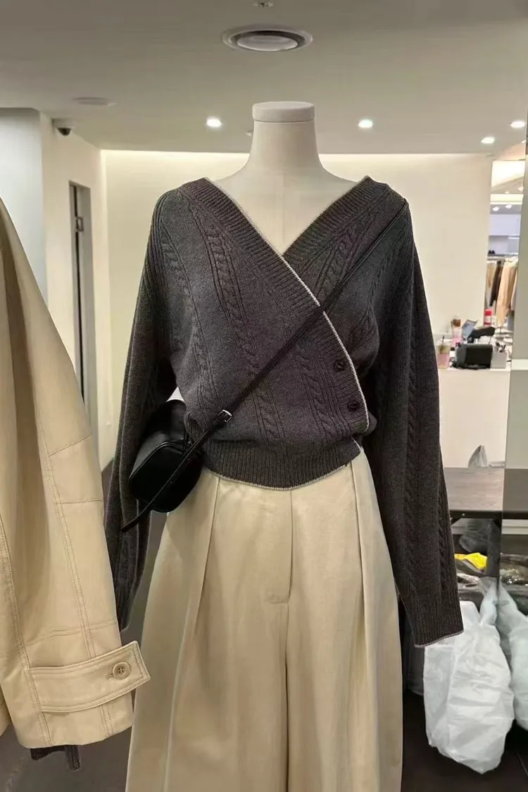 斜扣V領麻花針織上衣 V領交叉針織上衣