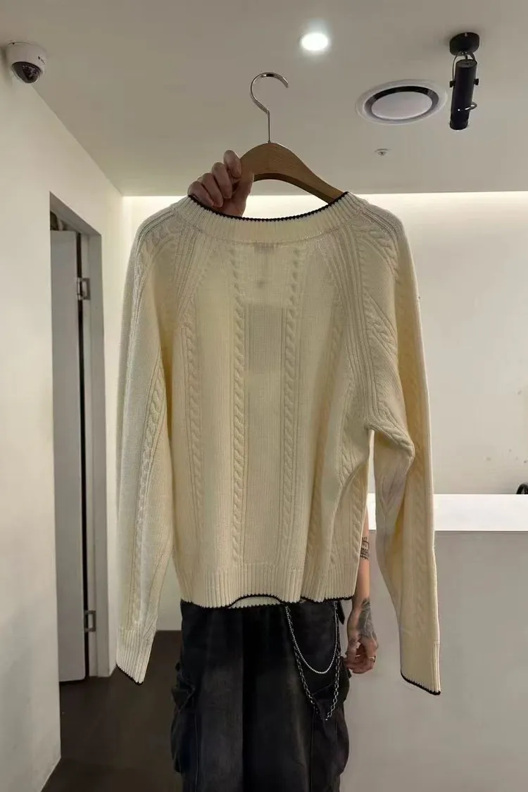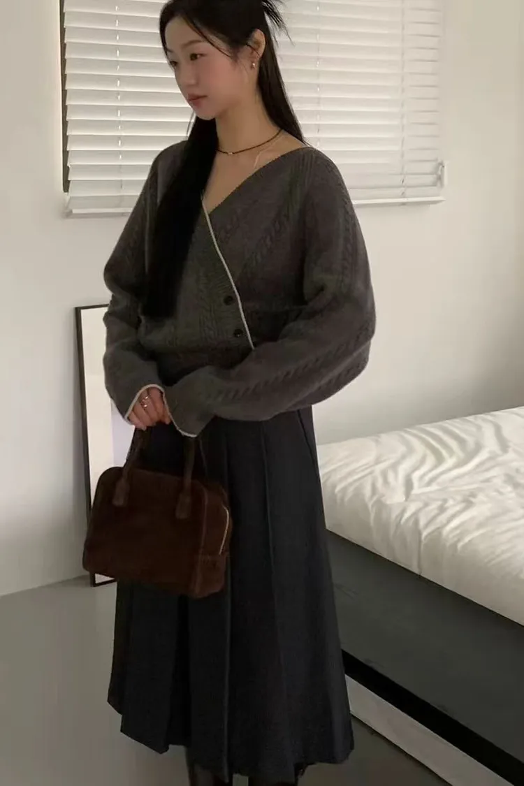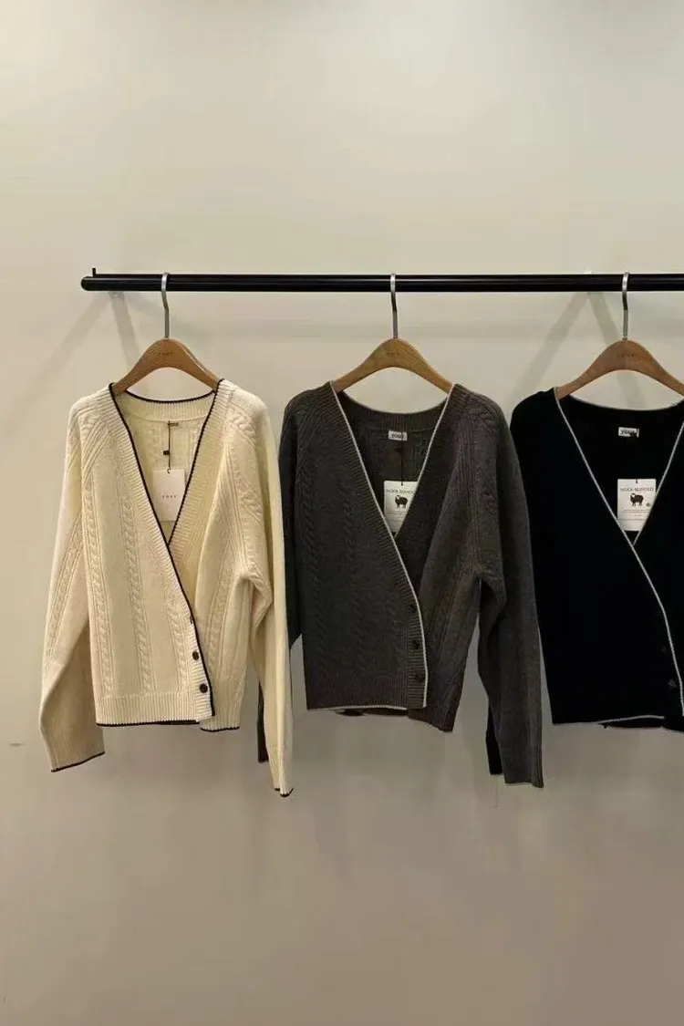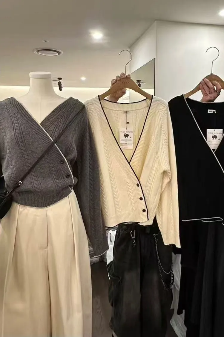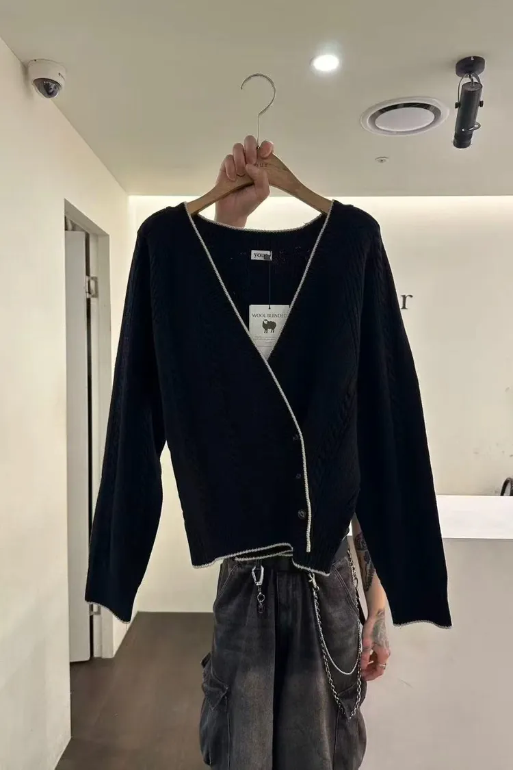 斜扣V領麻花針織上衣 V領交叉針織上衣