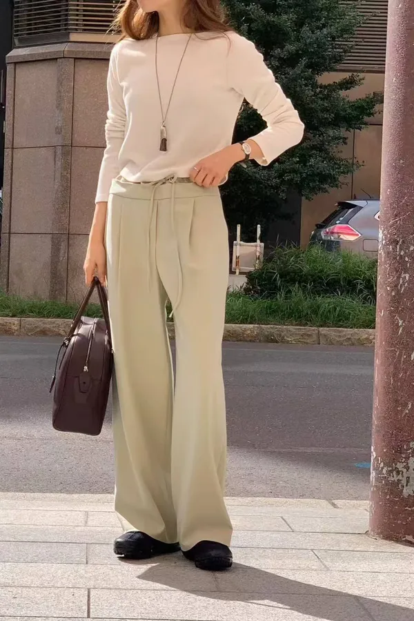 微露鎖骨長袖T 高腰寬褲套裝 百搭必收款