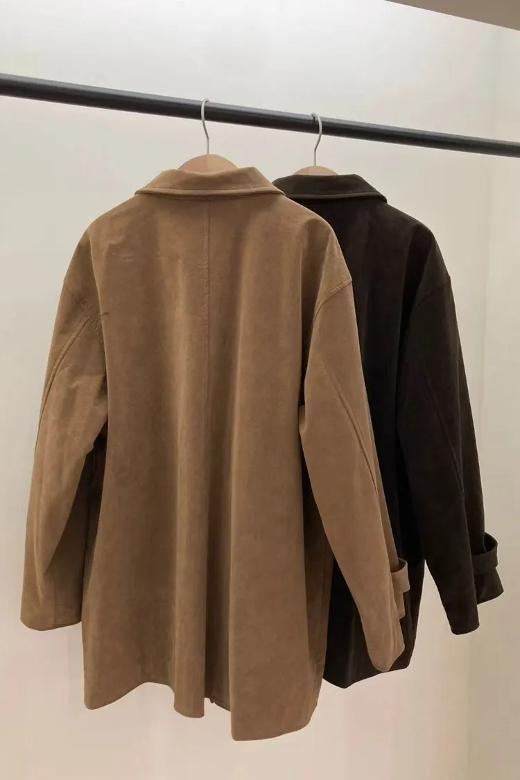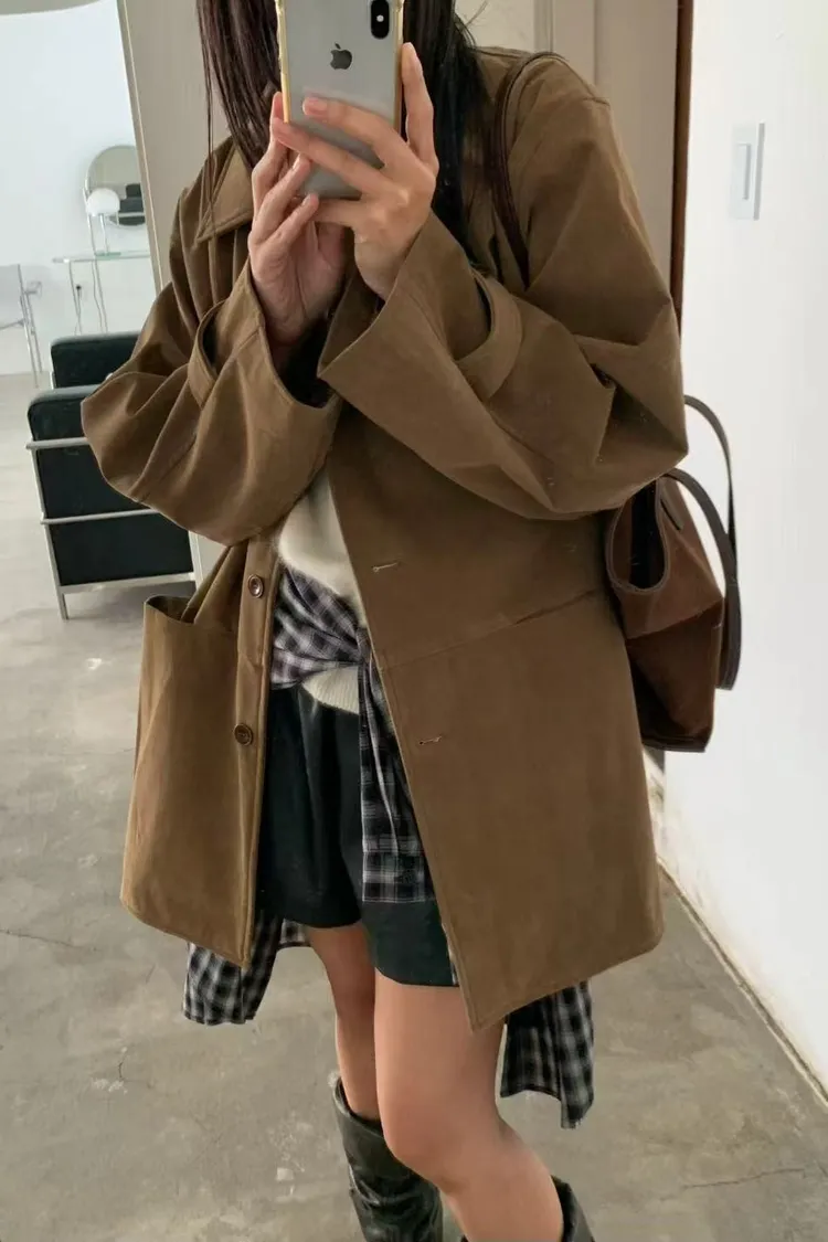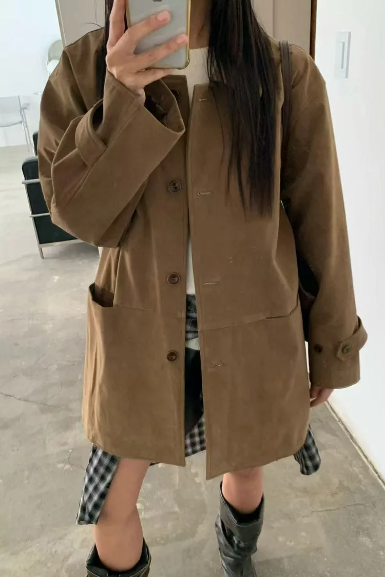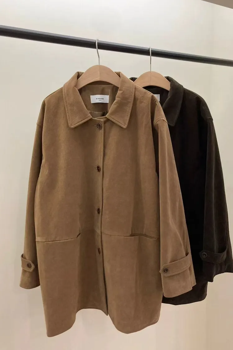 秋冬質感麂皮風外套 麂皮翻領中長版外套