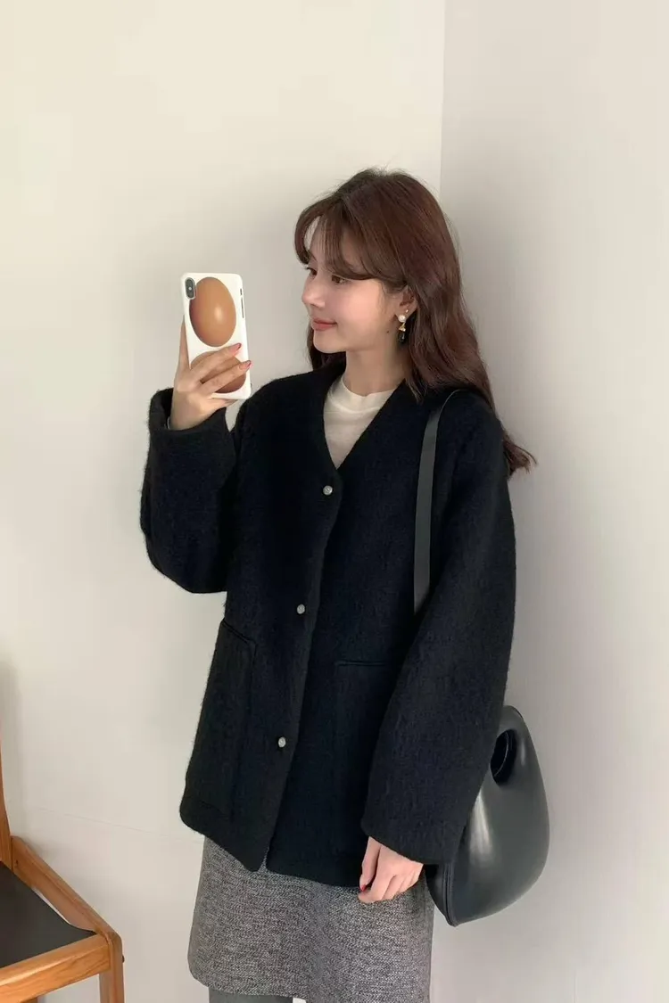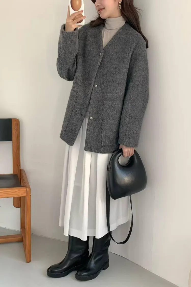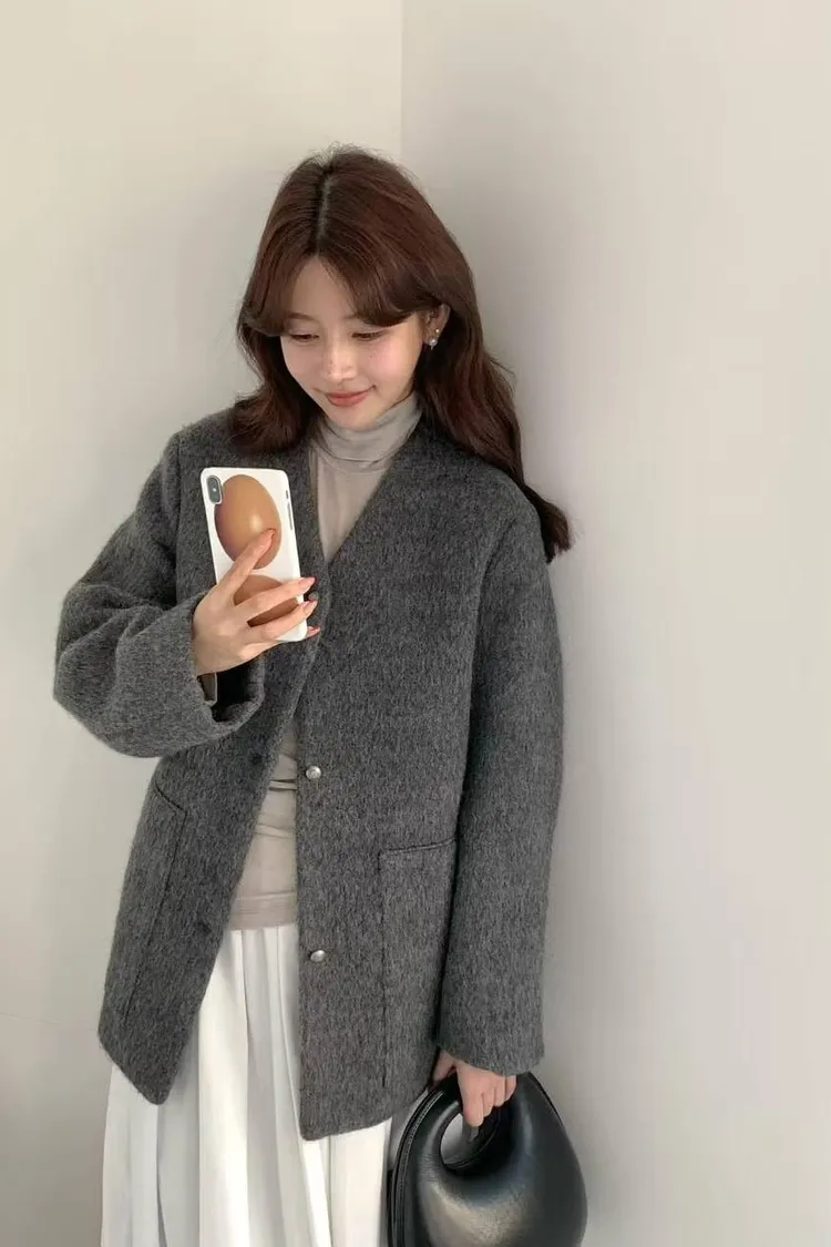 韓國代購 egg 雞蛋家 羊絨羊毛v領大衣外套 短版大衣外套