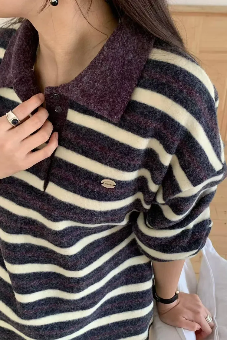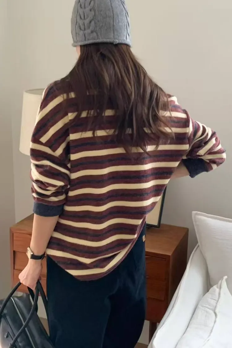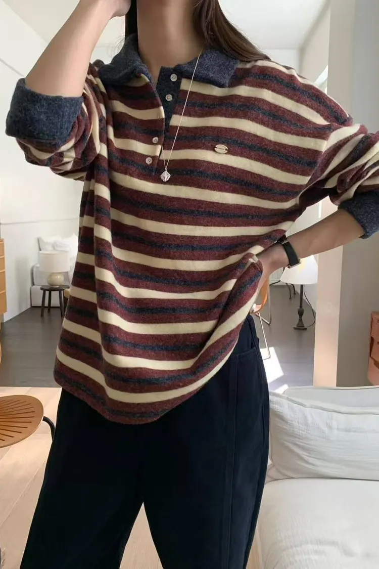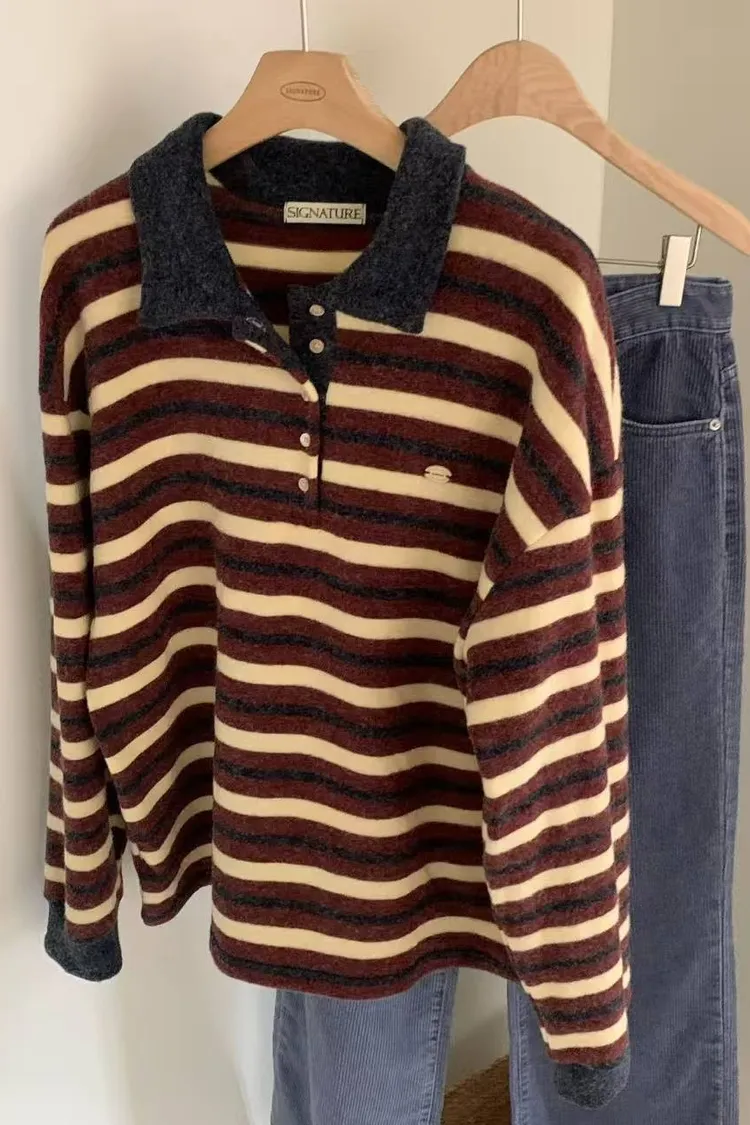 韓國代購 爆款 內刷毛條紋衫 POLO翻領條紋上衣