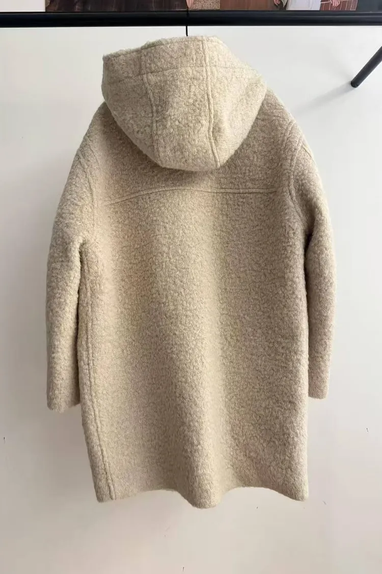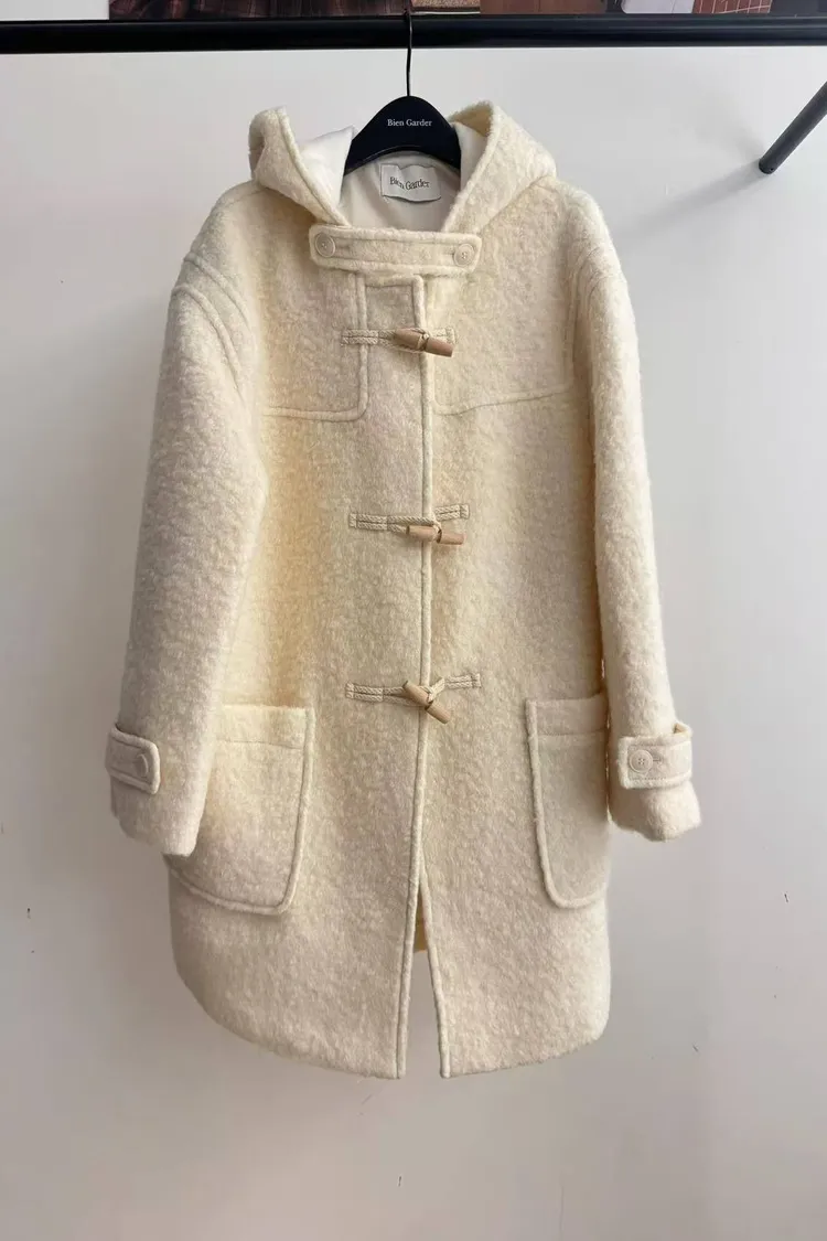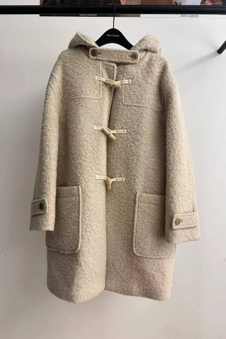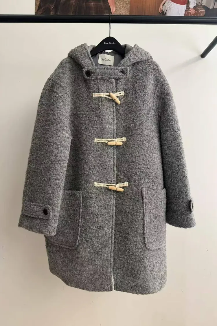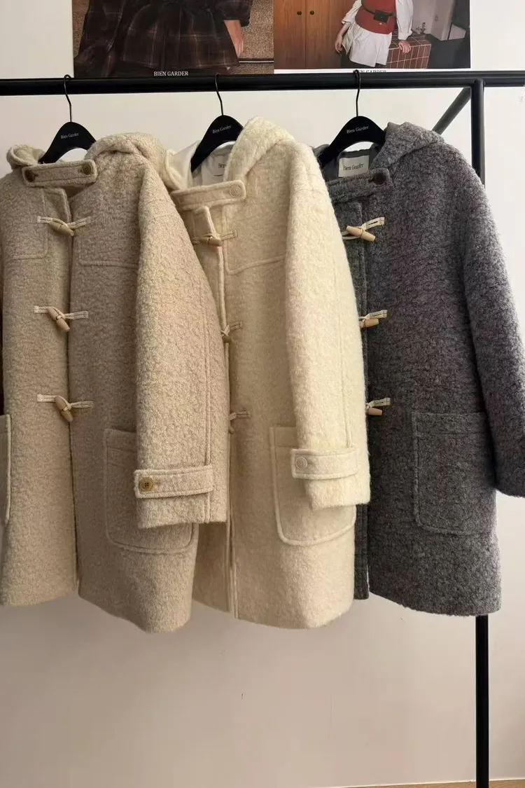 韓國代購 冬季新款 羊毛牛角扣連帽外套 中長款大衣外套