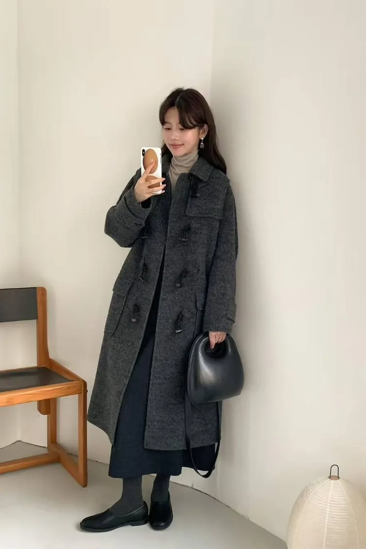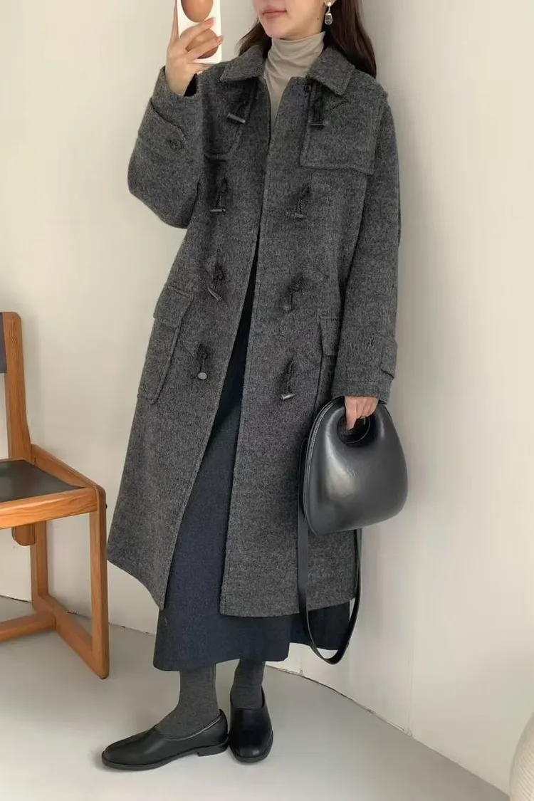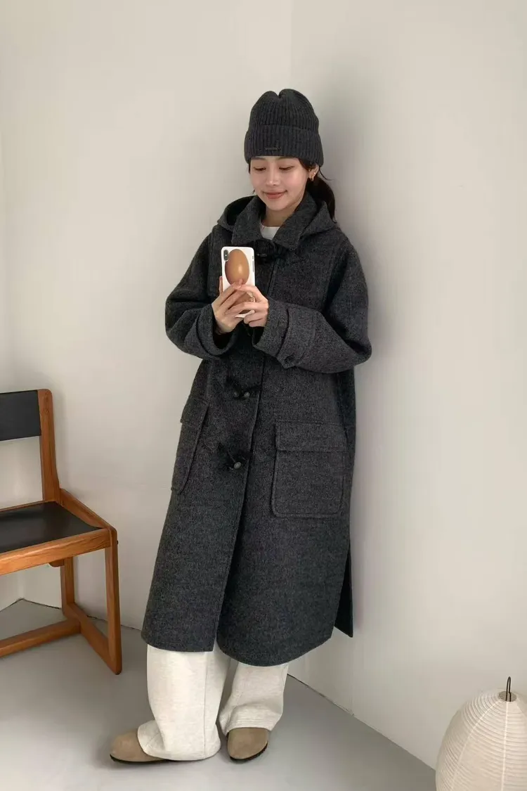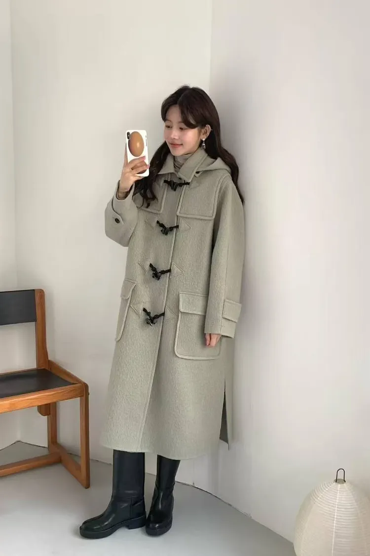 韓國代購 egg 雞蛋家 質感 羊絨羊毛牛角扣大衣外套 長版大衣外套