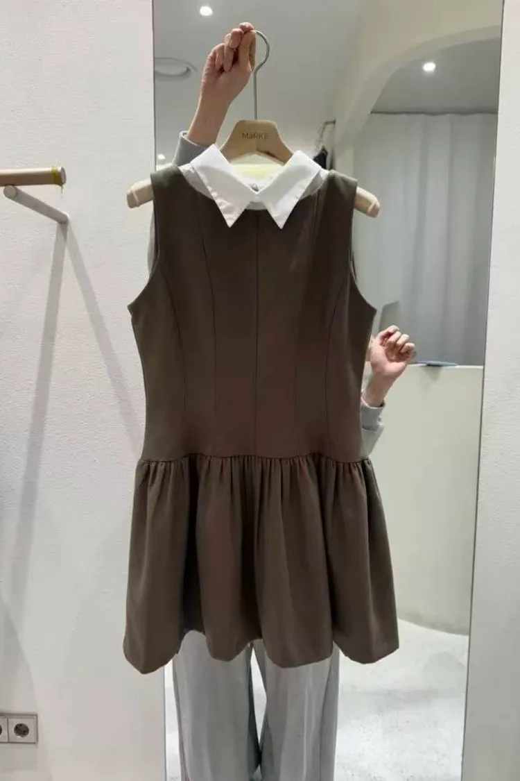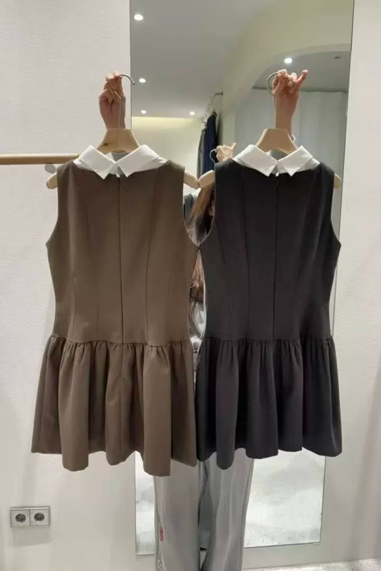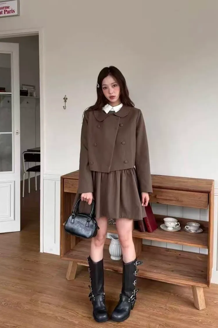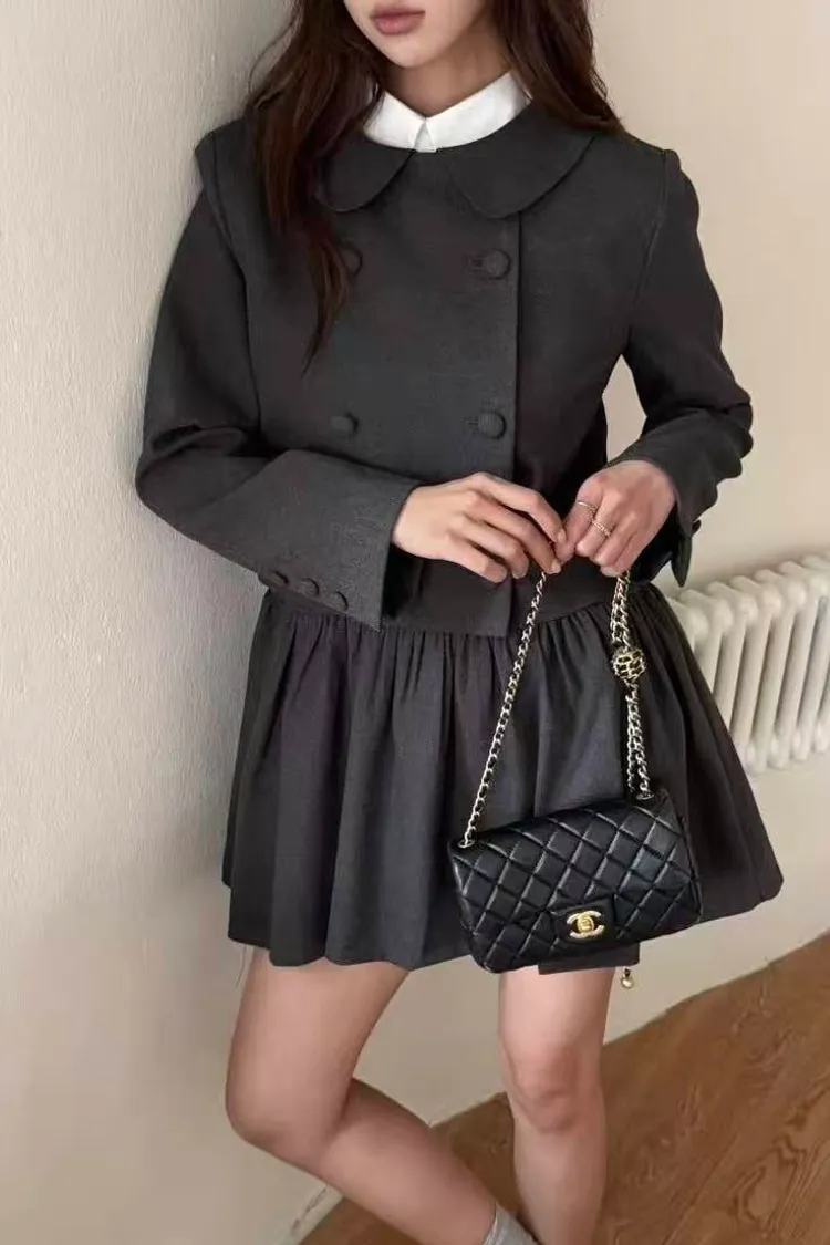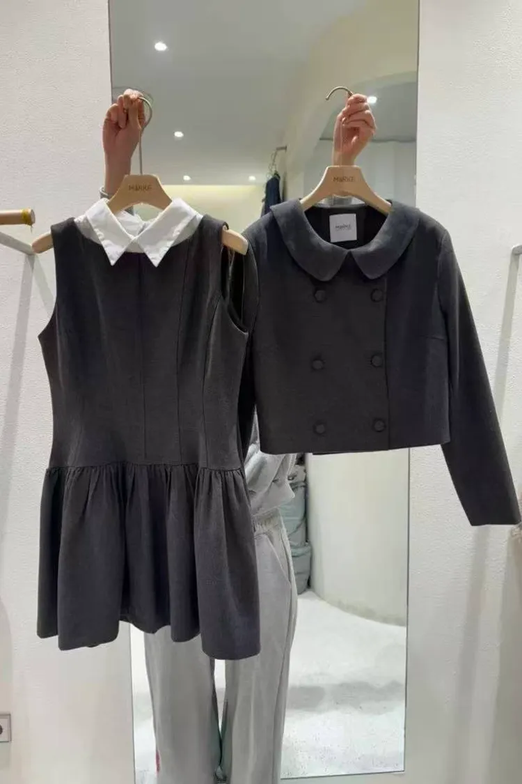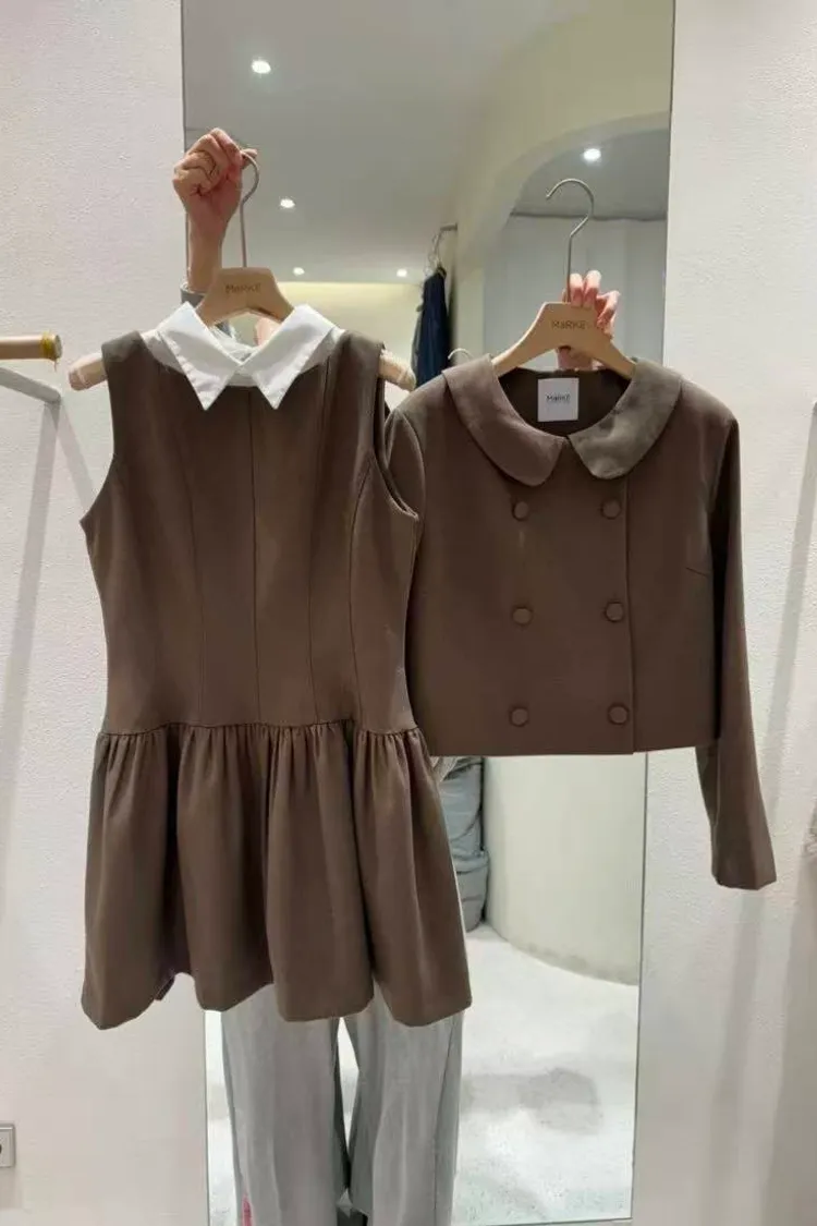 韓國代購 娃娃領雙排扣短外套 無袖連身裙套裝
