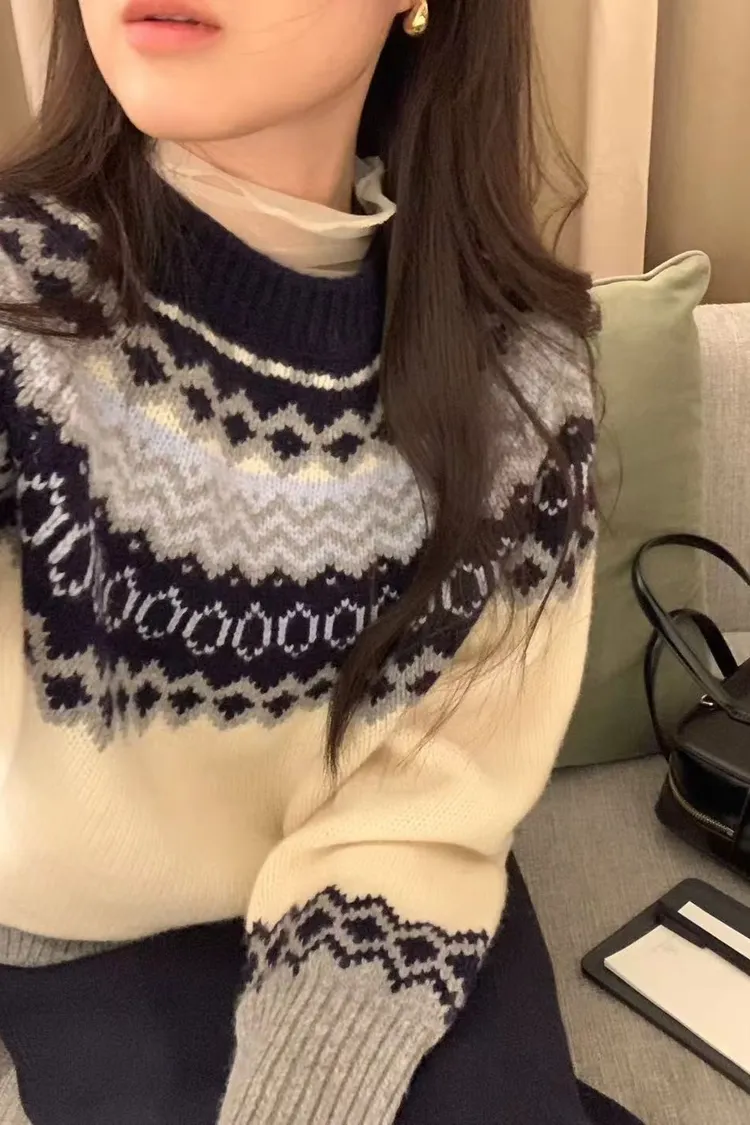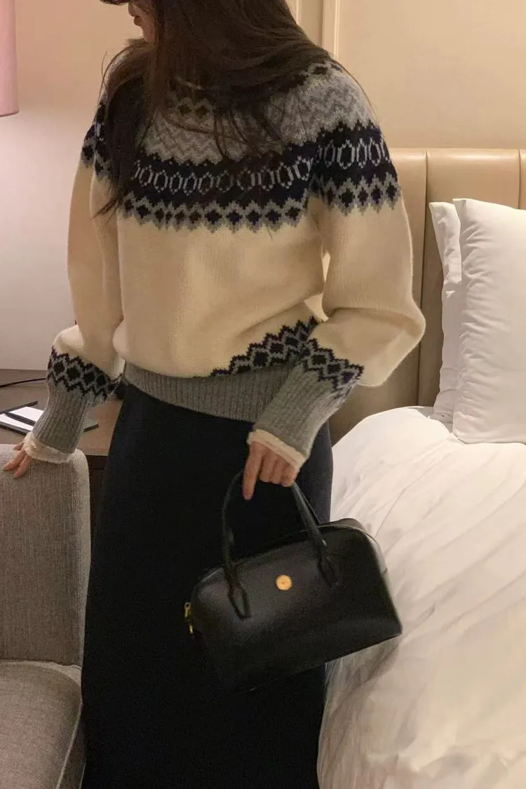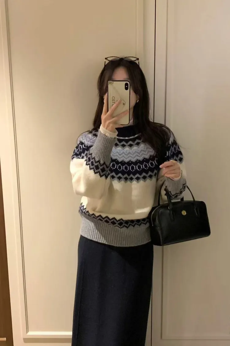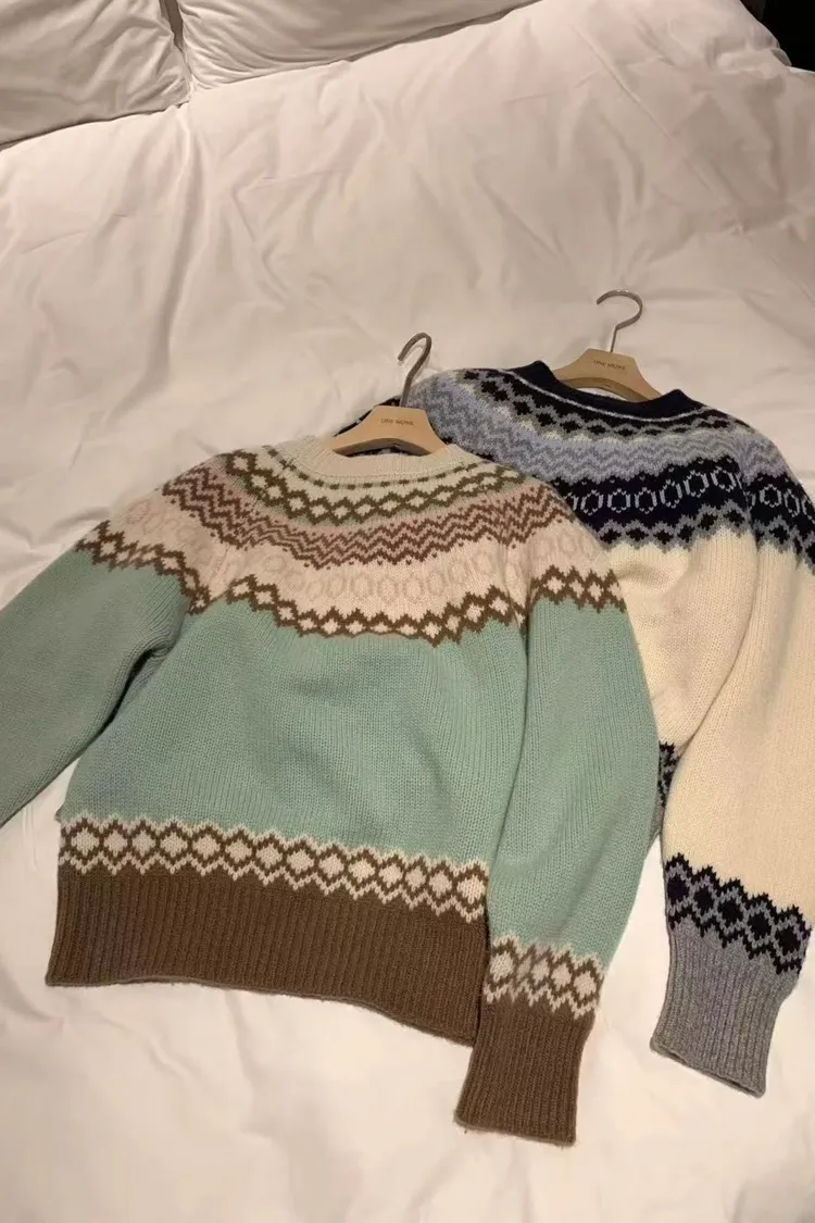 韓國代購 ONE MONE 羊毛100% 拼接圖騰配色毛衣 保暖上衣 長袖T恤