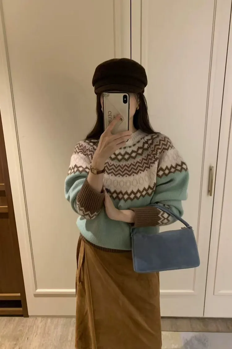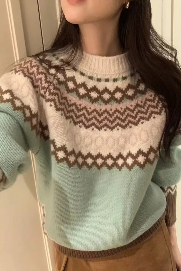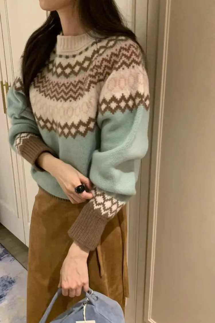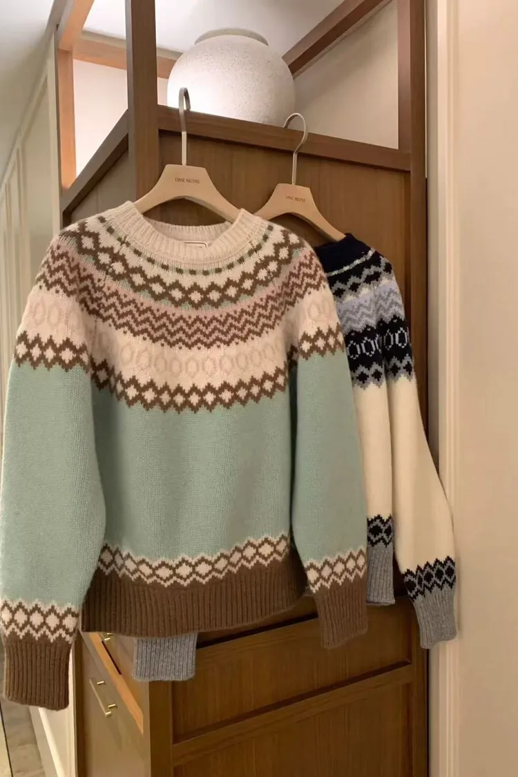 韓國代購 ONE MONE 羊毛100% 拼接圖騰配色毛衣 保暖上衣 長袖T恤