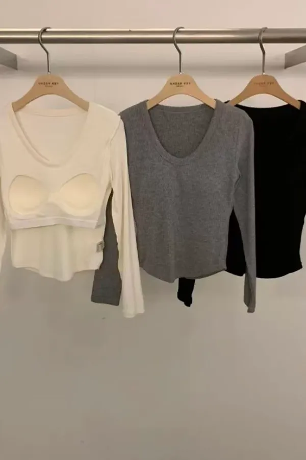 韓國代購 under key 坑紋胸墊U領長袖內搭 打底衣