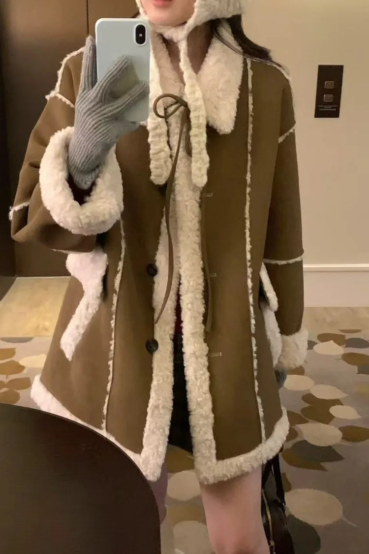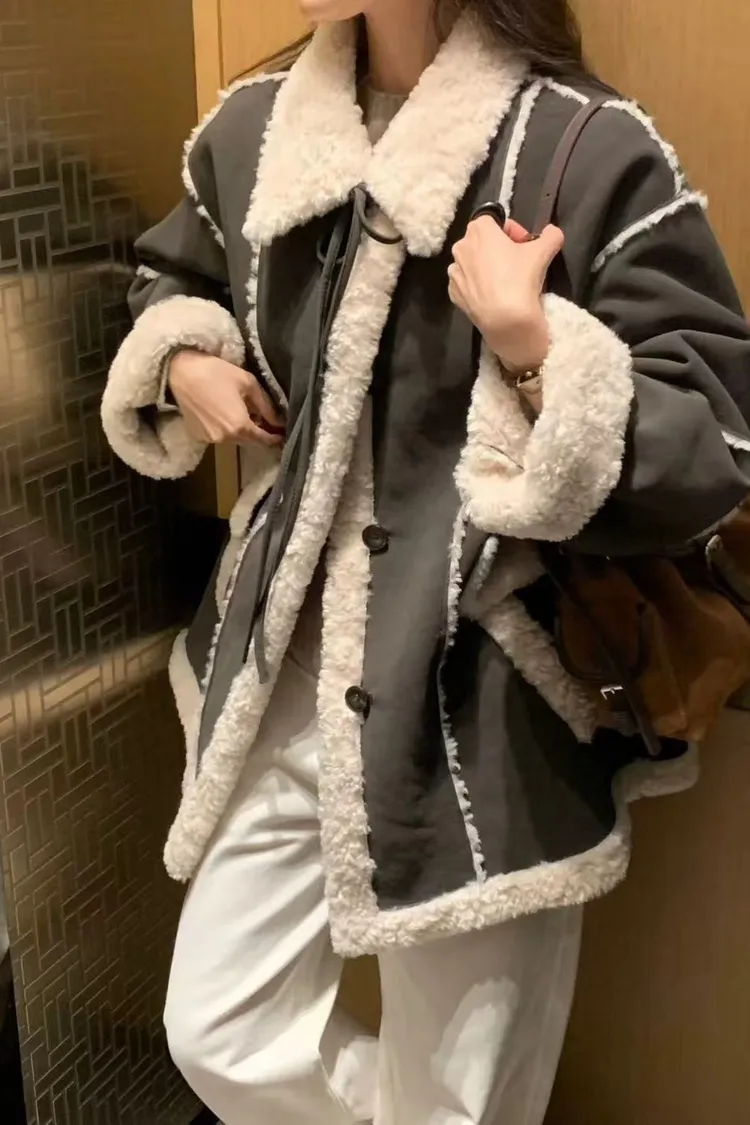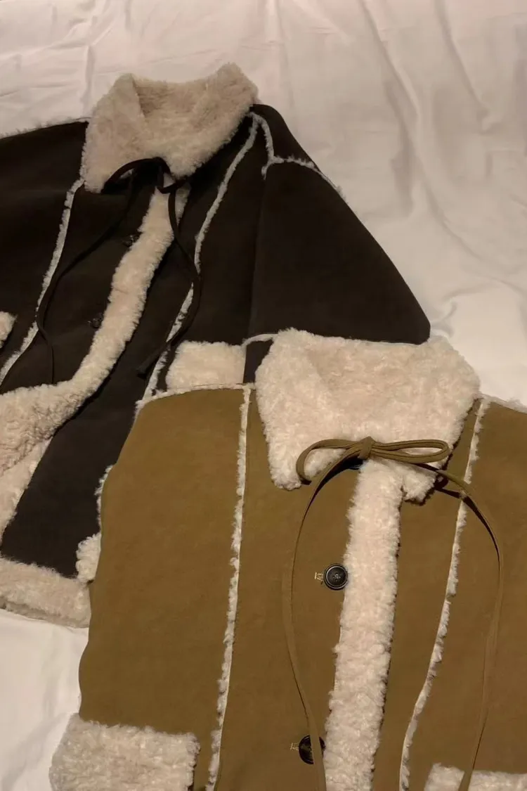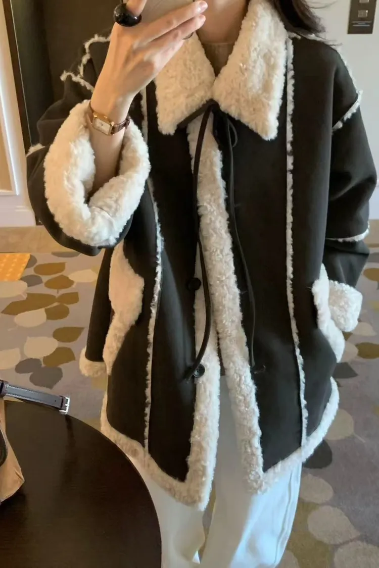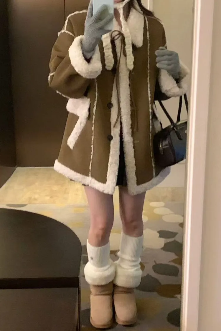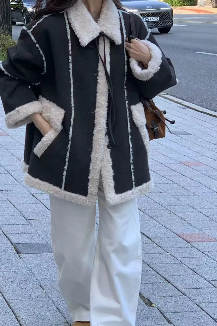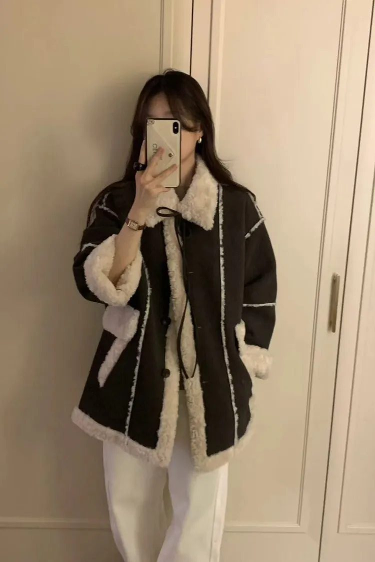 韓國代購 ONE MONE 保暖拼色設計 羊毛外套 毛毛外套