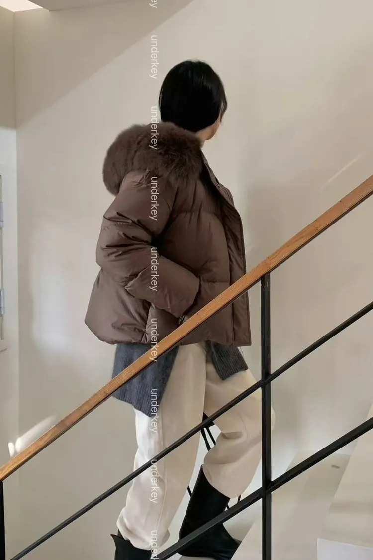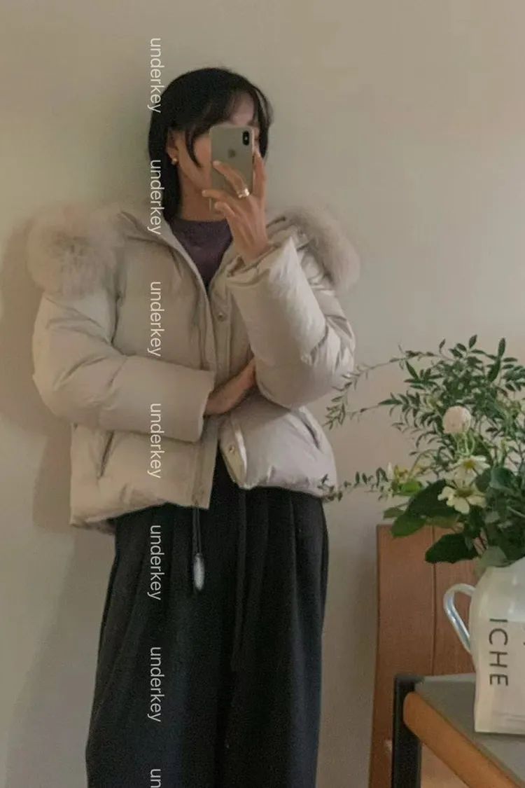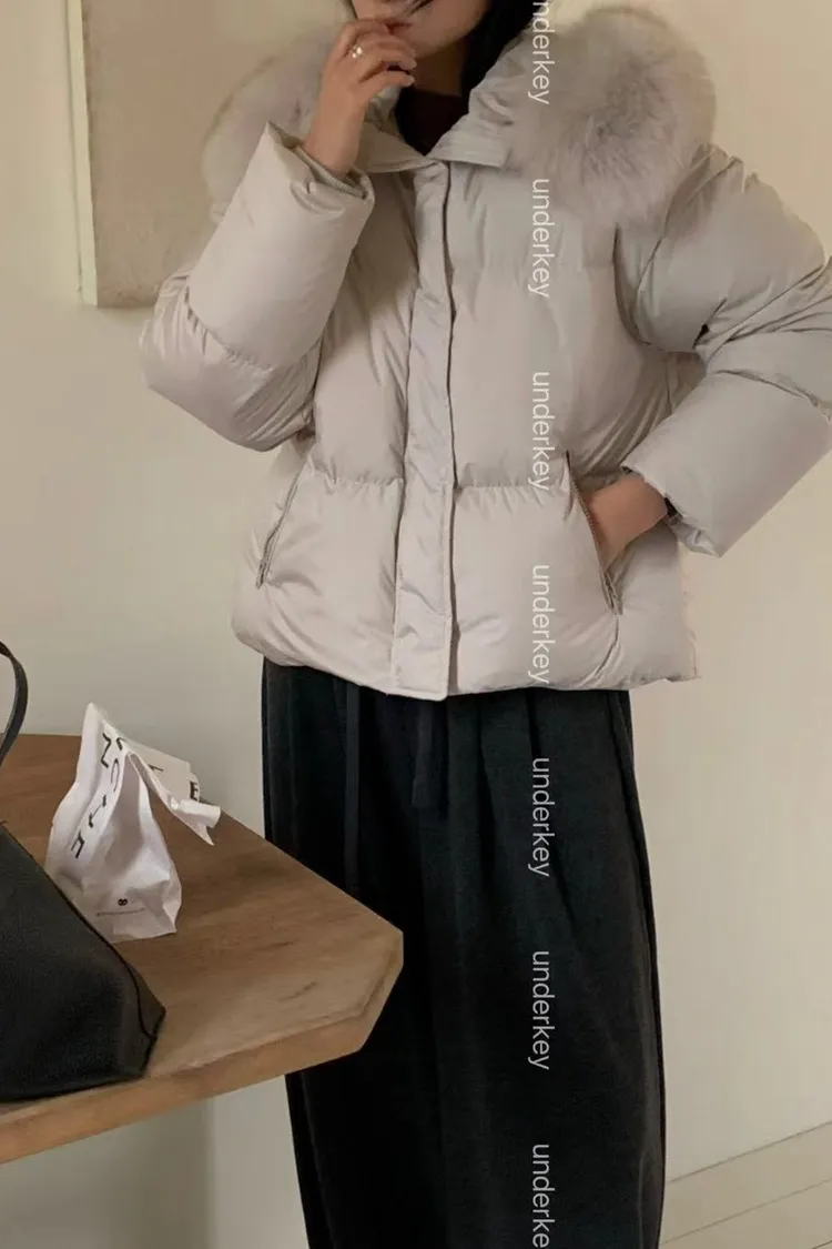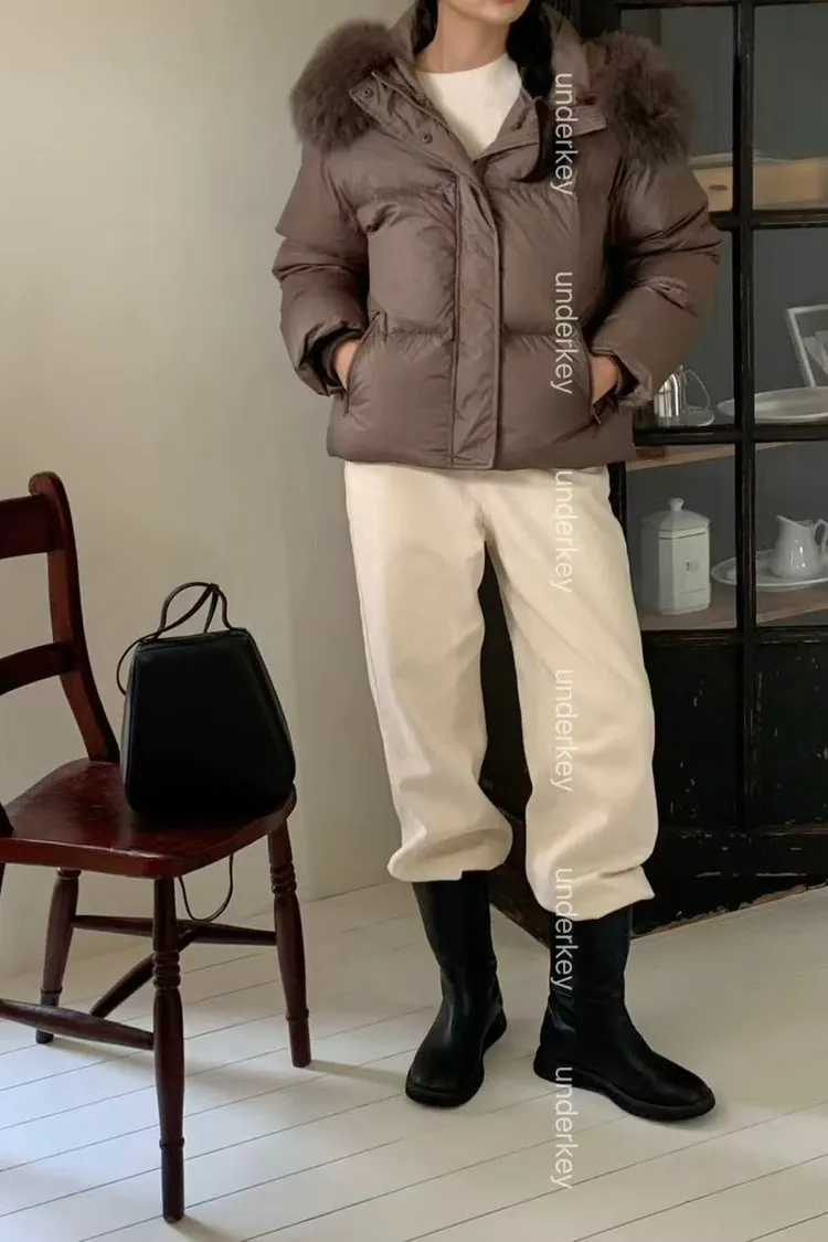 韓國東大門代購 2025冬季女裝 鴨絨毛毛連帽抽繩羽絨外套