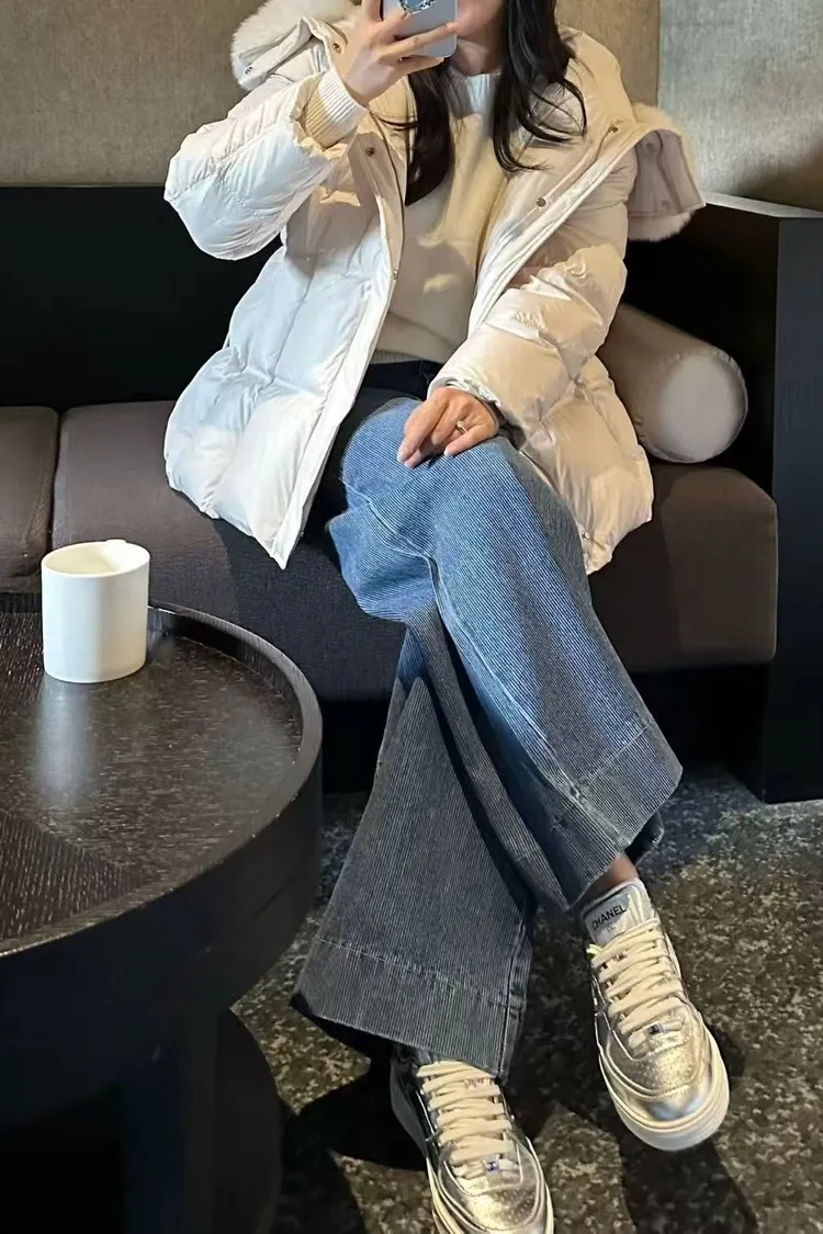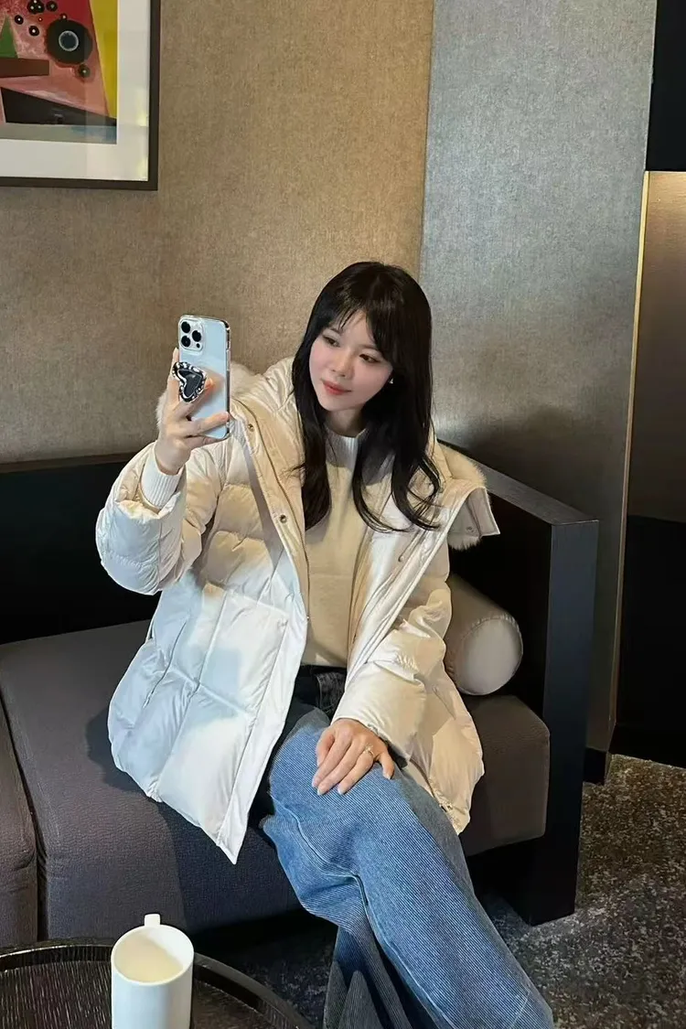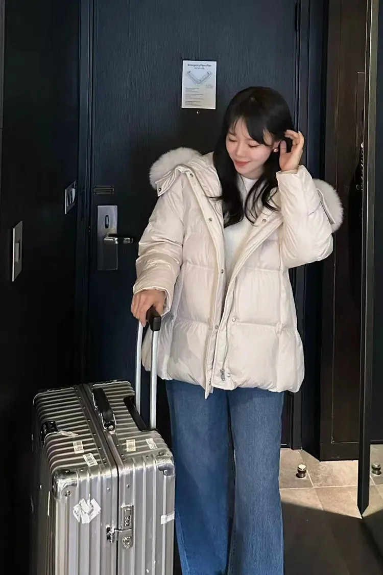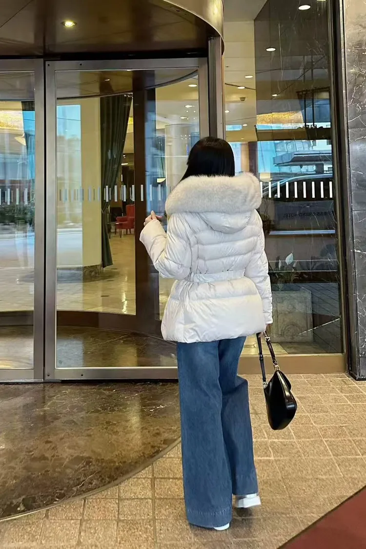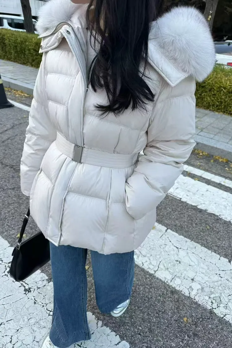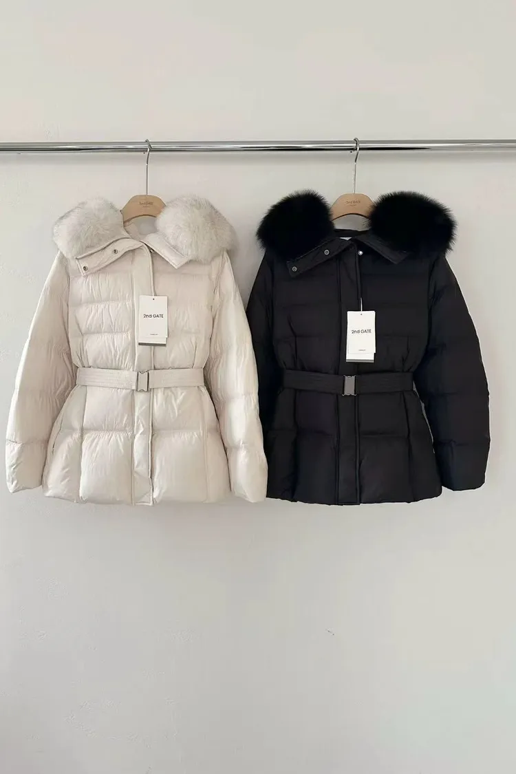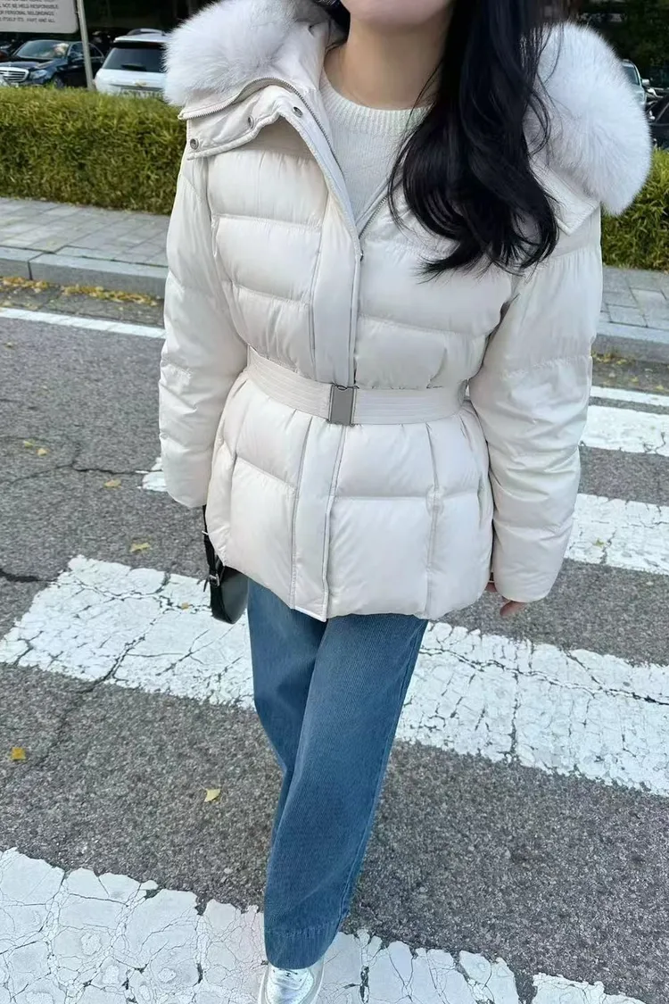 韓國連線款 鵝絨100% 收腰設計 狐狸毛領連帽羽絨外套 保暖外套
