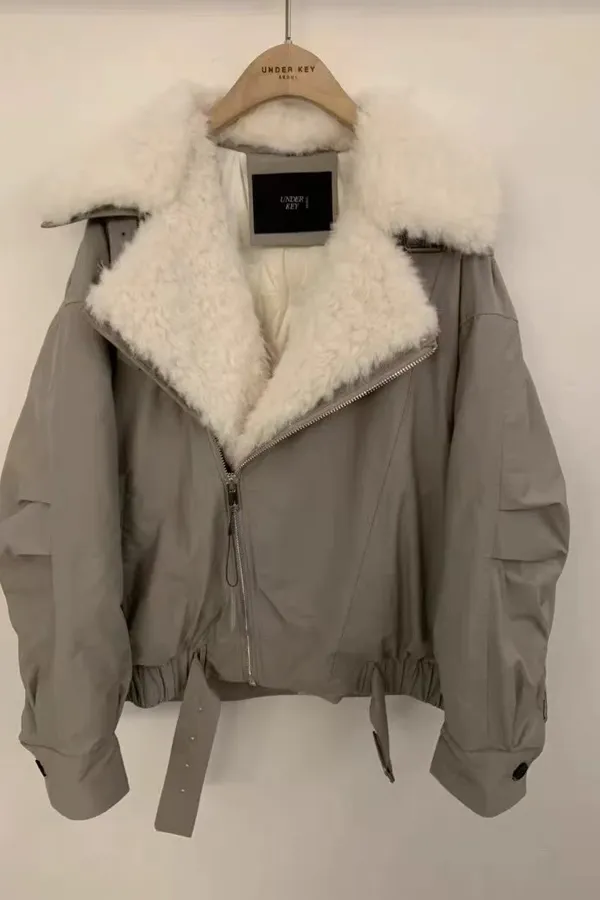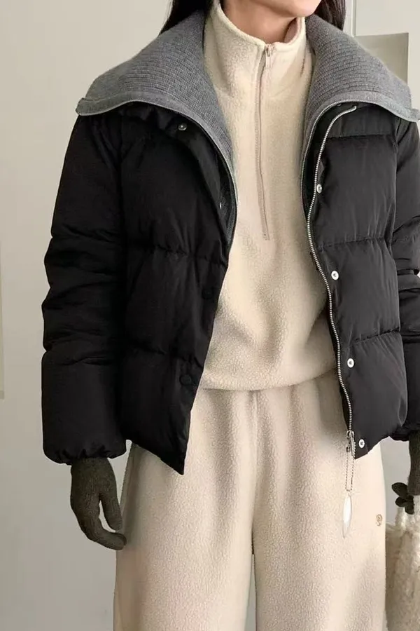 韓國連線款 斜拉鍊設計 鴨絨拚羊羔毛保暖外套 羽絨外套