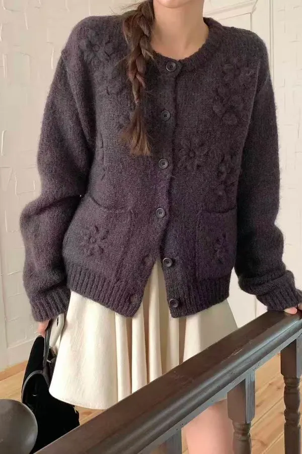 韓國連線款 手工刺繡 圓領羊毛針織外套