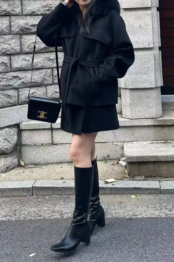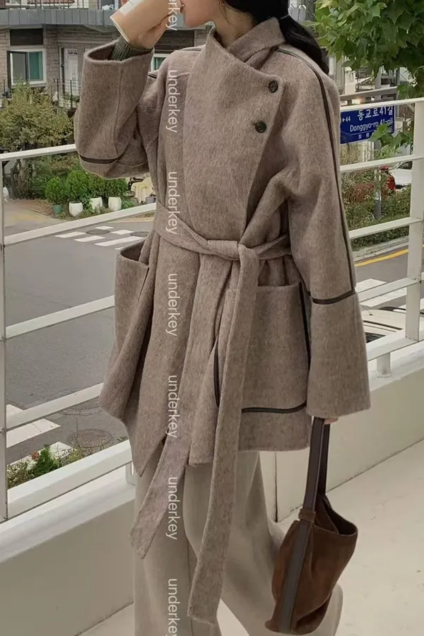 韓國連線款 設計感 羊毛綁帶大衣外套 中長版大衣外套