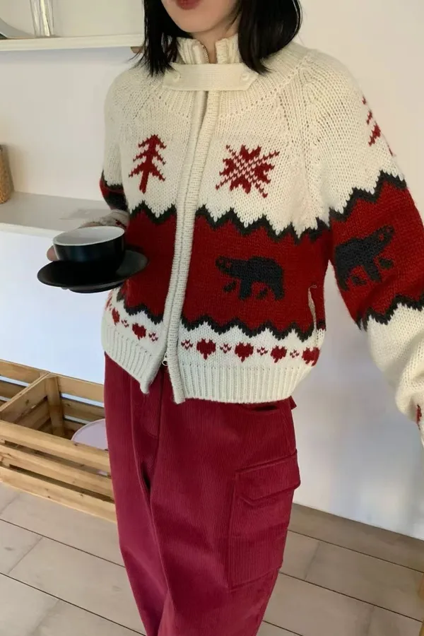 韓國代購 客人許願款 聖誕節風 撞色高領拉鍊外套 針織外套