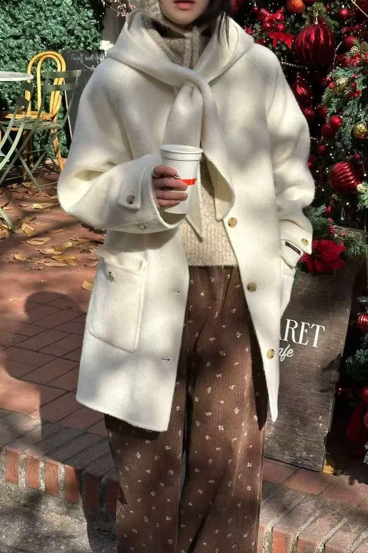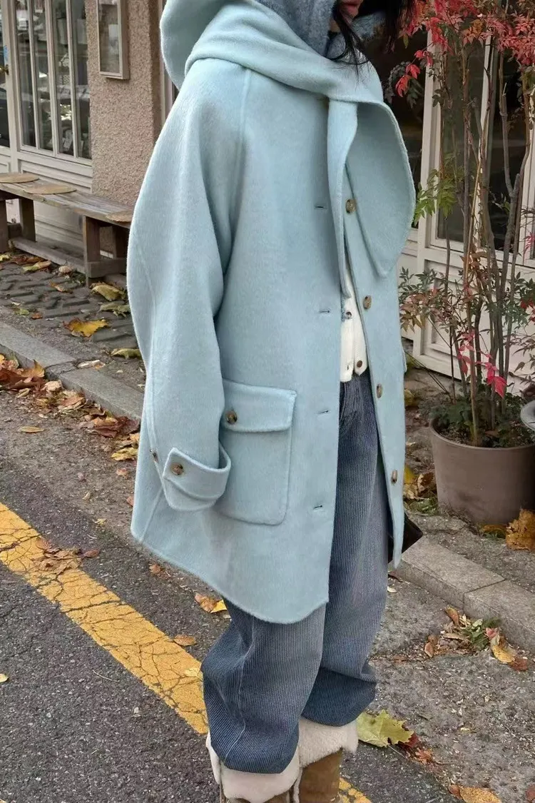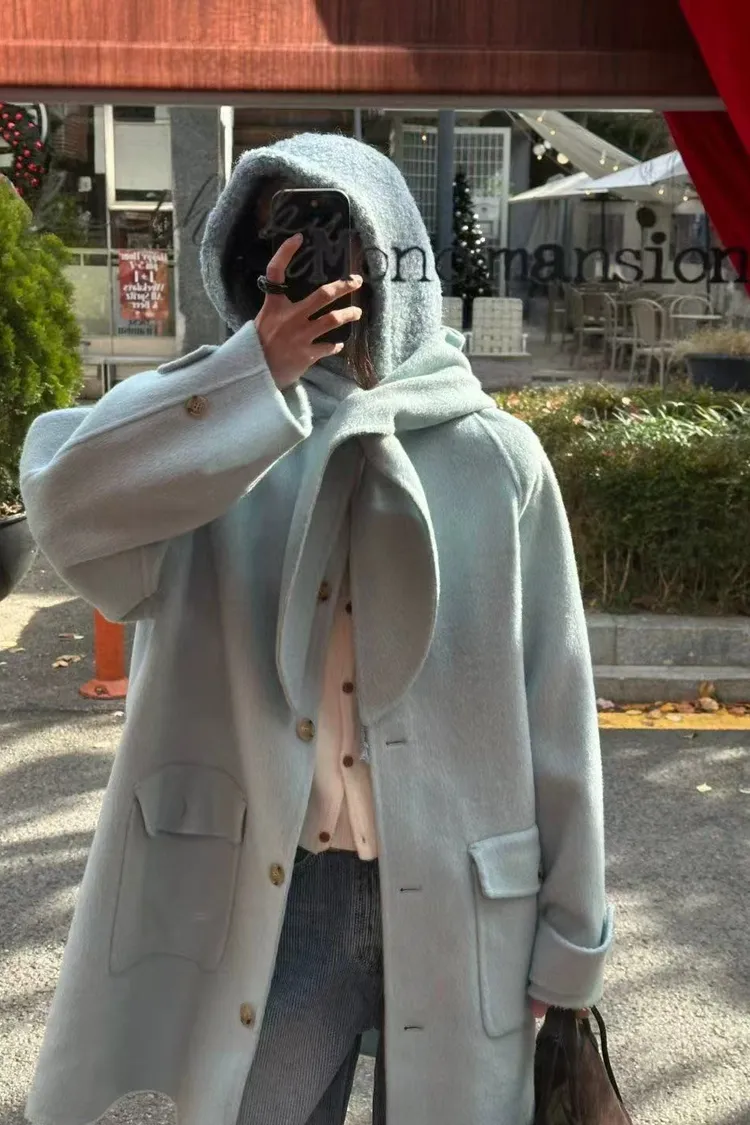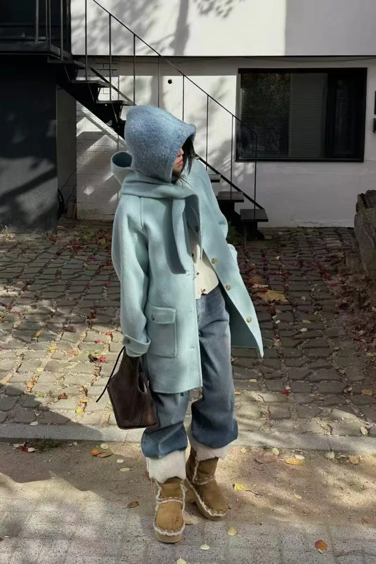 韓國連線款 冬季新款 羊毛 中長版連帽圍巾大衣外套 中長版大衣外套