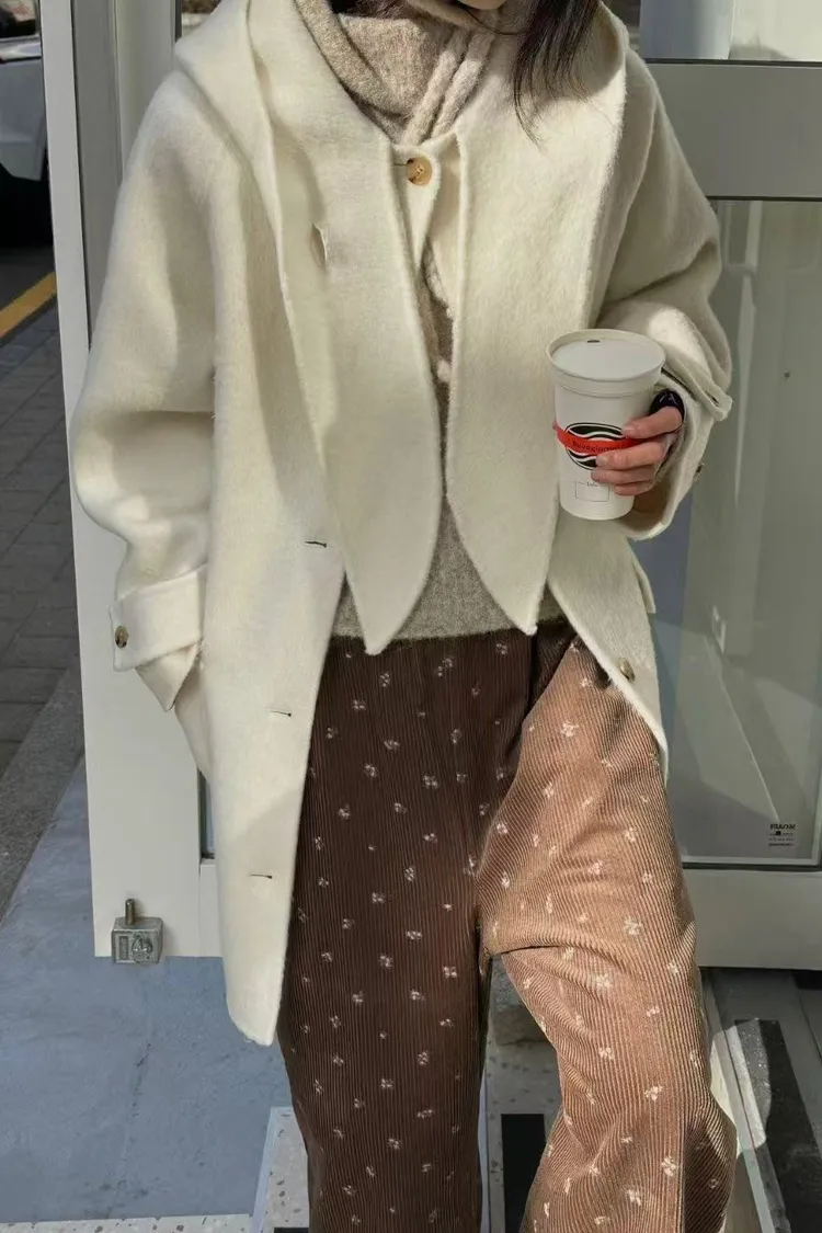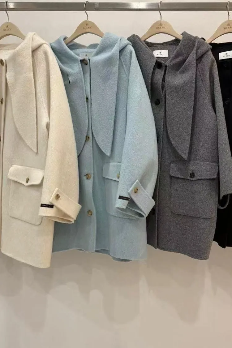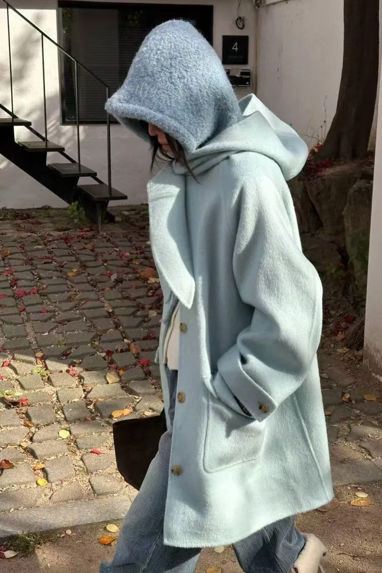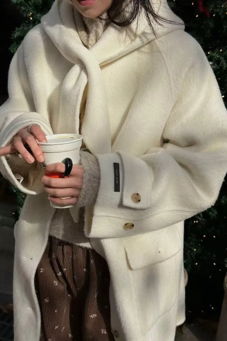 韓國連線款 冬季新款 羊毛 中長版連帽圍巾大衣外套 中長版大衣外套