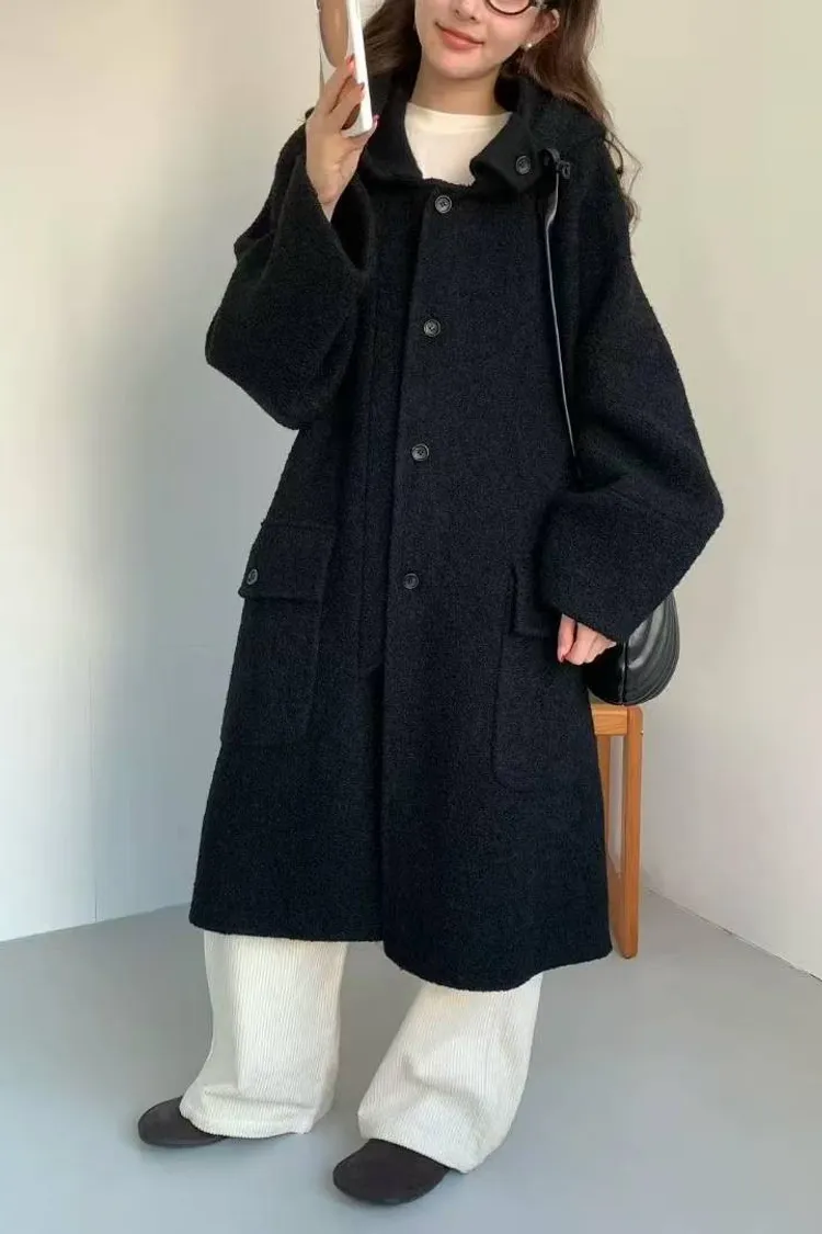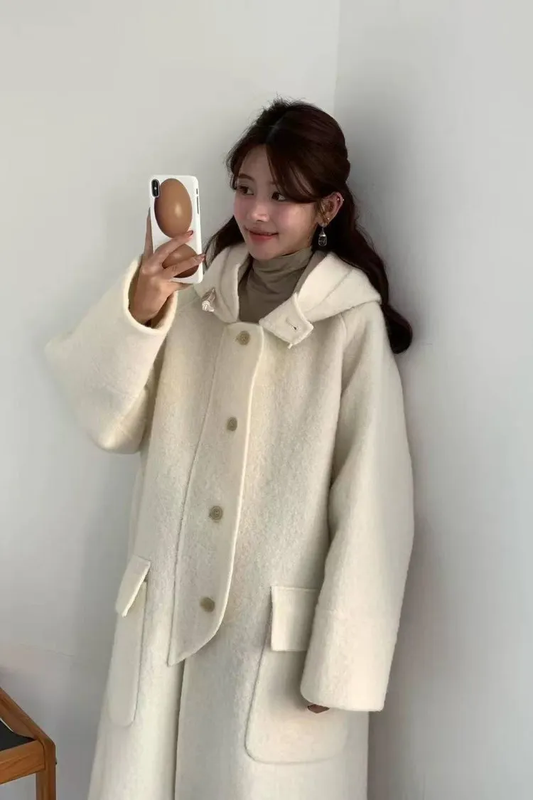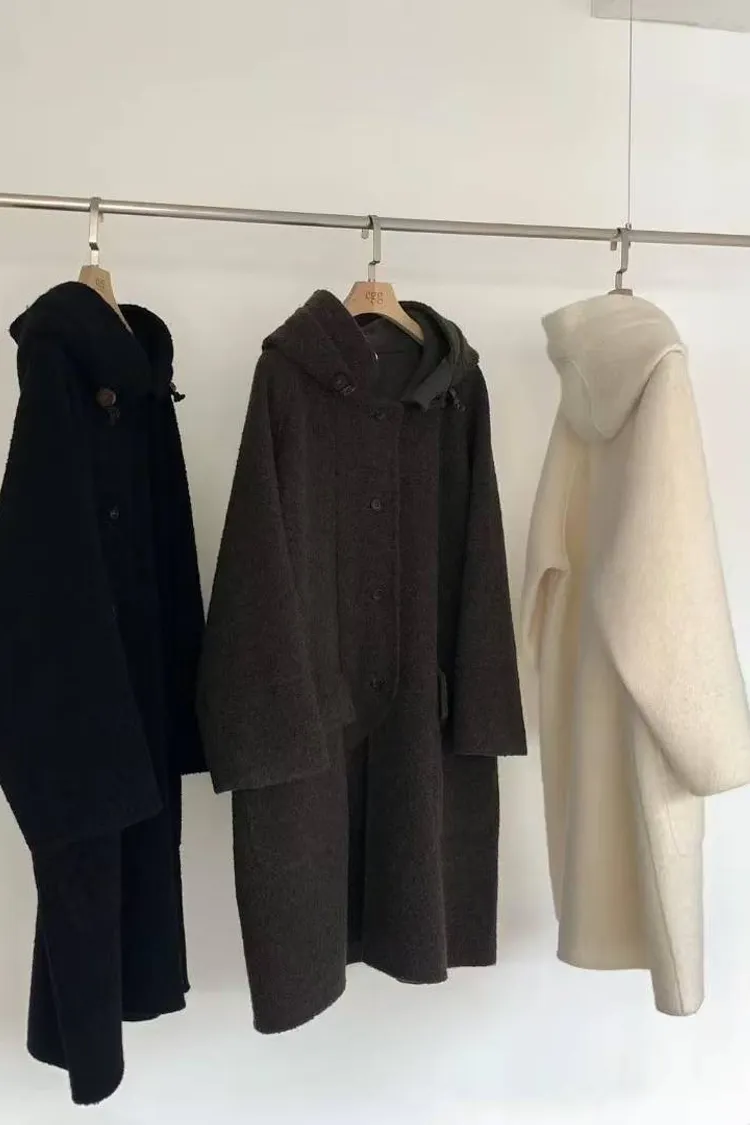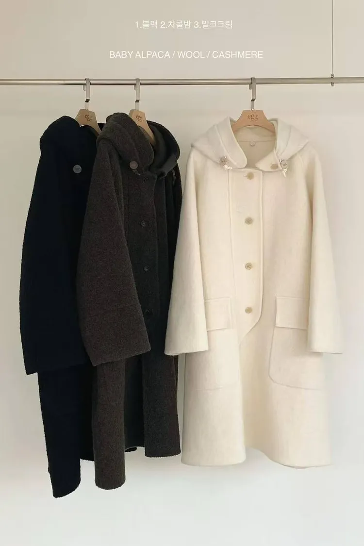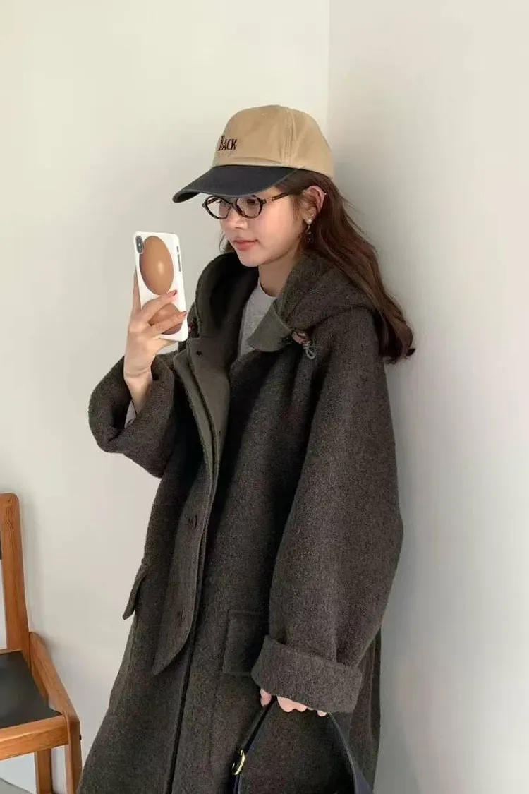 韓國連線款 羊駝毛連帽大衣外套 質感羊毛大衣外套