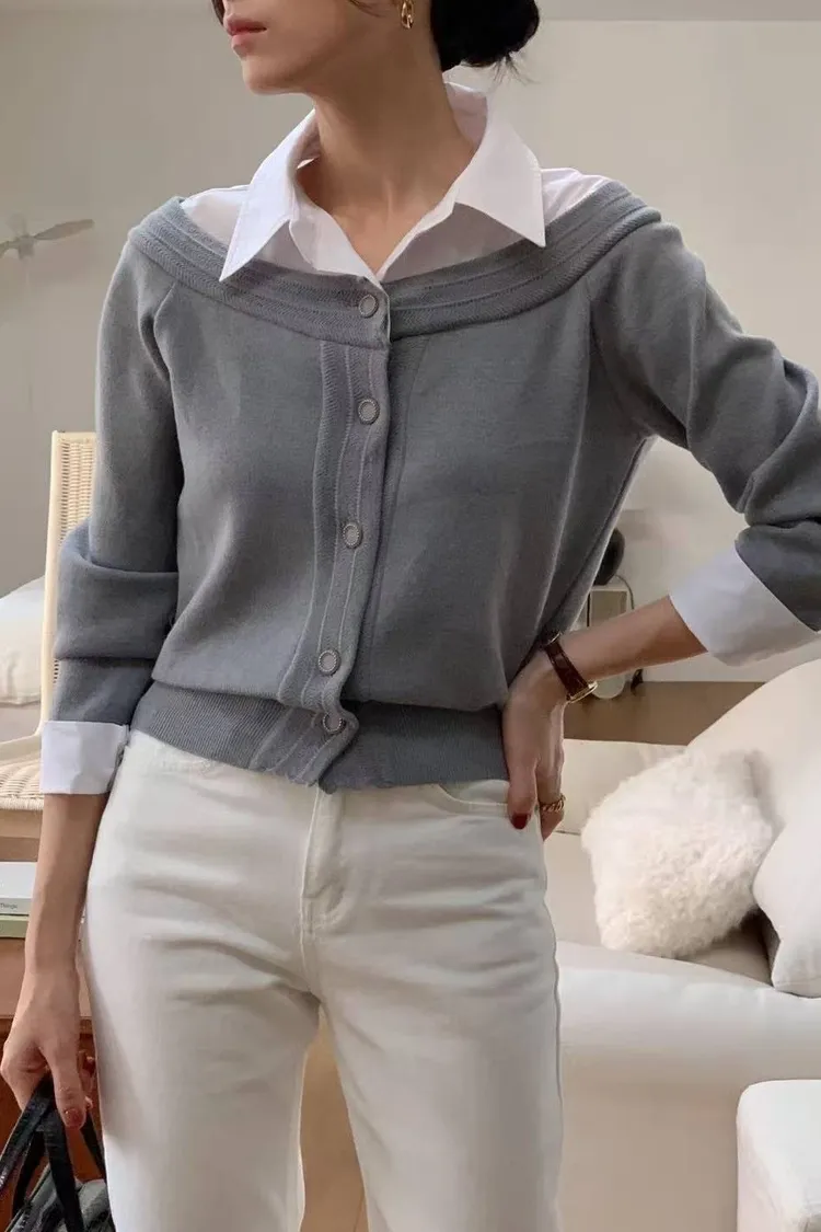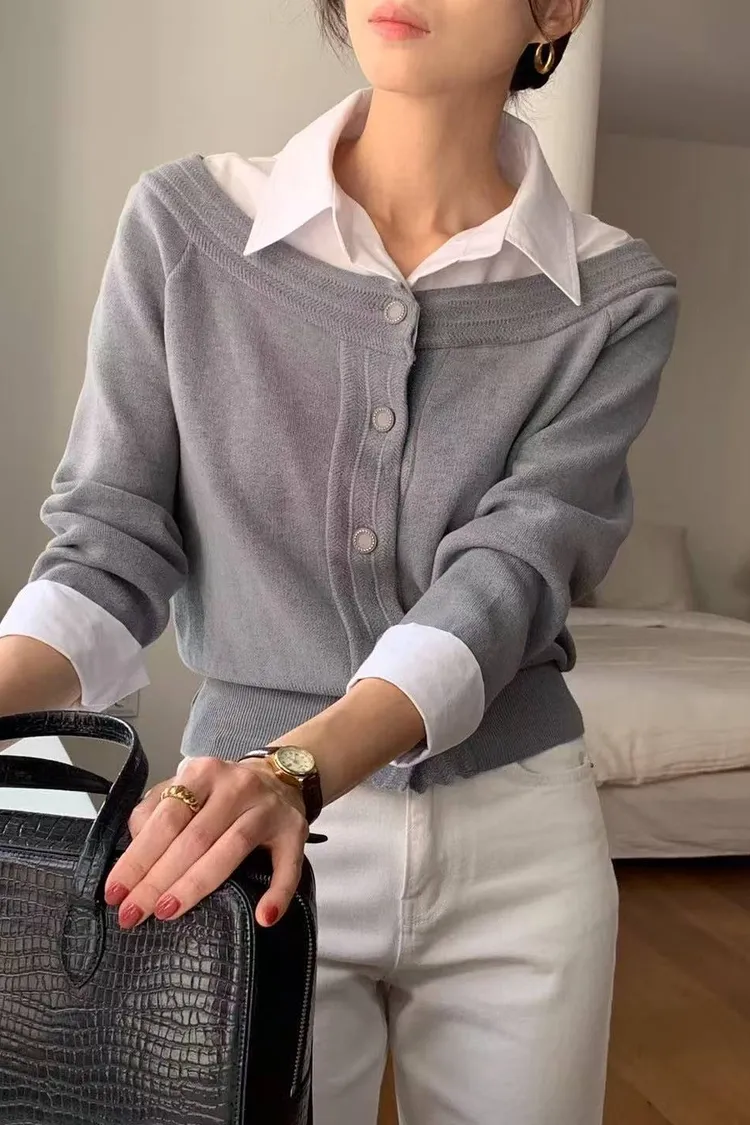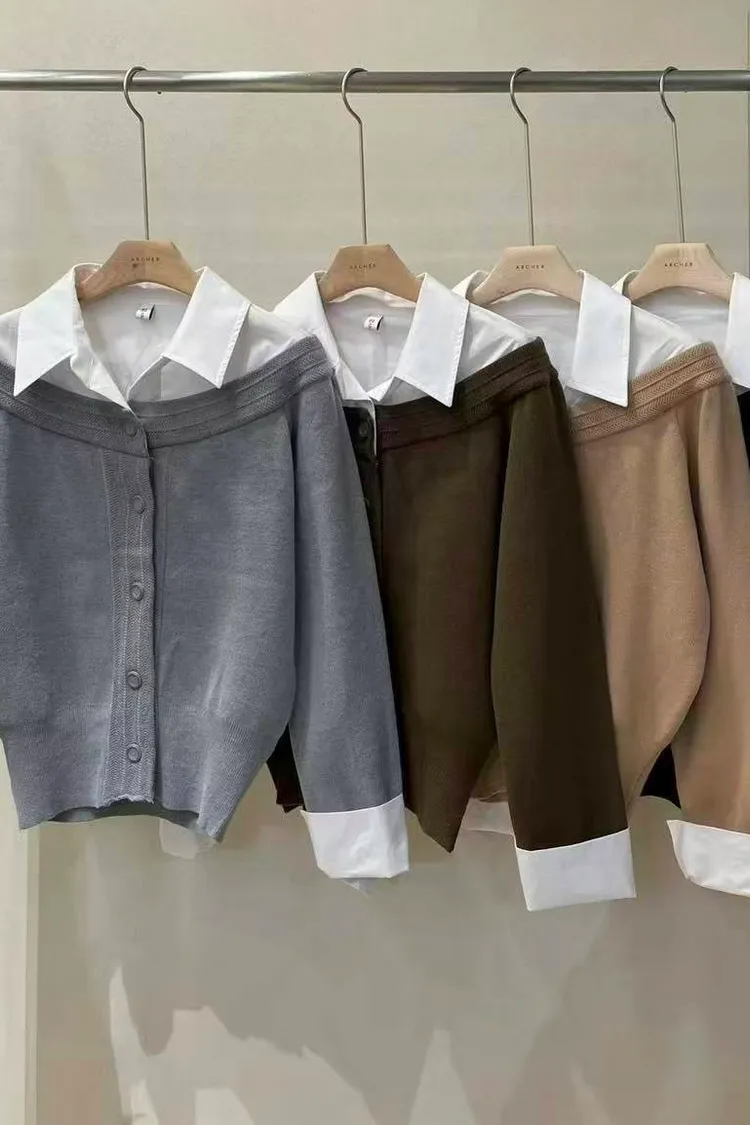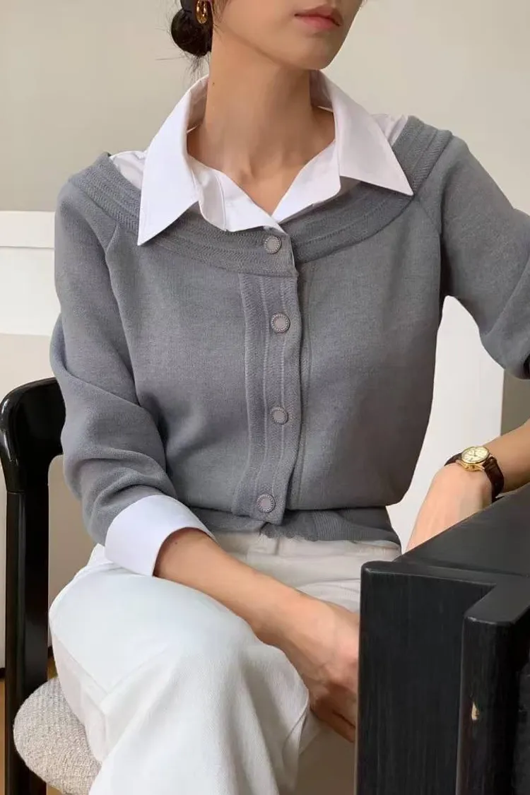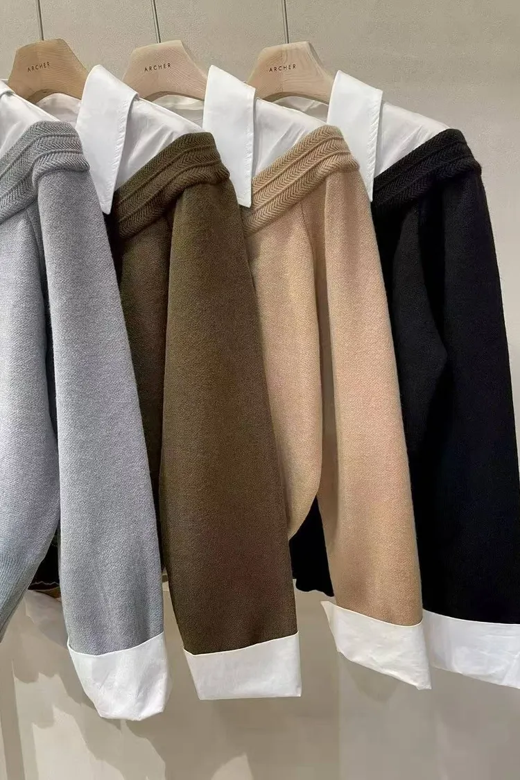 韓國代購 氣質翻領假兩件拼色針織衫 設計師款針織毛衣